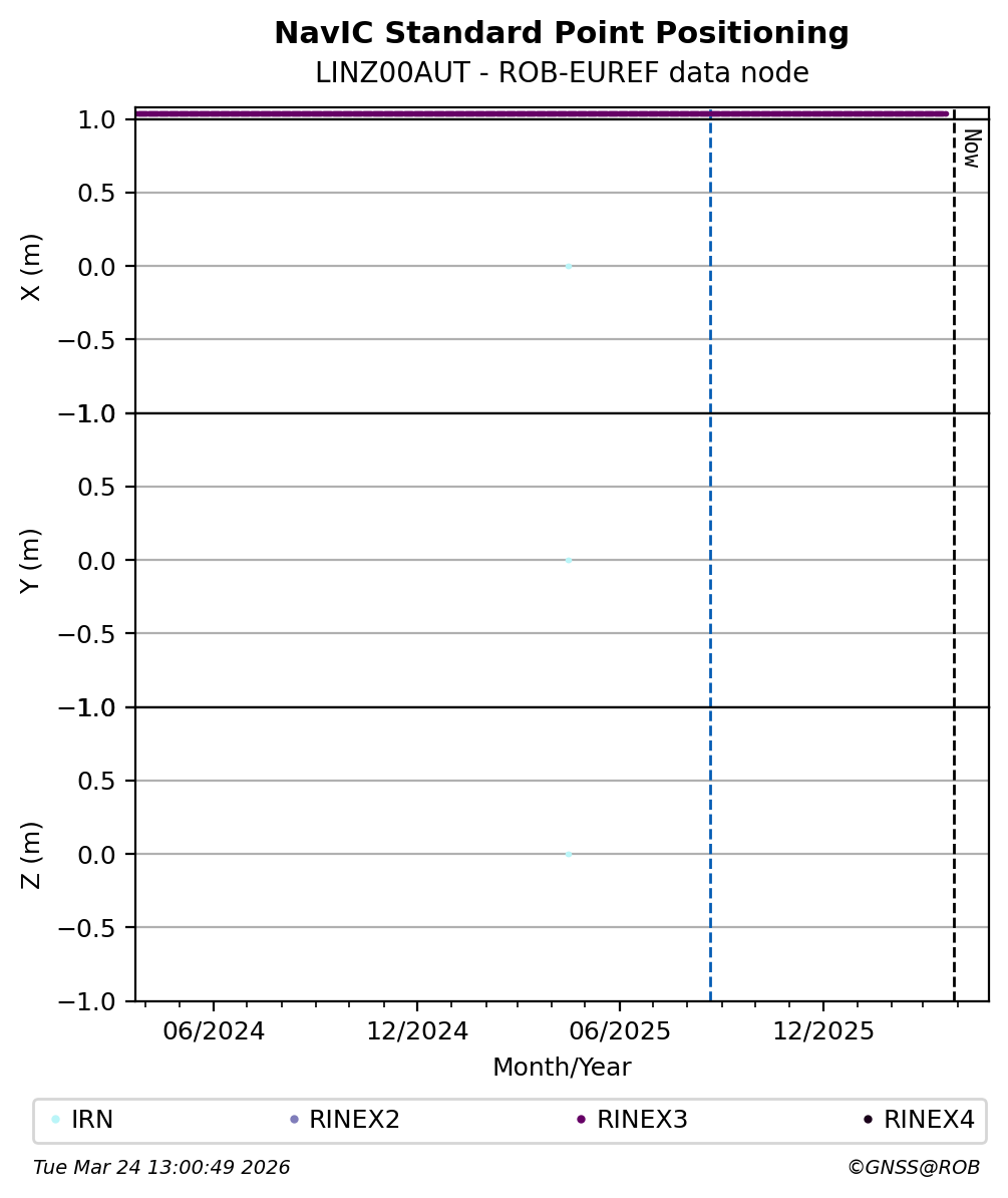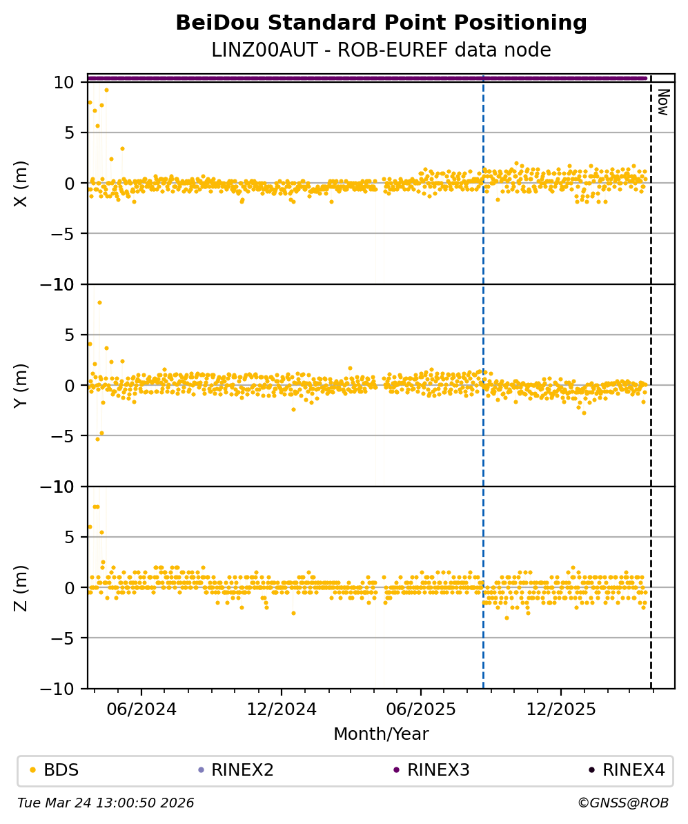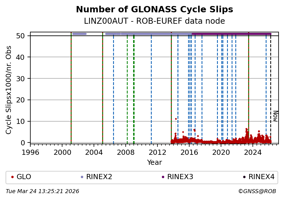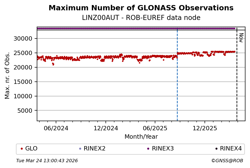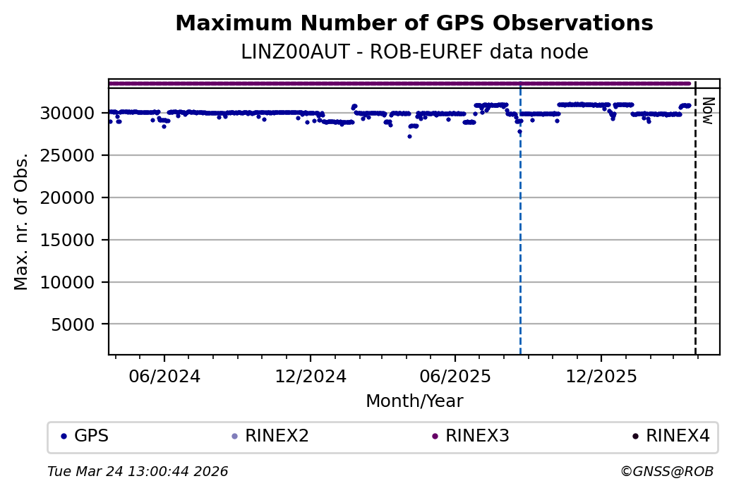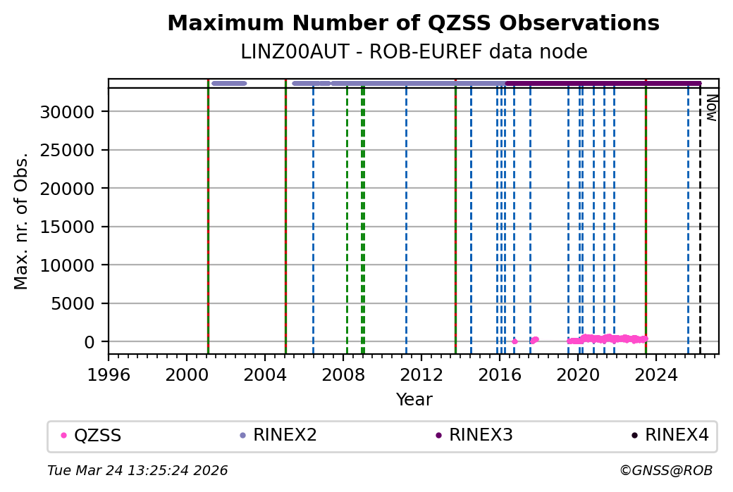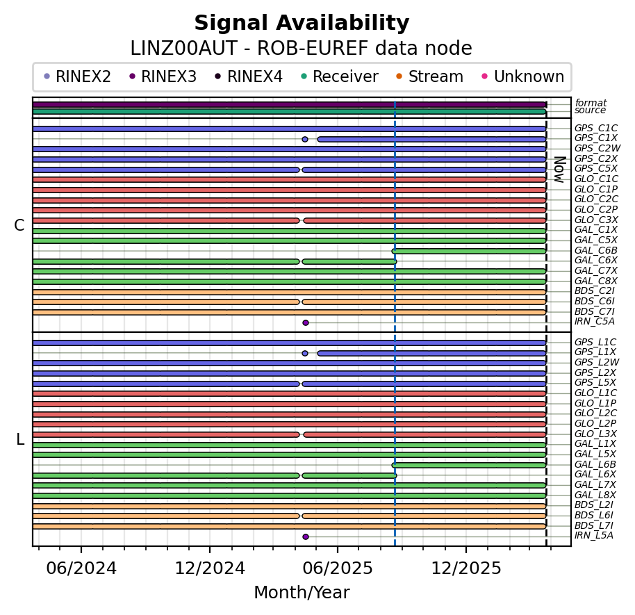 The plots below present the long-term tracking performance of the EPOS-GNSS station LINZ00AUT based on the daily RINEX data available from the ROB-EUREF EPOS-GNSS data node. The data quality metrics have been computed at the data node using the G-Nut/Anubis software.