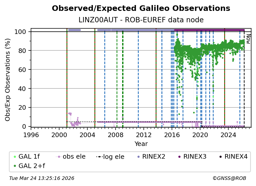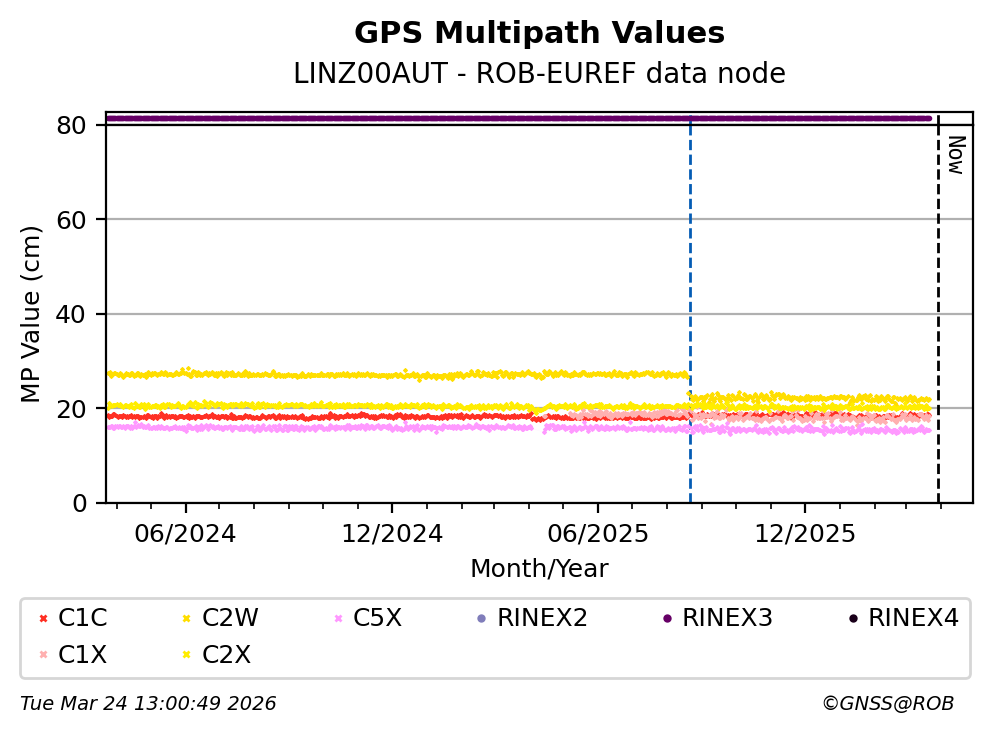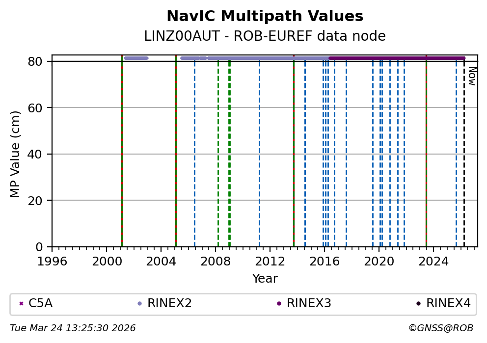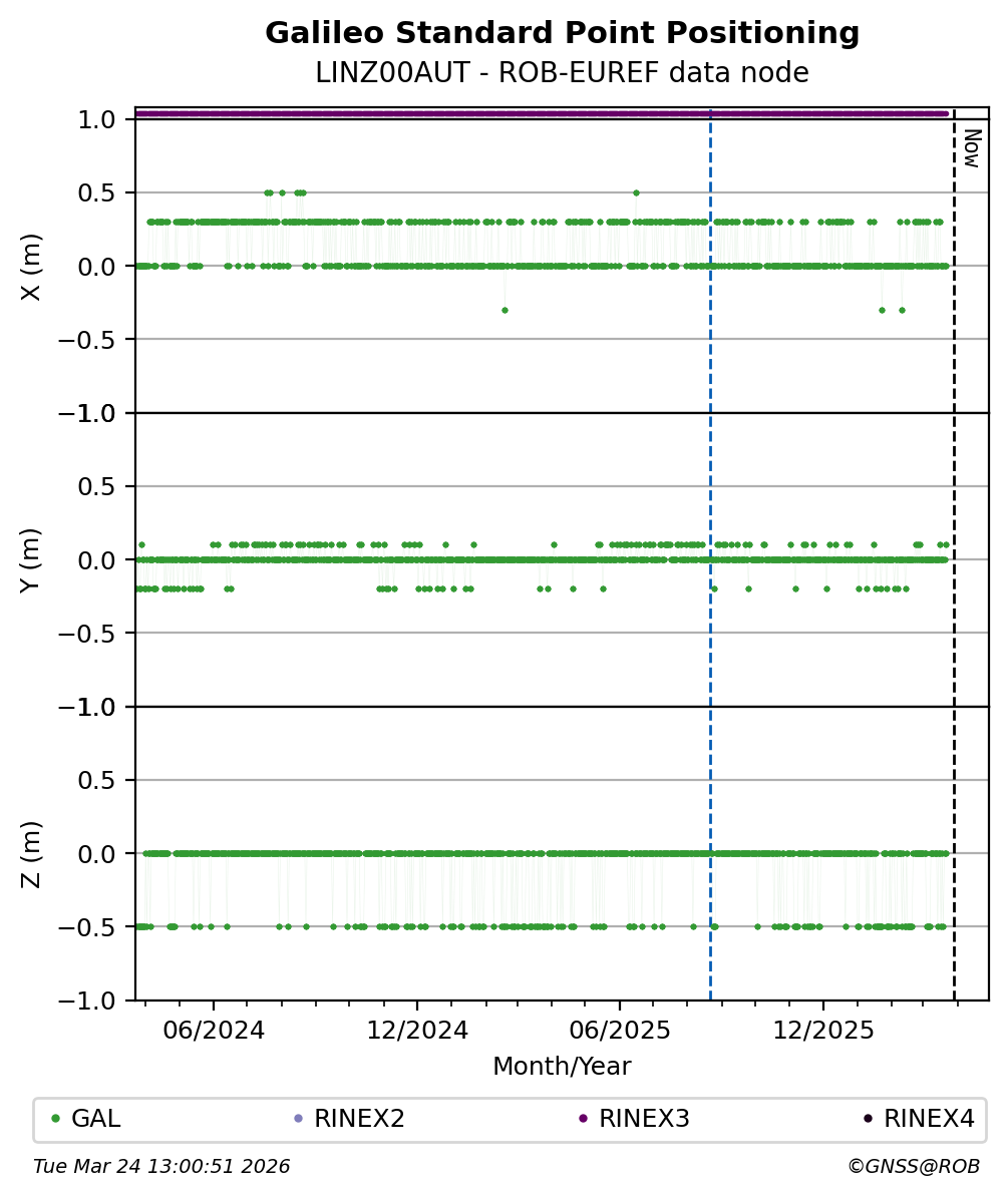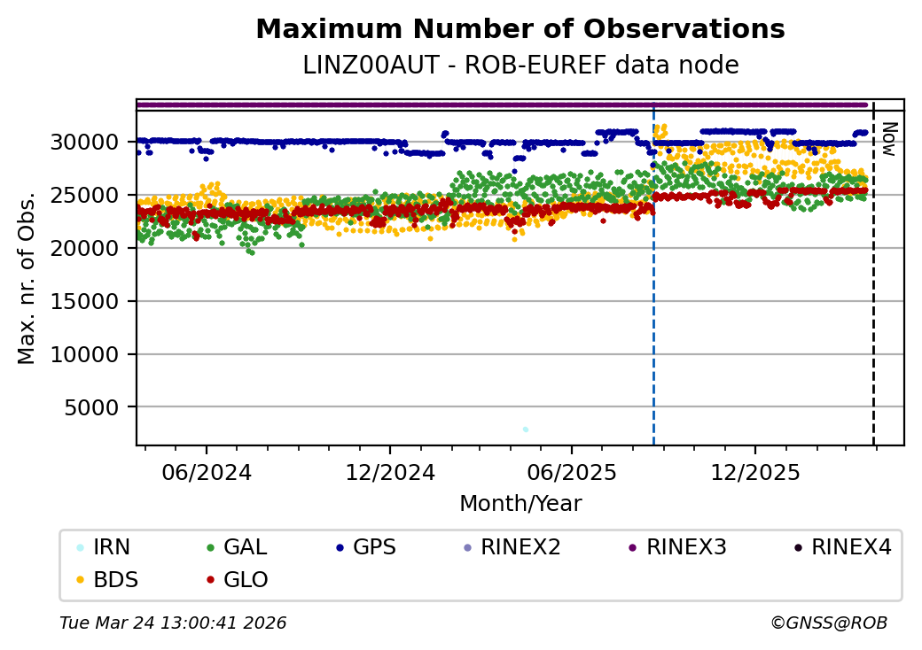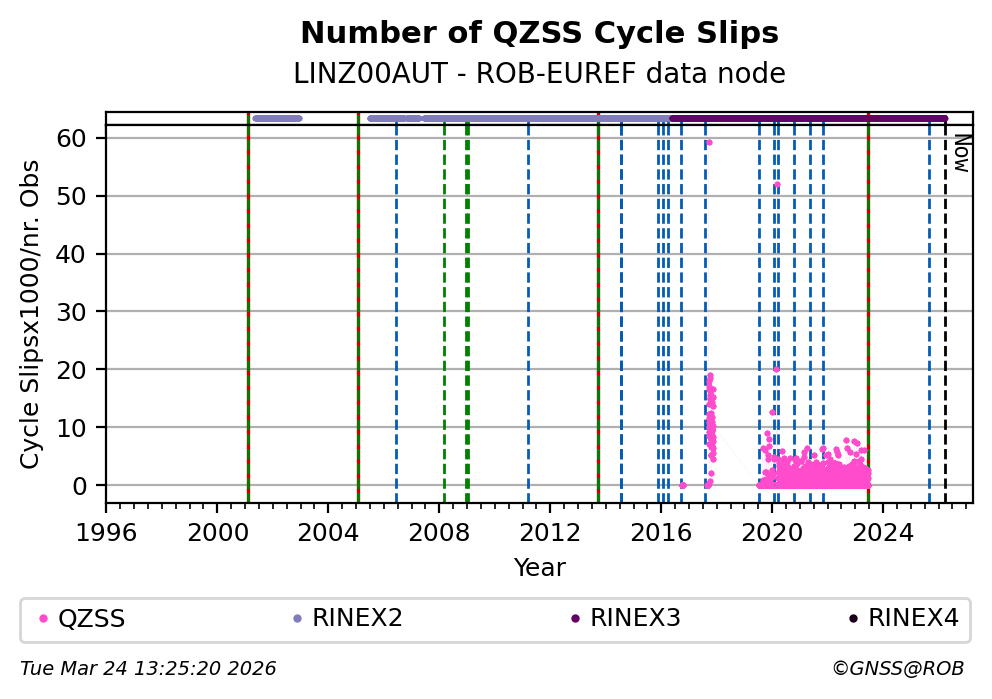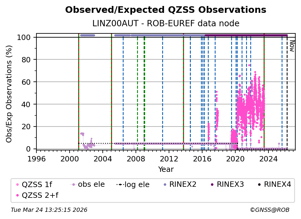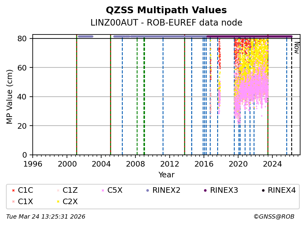 The plots below present the long-term tracking performance of the EPOS-GNSS station LINZ00AUT based on the daily RINEX data available from the ROB-EUREF EPOS-GNSS data node. The data quality metrics have been computed at the data node using the G-Nut/Anubis software.