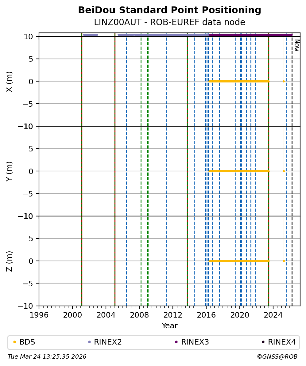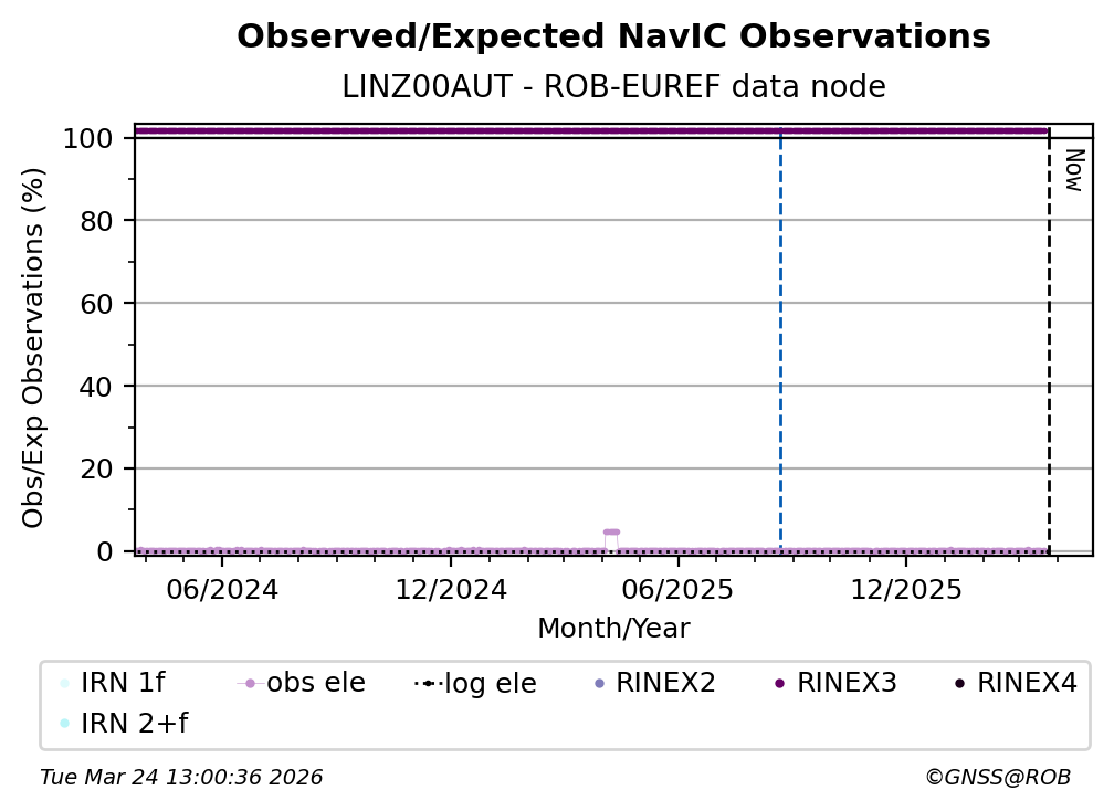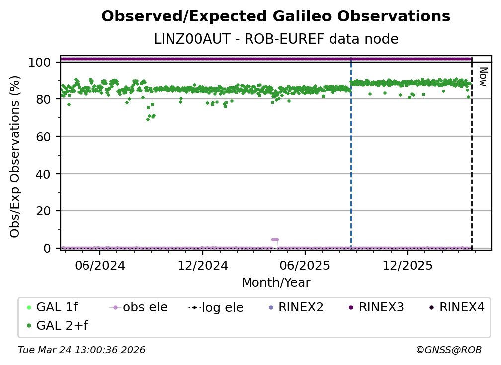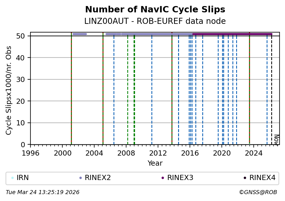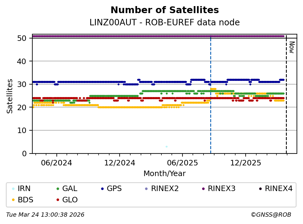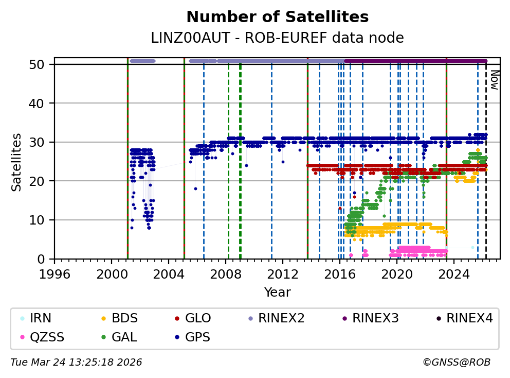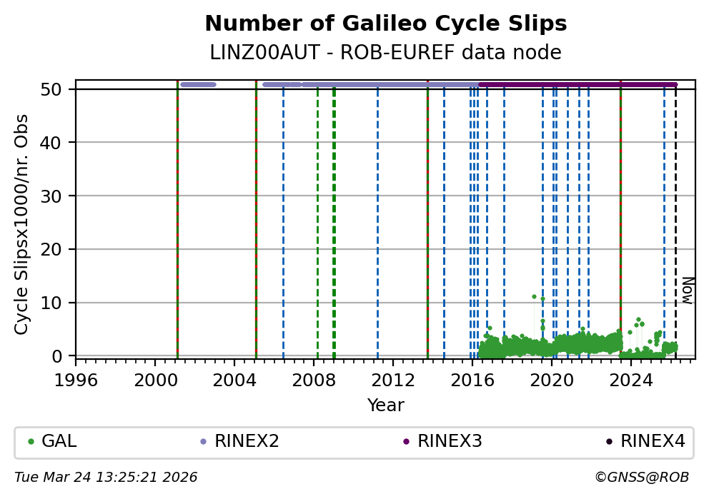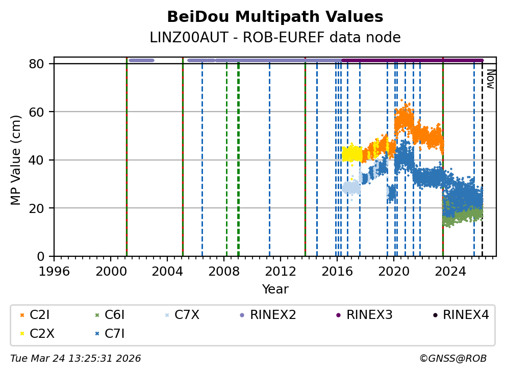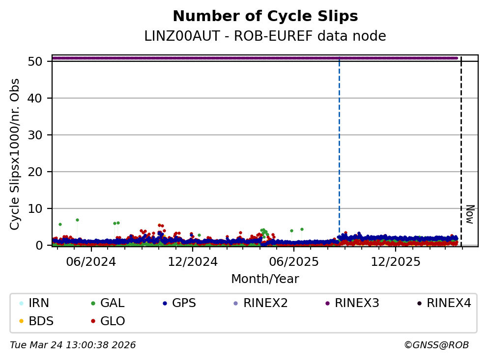 The plots below present the long-term tracking performance of the EPOS-GNSS station LINZ00AUT based on the daily RINEX data available from the ROB-EUREF EPOS-GNSS data node. The data quality metrics have been computed at the data node using the G-Nut/Anubis software.