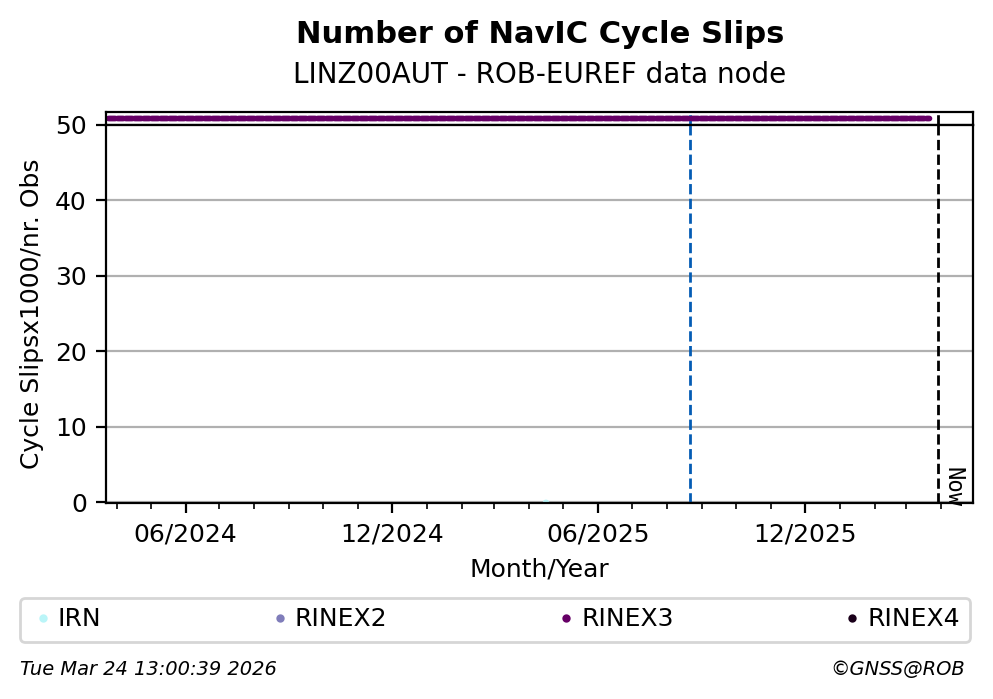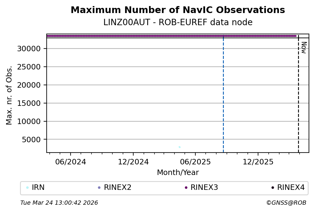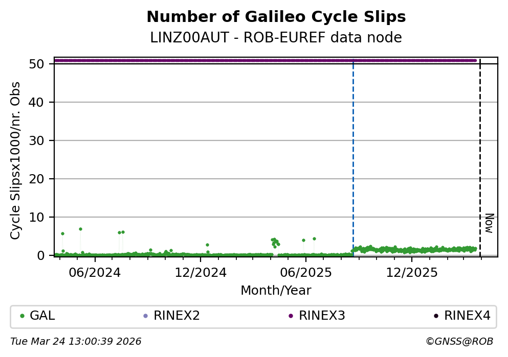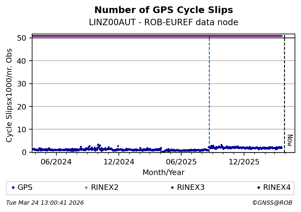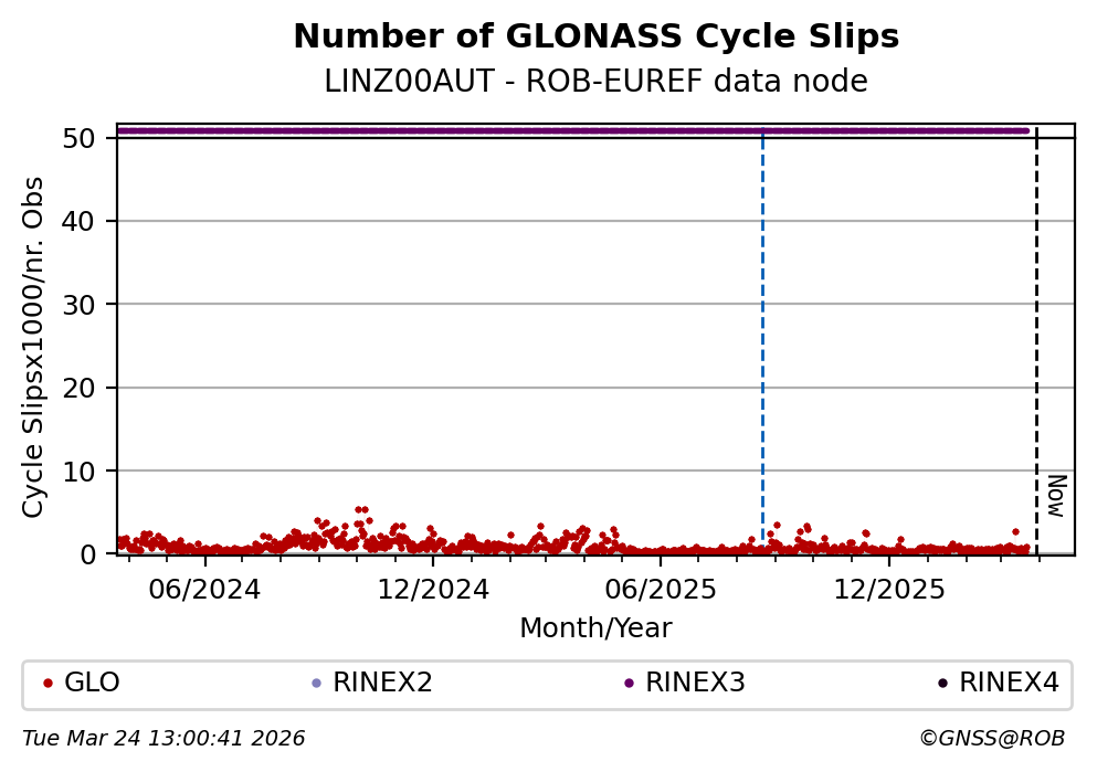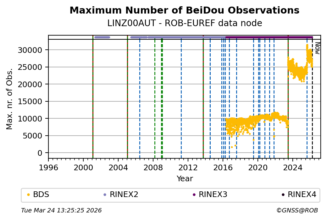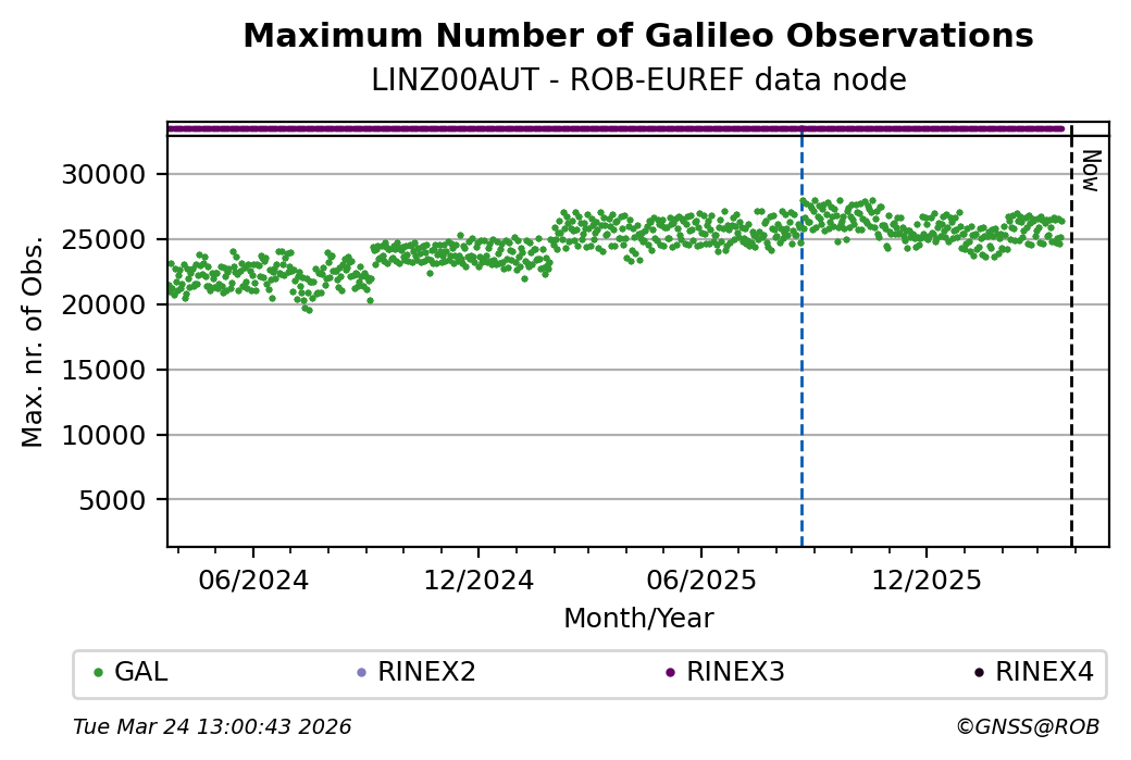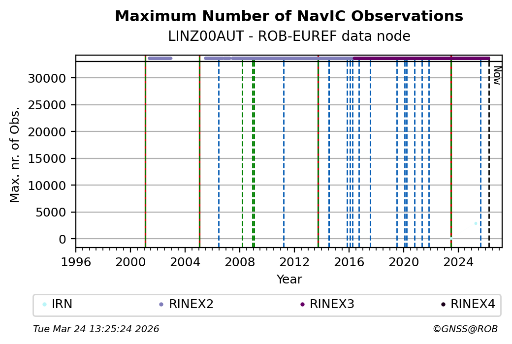 The plots below present the long-term tracking performance of the EPOS-GNSS station LINZ00AUT based on the daily RINEX data available from the ROB-EUREF EPOS-GNSS data node. The data quality metrics have been computed at the data node using the G-Nut/Anubis software.