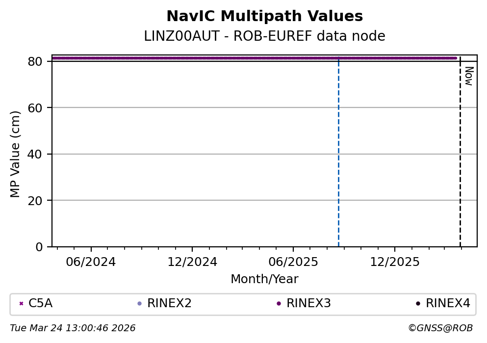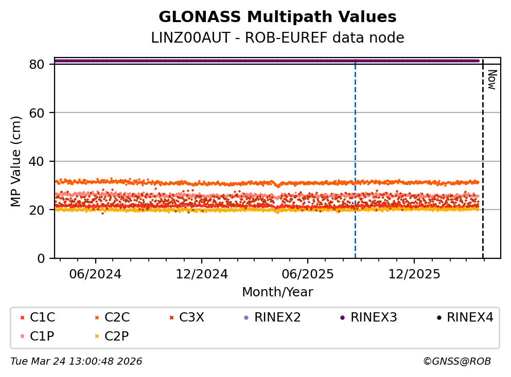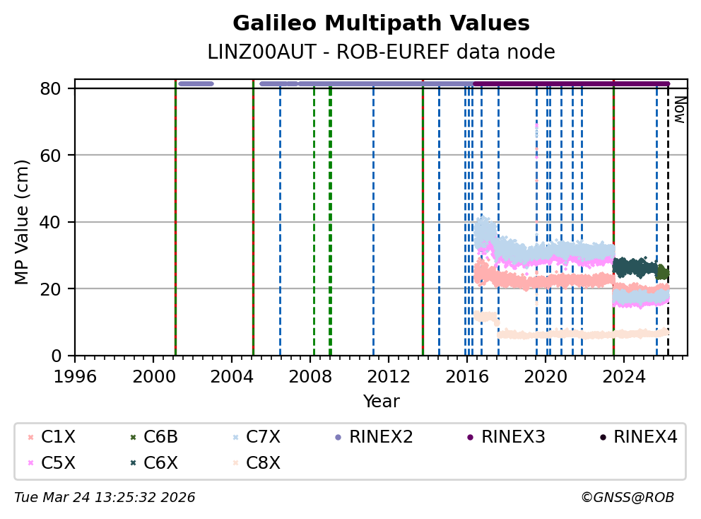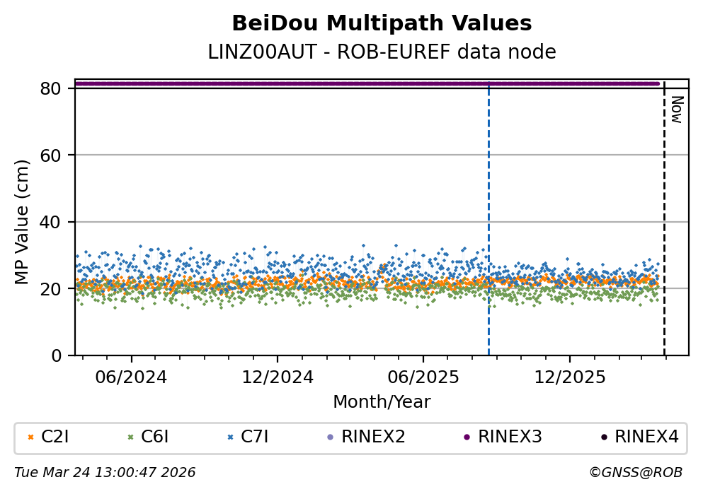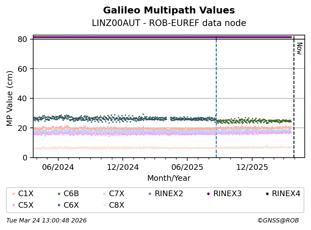 These plots display the daily mean of code multipath per frequency band and satellite constellation. Code multipath statistics are calculated for all pseudorange codes of all GNSS satellites providing dual-frequency carrier-phase observations. The code multipath characterizes the quality of the observed signal and the site environment.