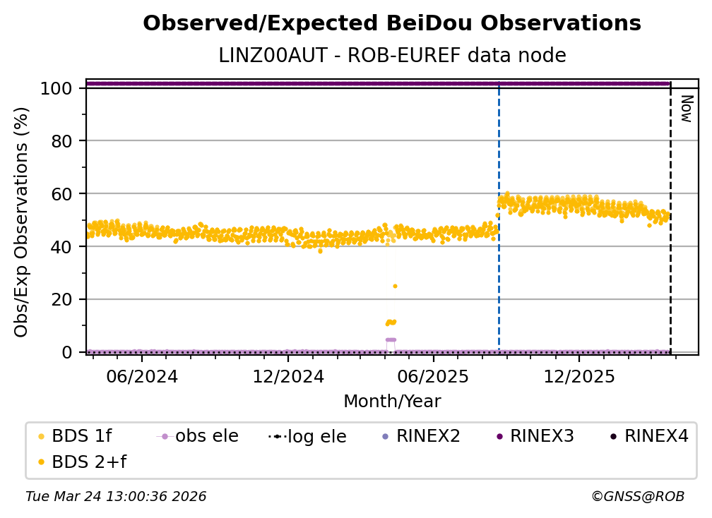 The percentage corresponds, for each constellation tracked by the station, to the ratio of the number of observations in the daily RINEX file with respect to the number of expected observations: