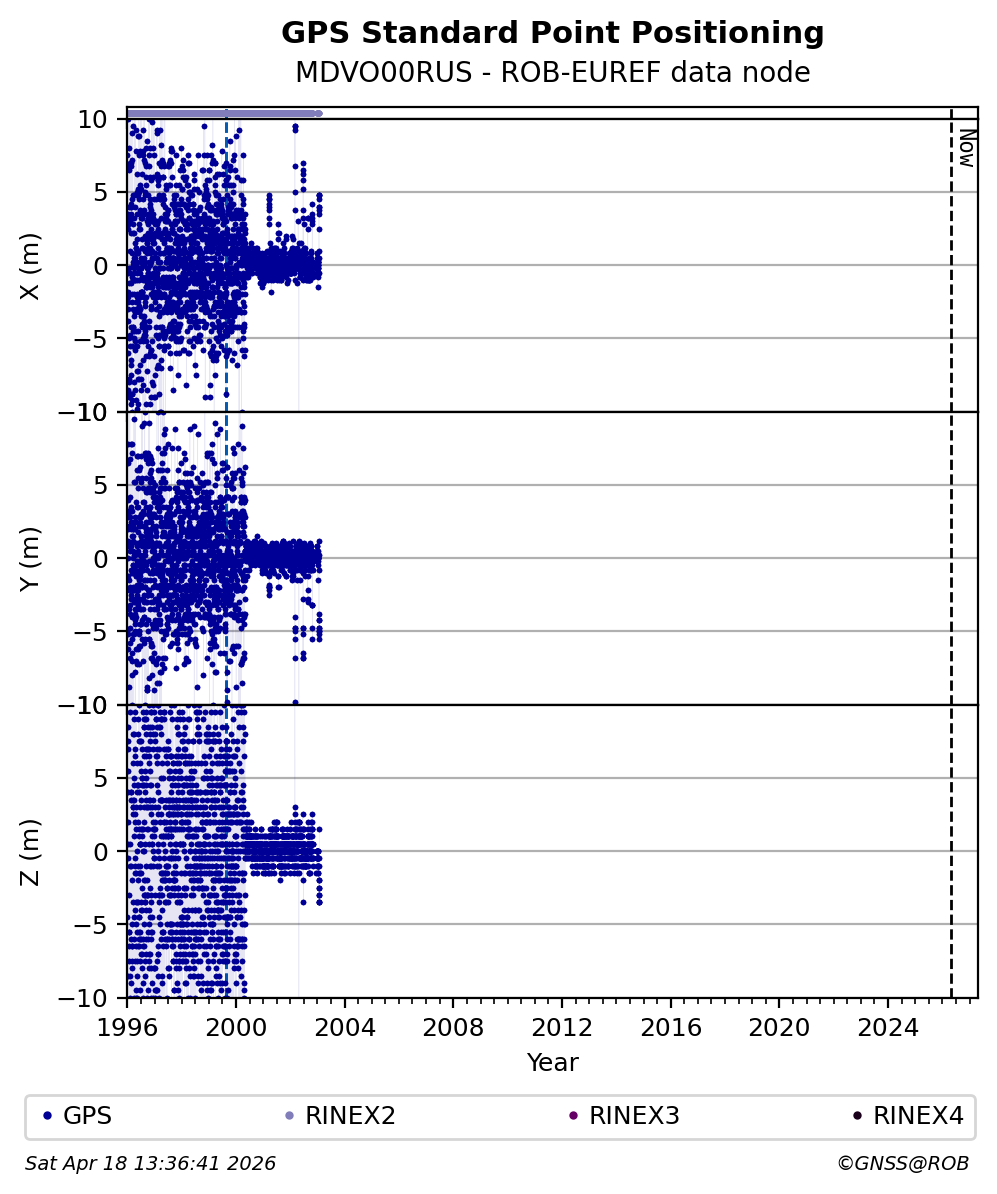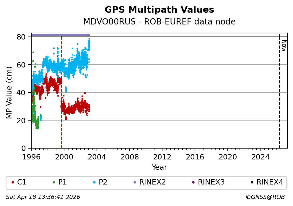 Red vertical lines, green and blue vertical dotted lines indicate respectively a change of antenna, receiver or receiver configuration (including firmware) as indicated by the station manager in the station site log available from the M3G GNSS Metadata Catalog. The purple points in the top of the plot indicate the daily RINEX data availability at the data node.