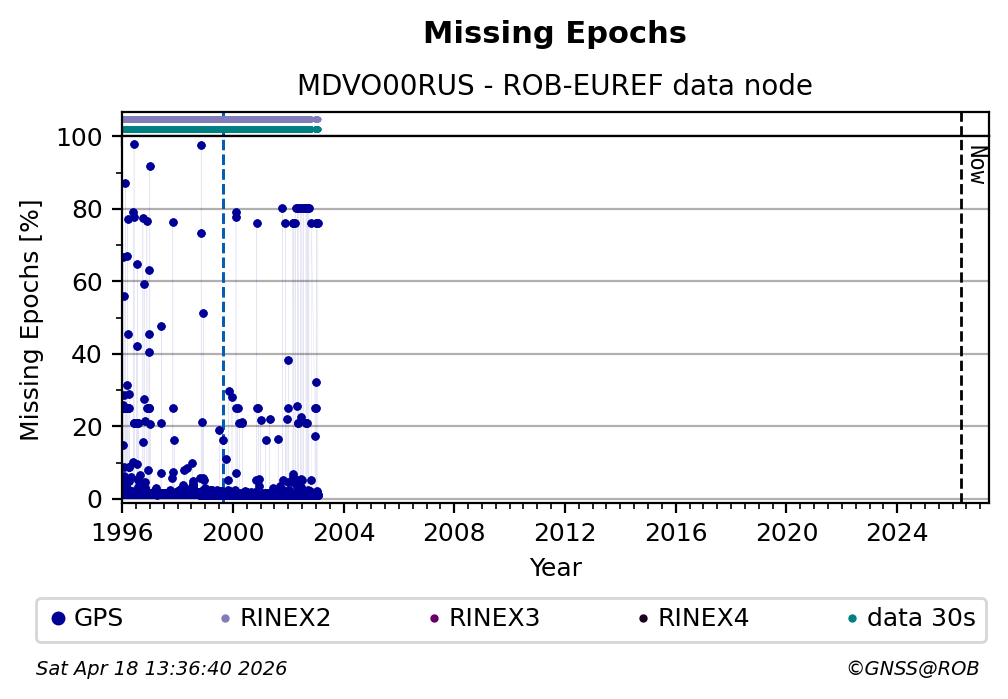 The percentage corresponds, for each constellation tracked by the station, to the ratio of the number of observations in the daily RINEX file with respect to the number of expected observations: