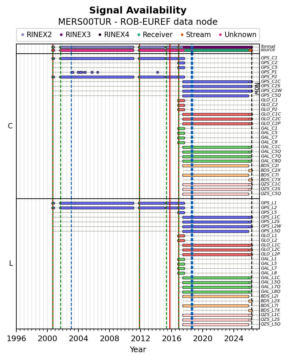 Red vertical lines, green and blue vertical dotted lines indicate respectively a change of antenna, receiver or receiver configuration (including firmware) as indicated by the station manager in the station site log available from the M3G GNSS Metadata Catalog. The purple points in the top of the plot indicate the daily RINEX data availability at the data node.