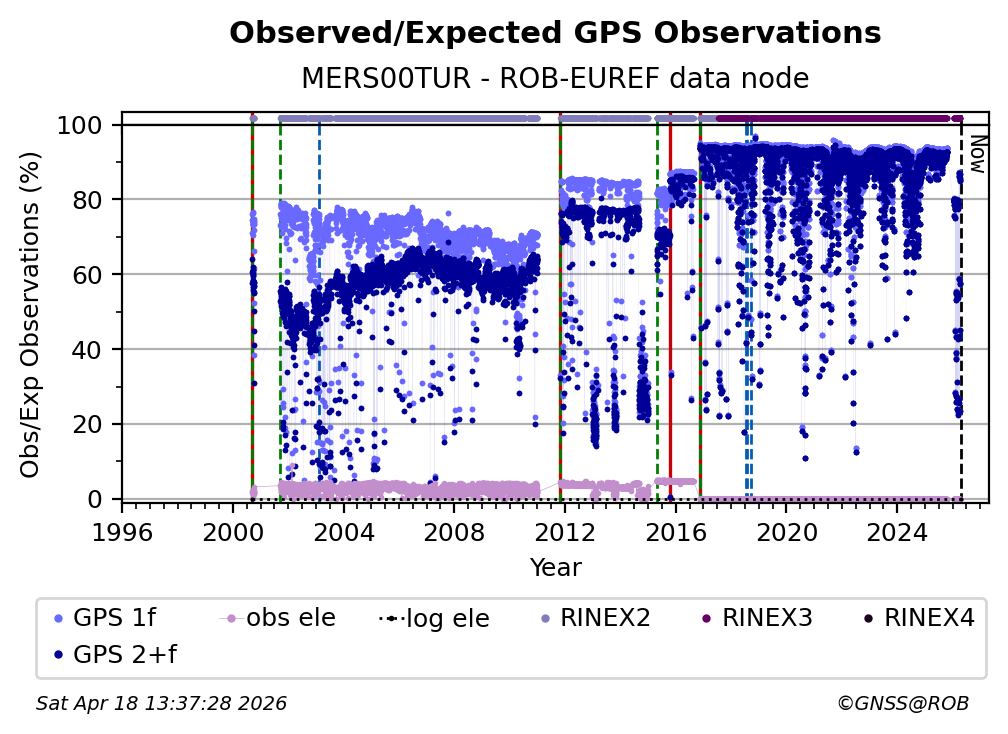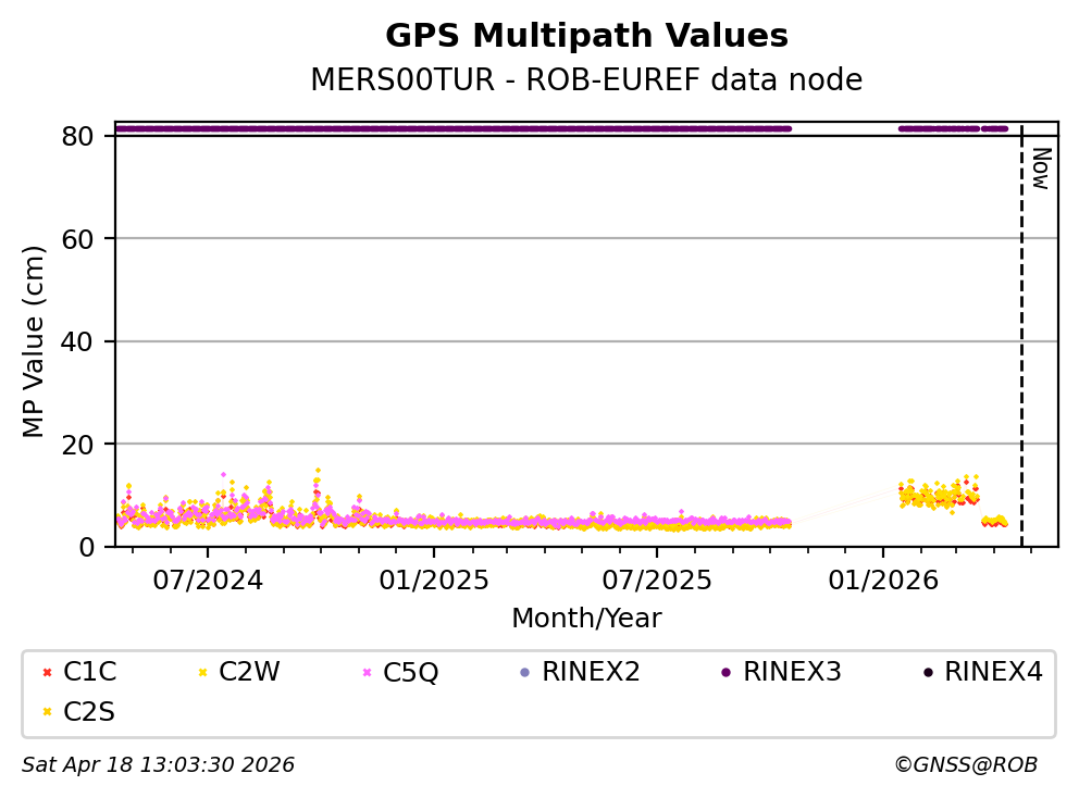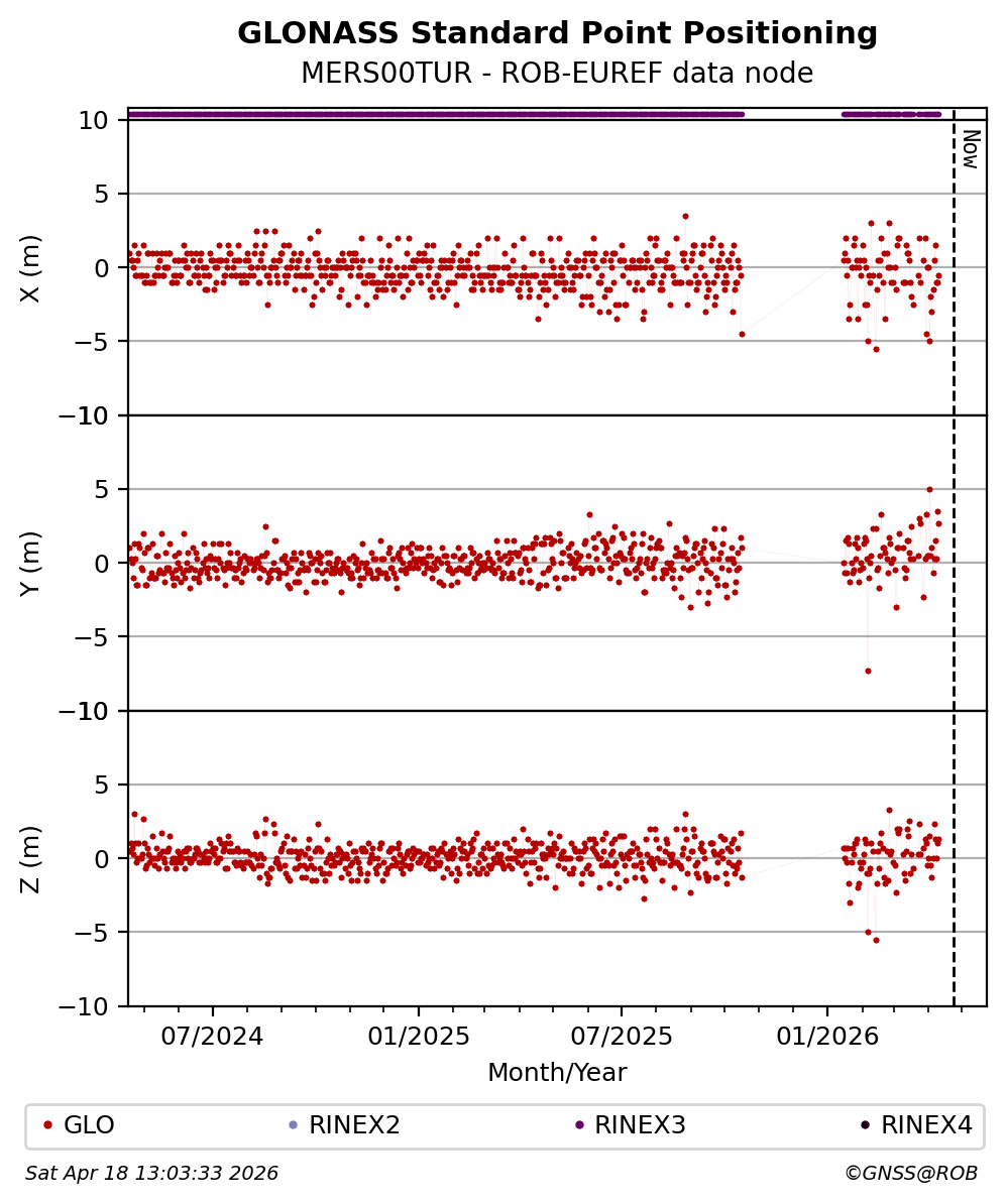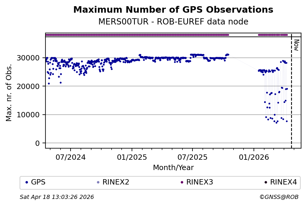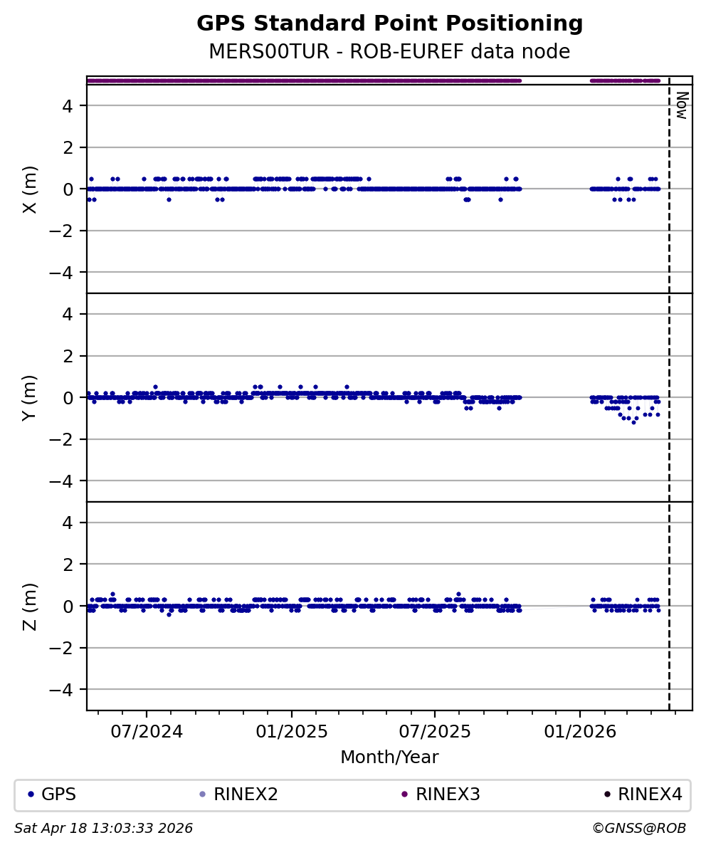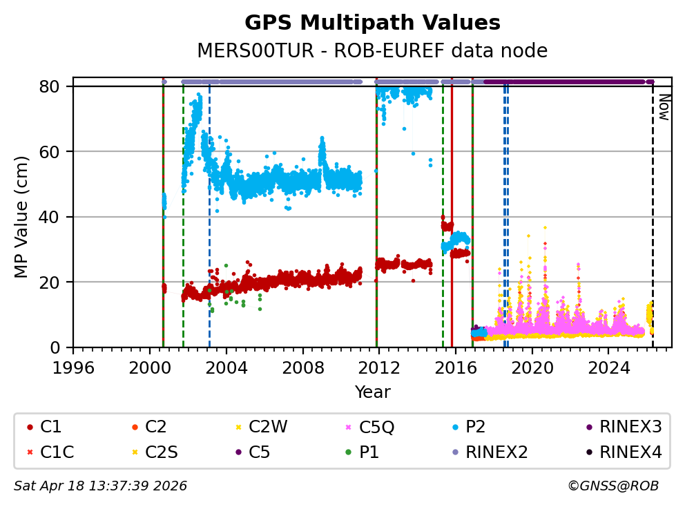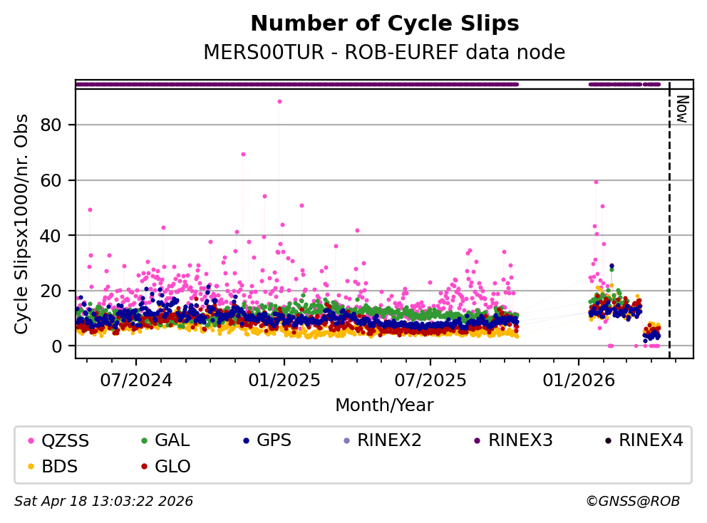 The plots below present the long-term tracking performance of the EPOS-GNSS station MERS00TUR based on the daily RINEX data available from the ROB-EUREF EPOS-GNSS data node. The data quality metrics have been computed at the data node using the G-Nut/Anubis software.