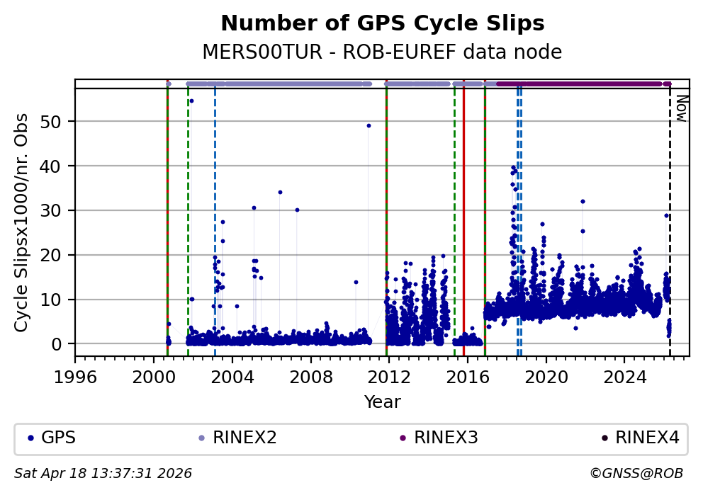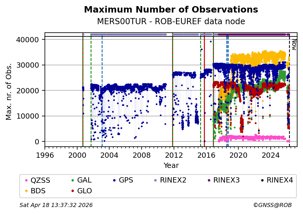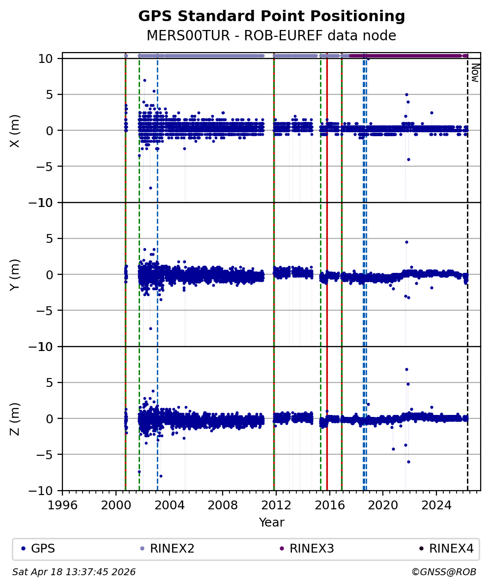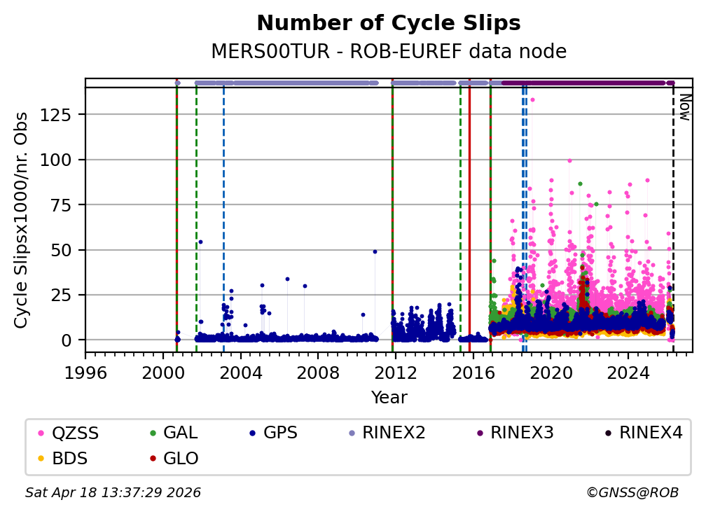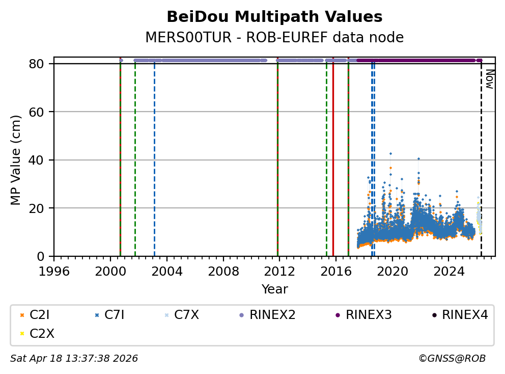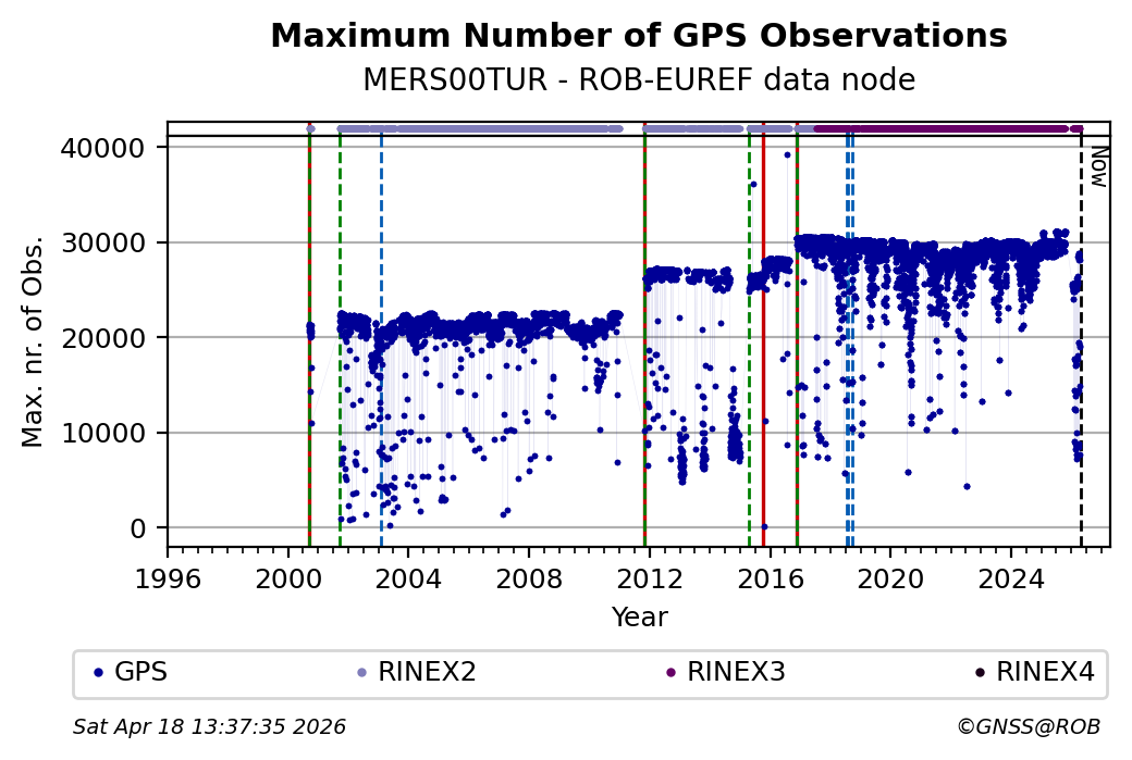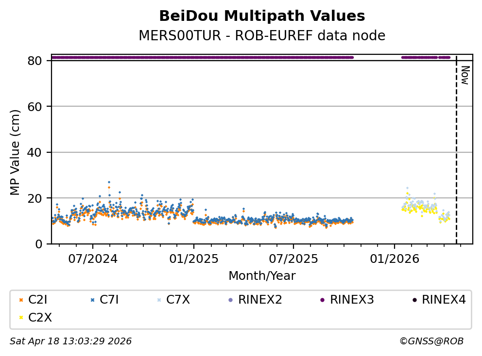 The plots below present the long-term tracking performance of the EPOS-GNSS station MERS00TUR based on the daily RINEX data available from the ROB-EUREF EPOS-GNSS data node. The data quality metrics have been computed at the data node using the G-Nut/Anubis software.