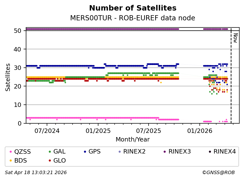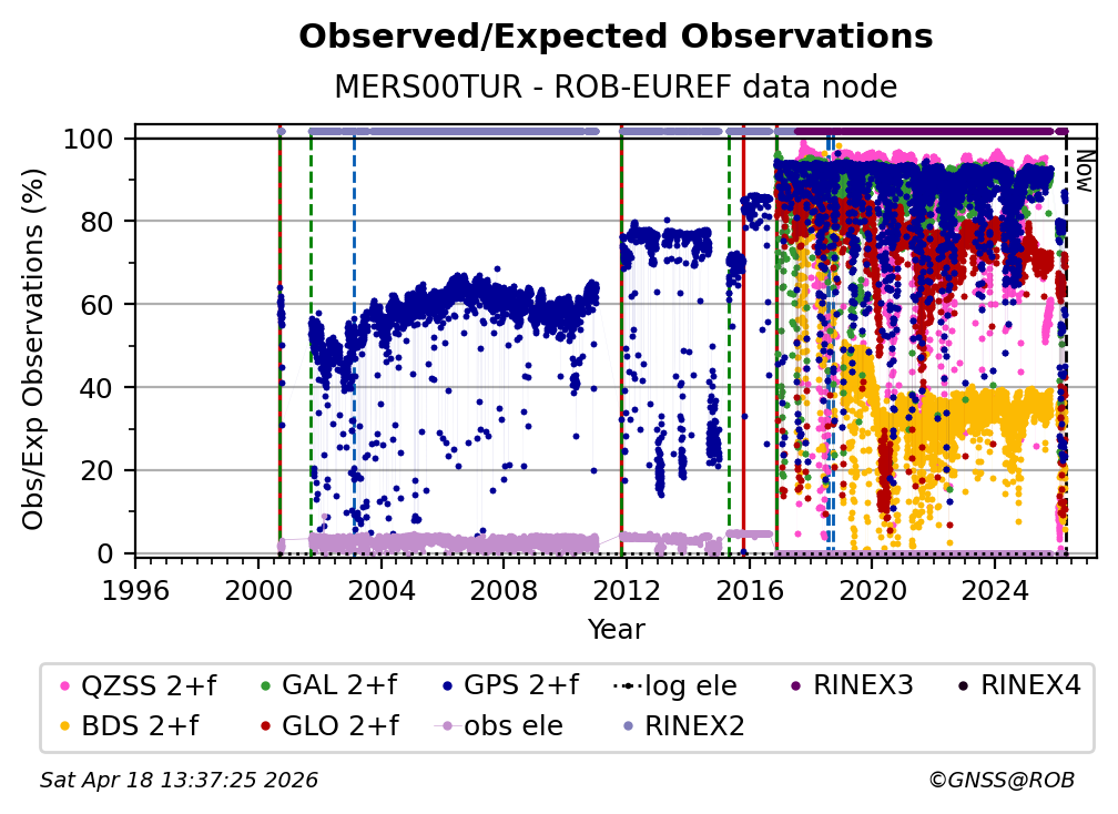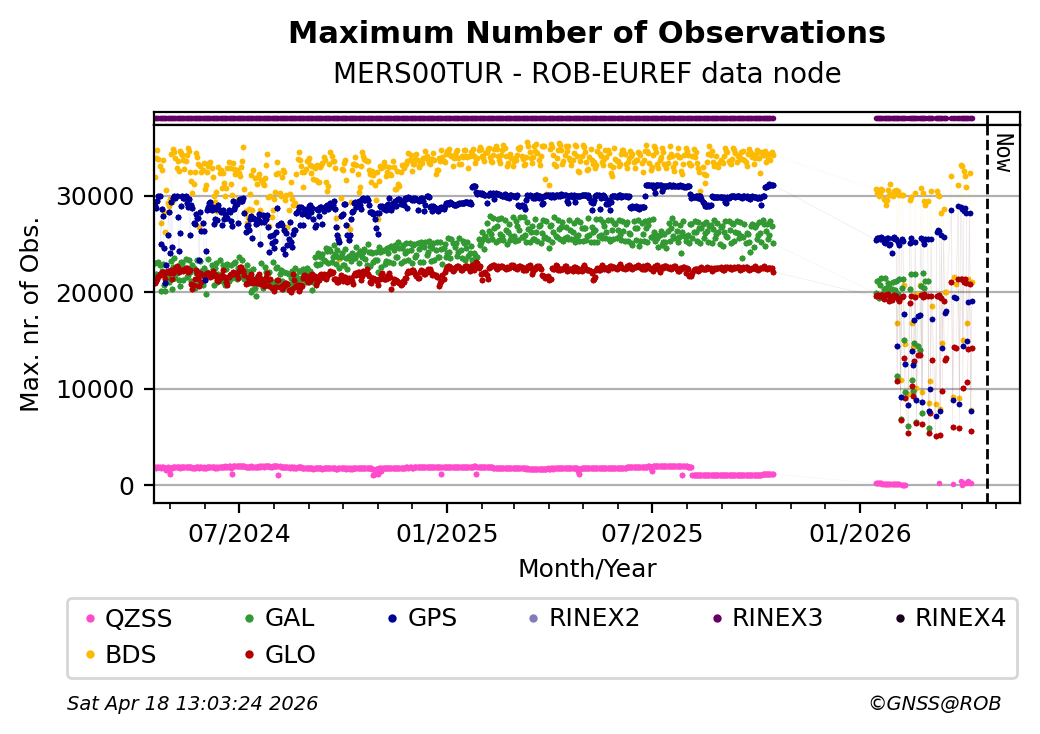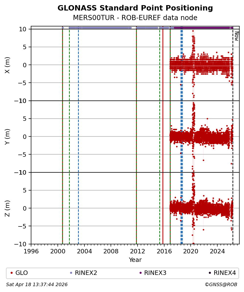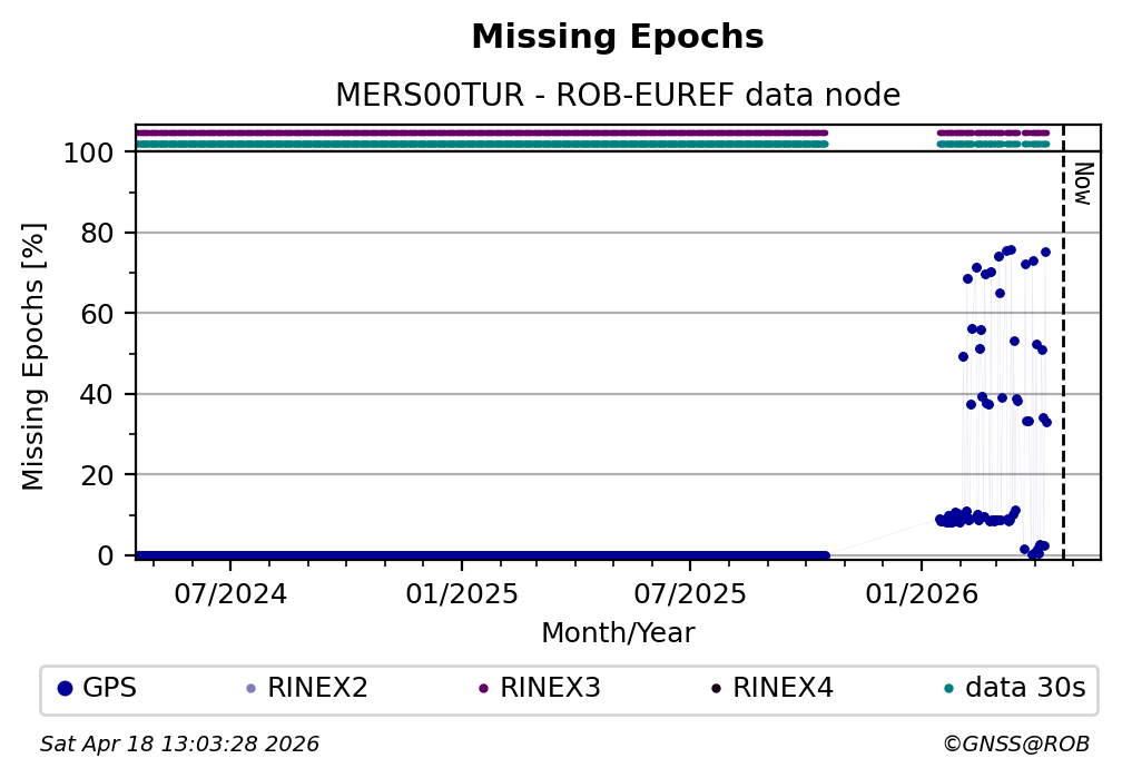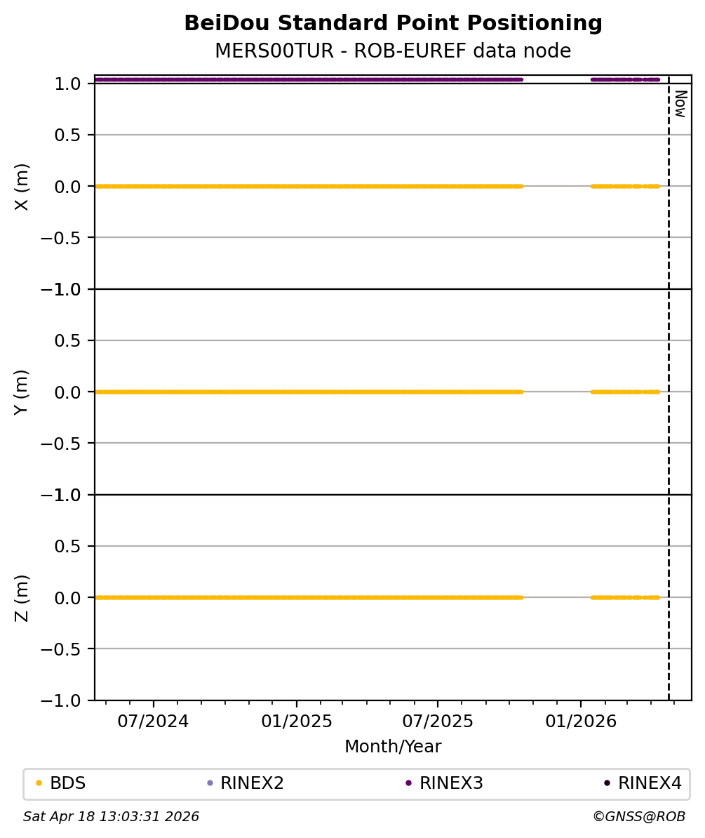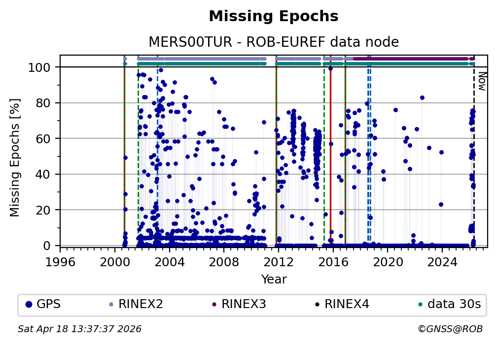 The plots below present the long-term tracking performance of the EPOS-GNSS station MERS00TUR based on the daily RINEX data available from the ROB-EUREF EPOS-GNSS data node. The data quality metrics have been computed at the data node using the G-Nut/Anubis software.
