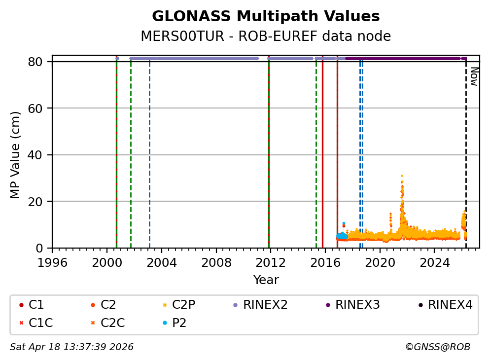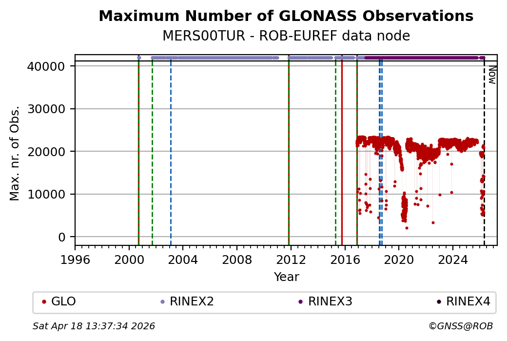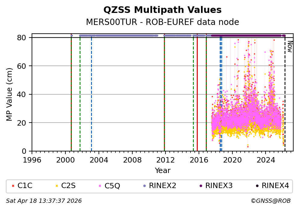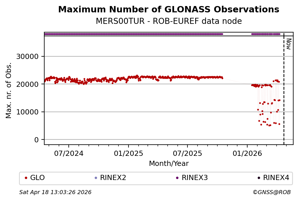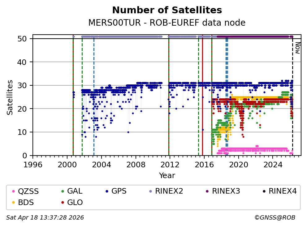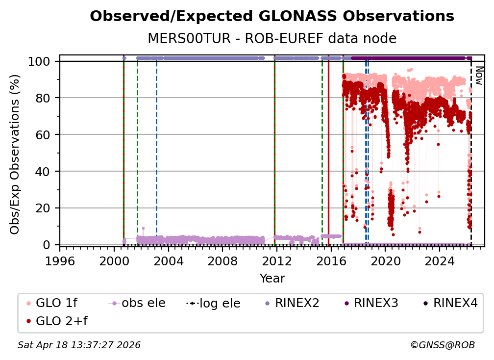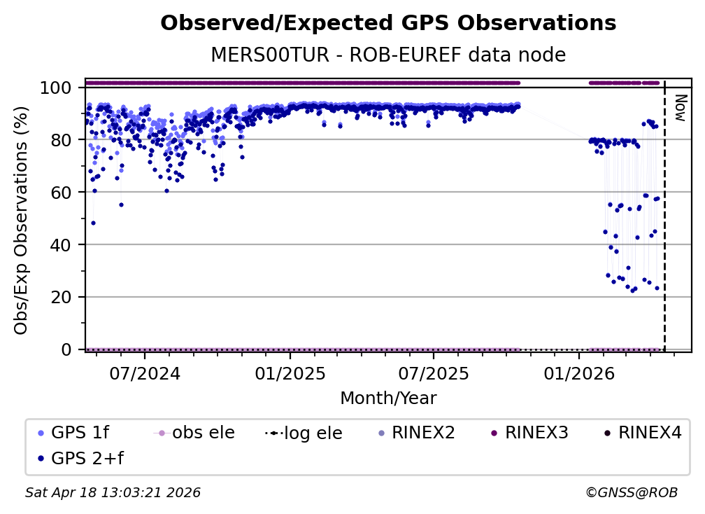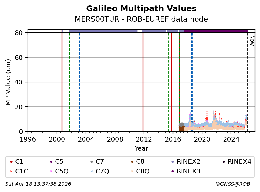The plots below present the long-term tracking performance of the EPOS-GNSS station MERS00TUR based on the daily RINEX data available from the ROB-EUREF EPOS-GNSS data node. The data quality metrics have been computed at the data node using the G-Nut/Anubis software.