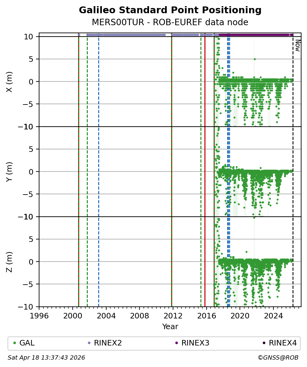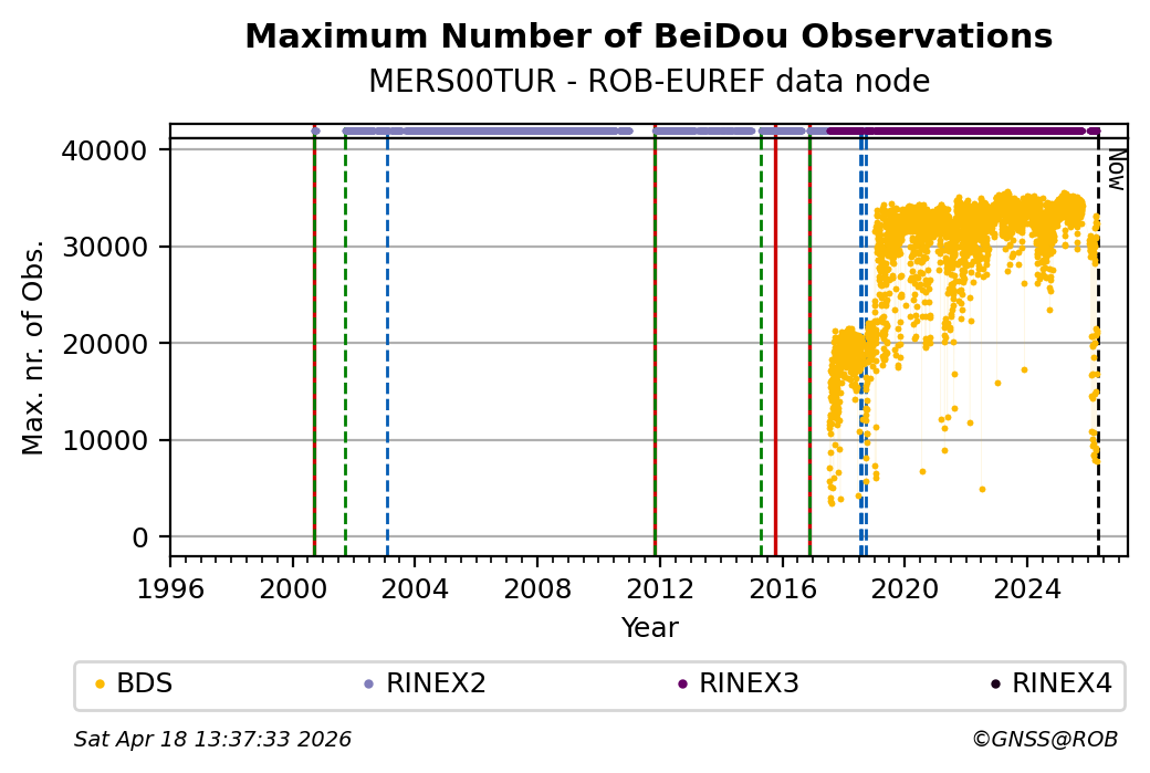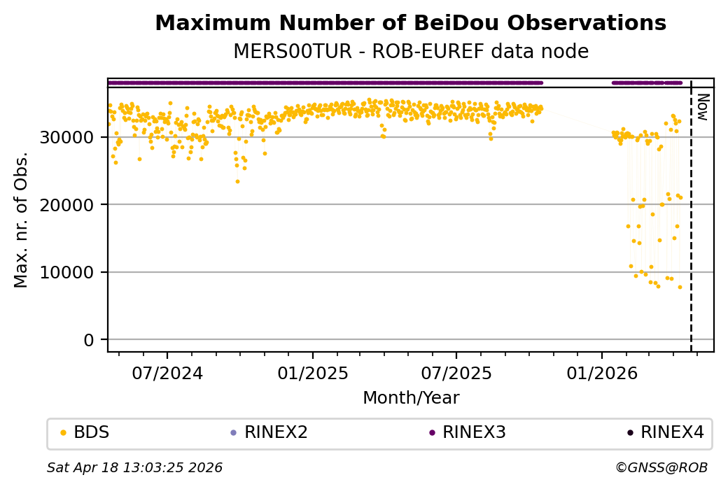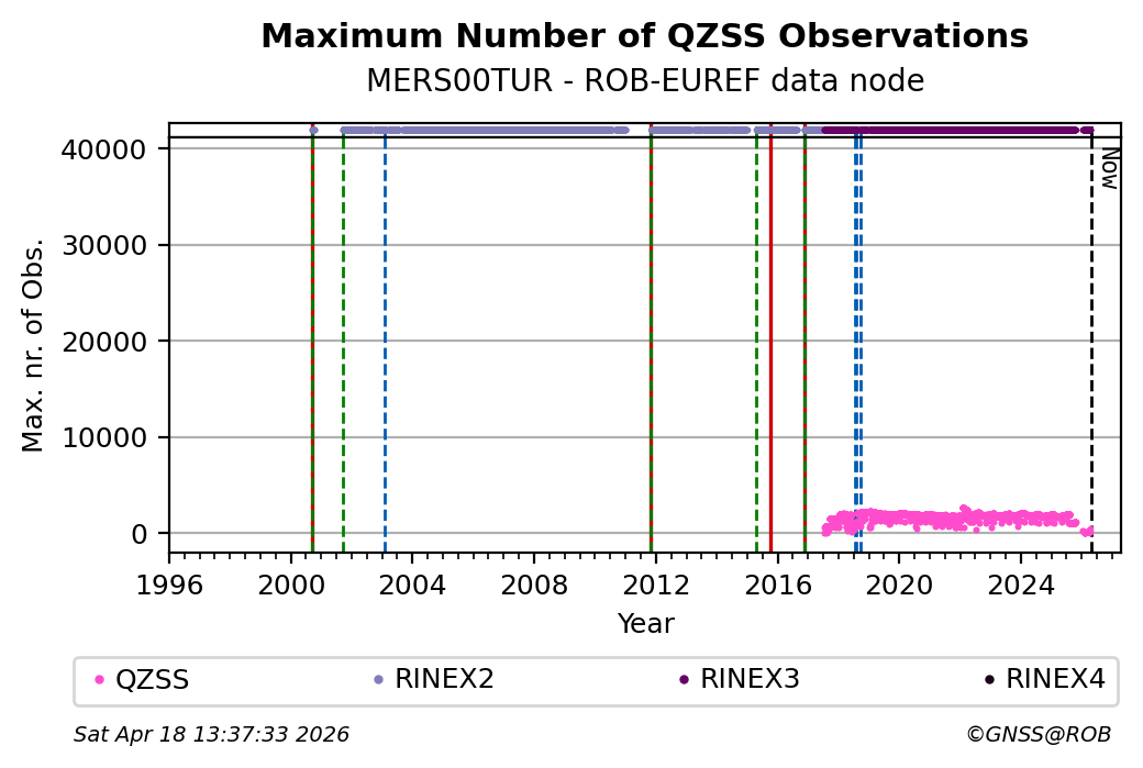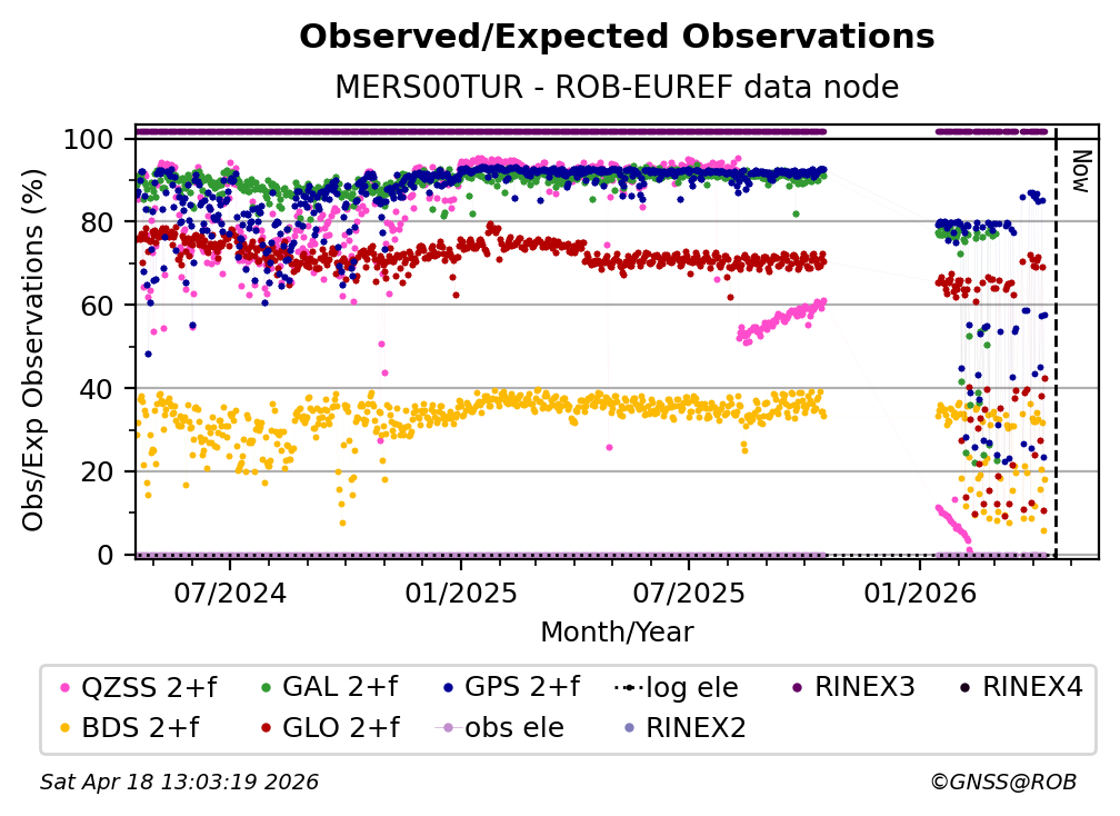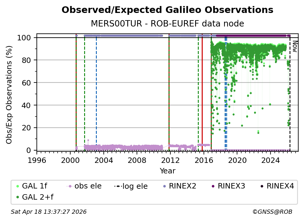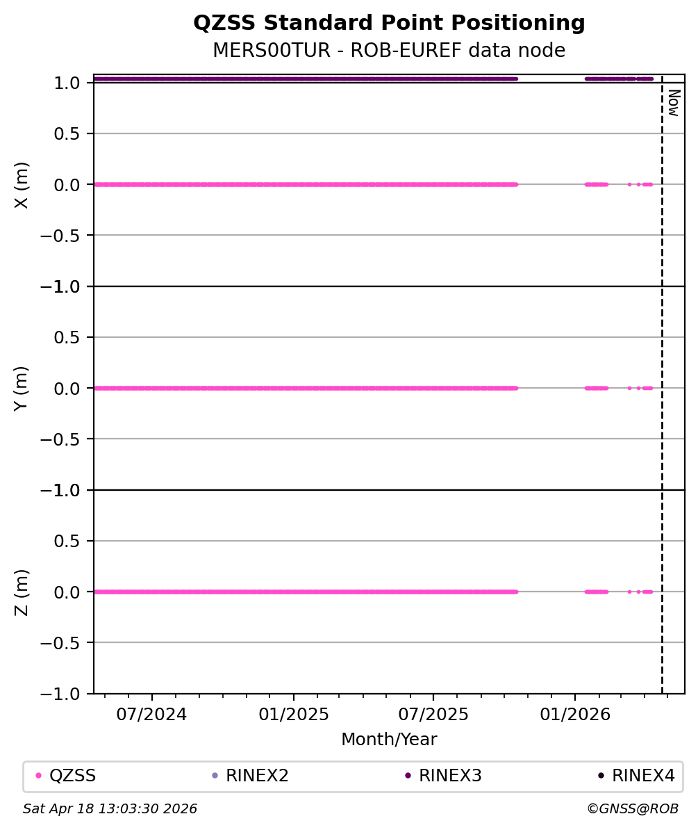 The plots below present the long-term tracking performance of the EPOS-GNSS station MERS00TUR based on the daily RINEX data available from the ROB-EUREF EPOS-GNSS data node. The data quality metrics have been computed at the data node using the G-Nut/Anubis software.