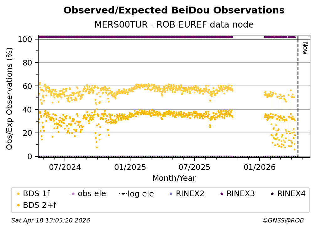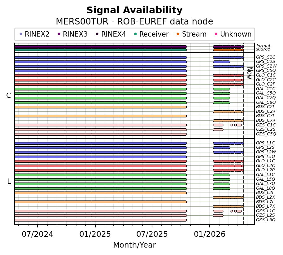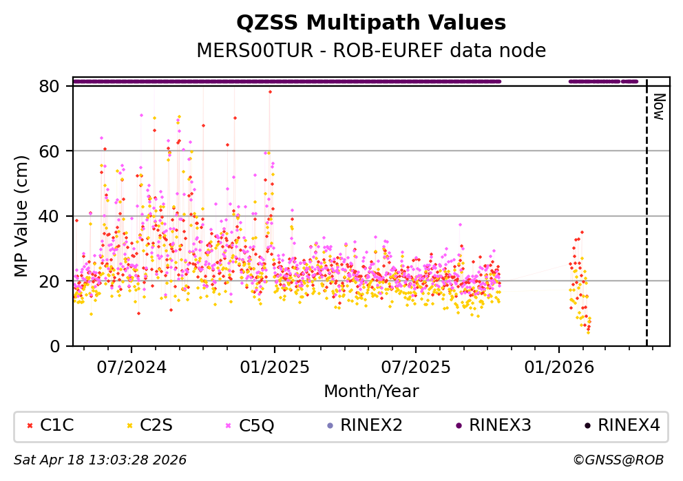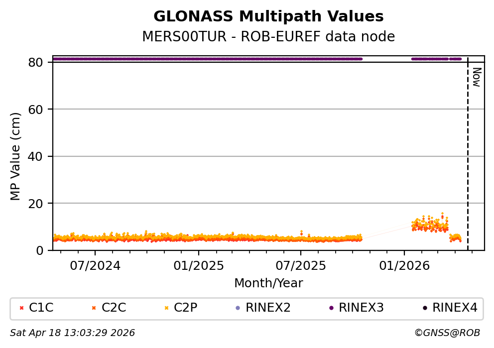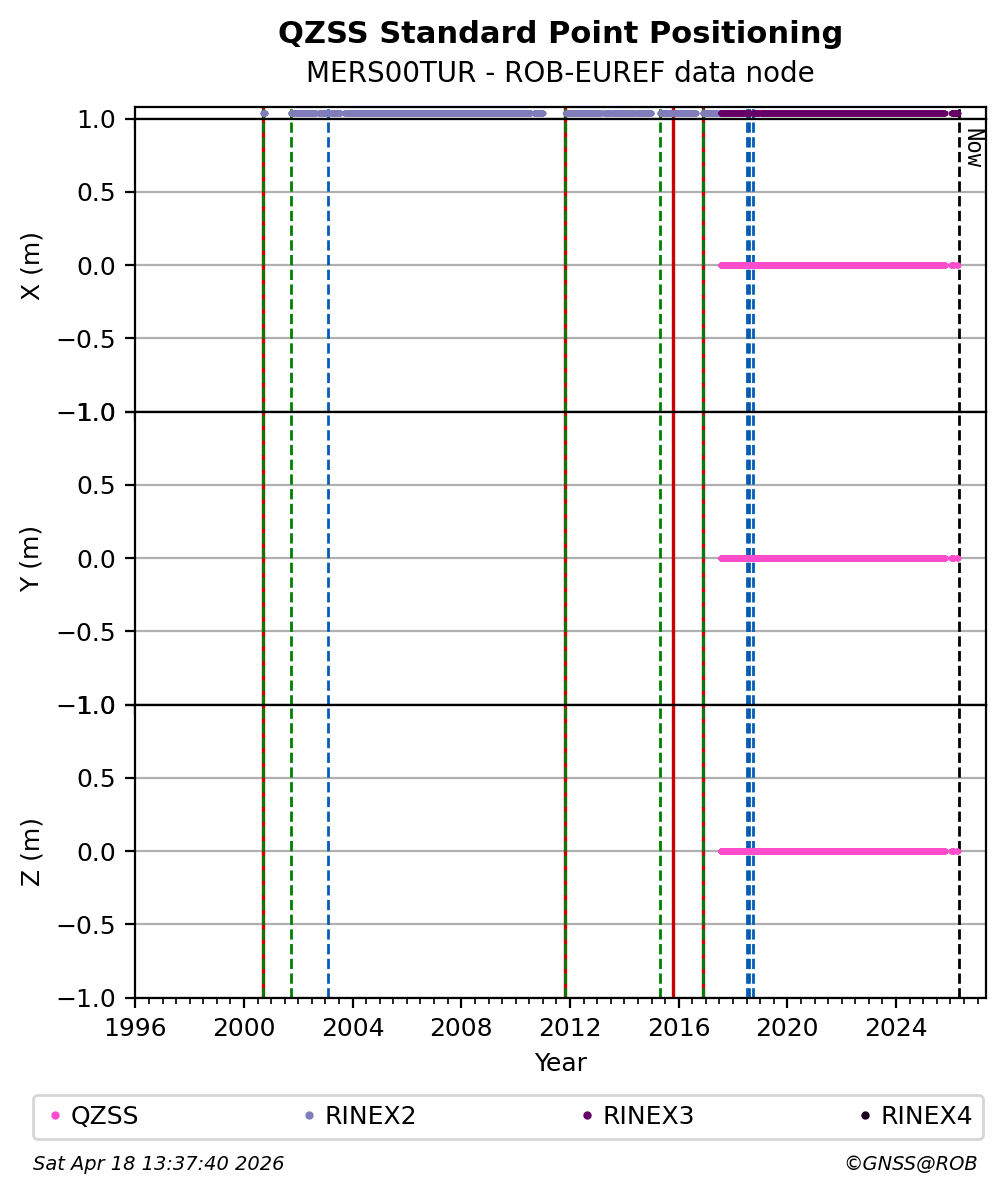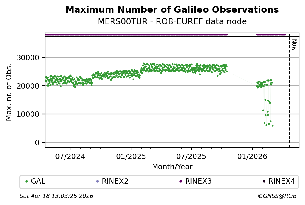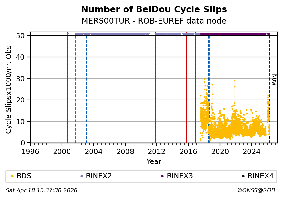 The plots below present the long-term tracking performance of the EPOS-GNSS station MERS00TUR based on the daily RINEX data available from the ROB-EUREF EPOS-GNSS data node. The data quality metrics have been computed at the data node using the G-Nut/Anubis software.