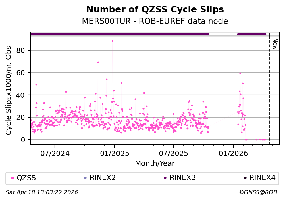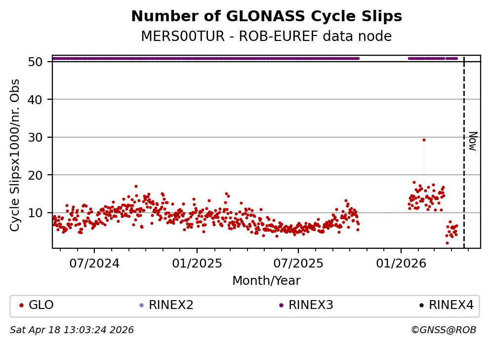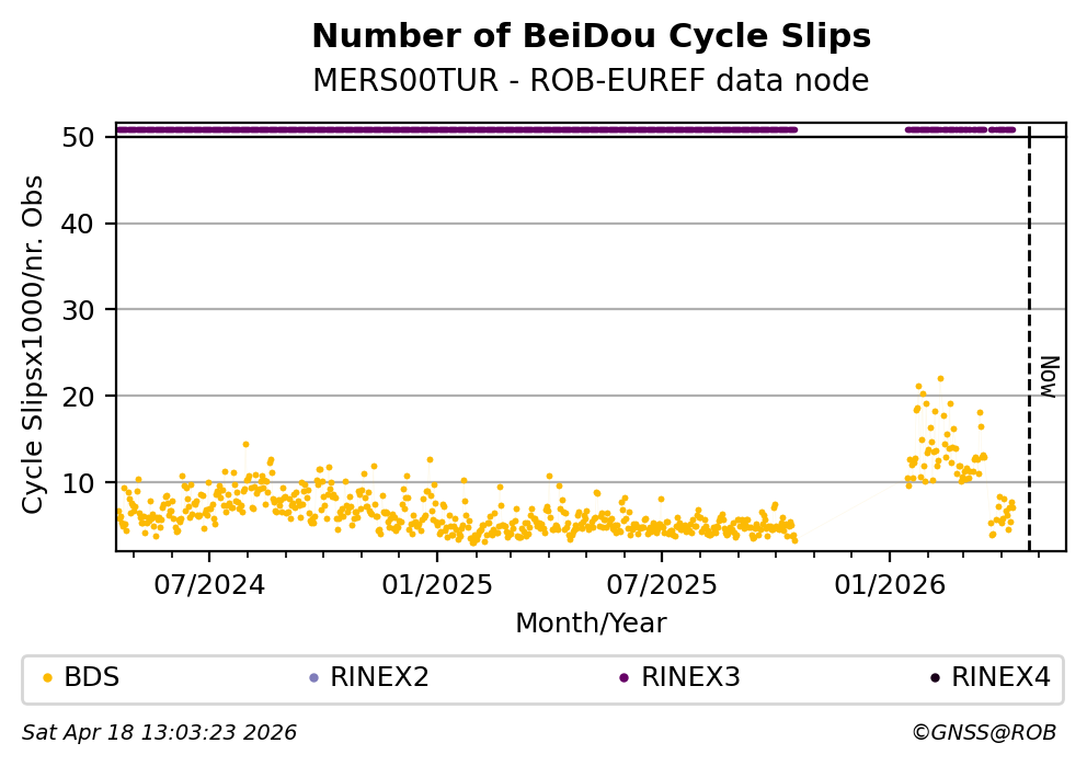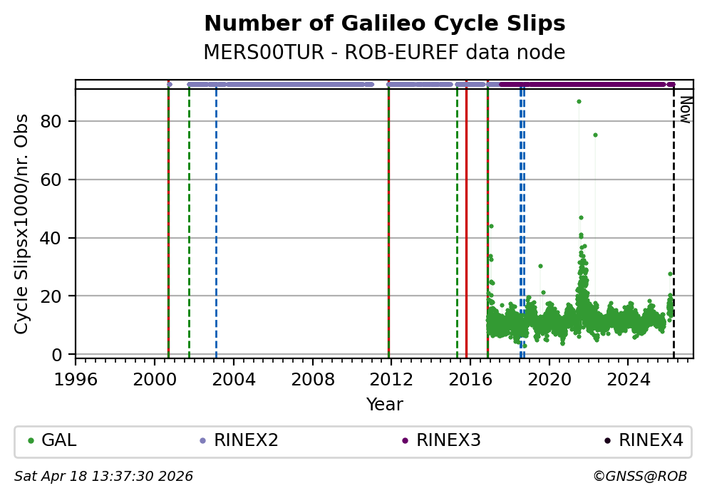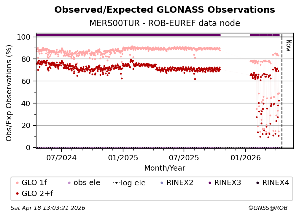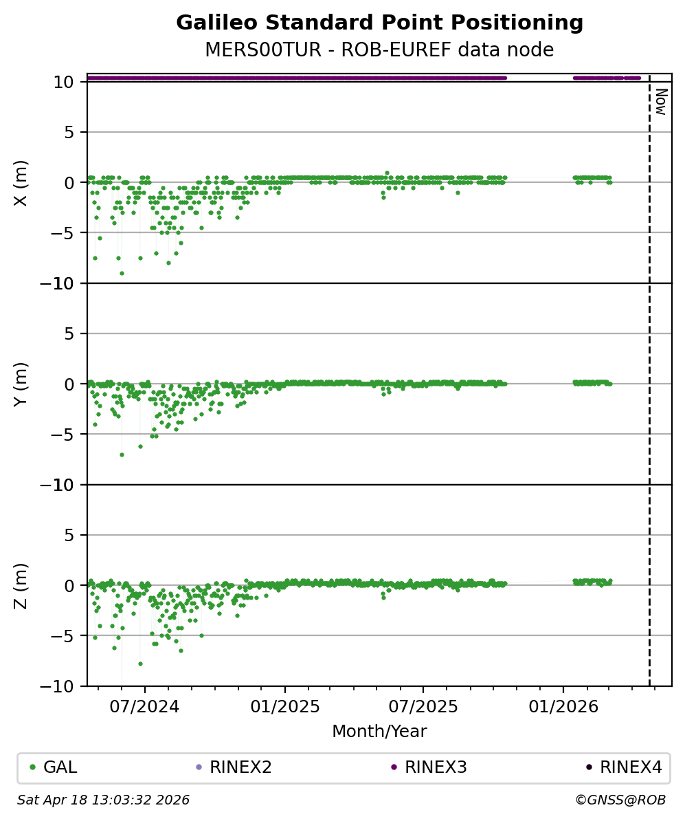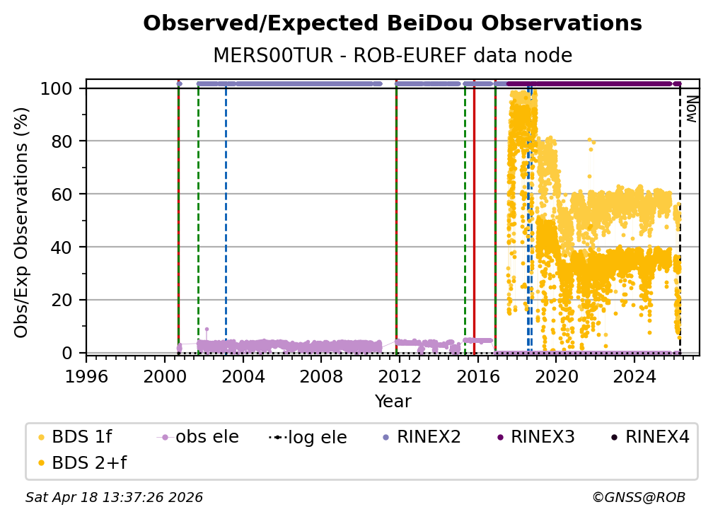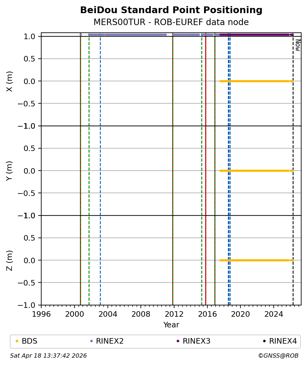 The plots below present the long-term tracking performance of the EPOS-GNSS station MERS00TUR based on the daily RINEX data available from the ROB-EUREF EPOS-GNSS data node. The data quality metrics have been computed at the data node using the G-Nut/Anubis software.