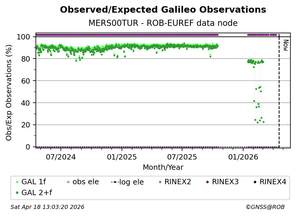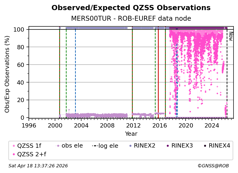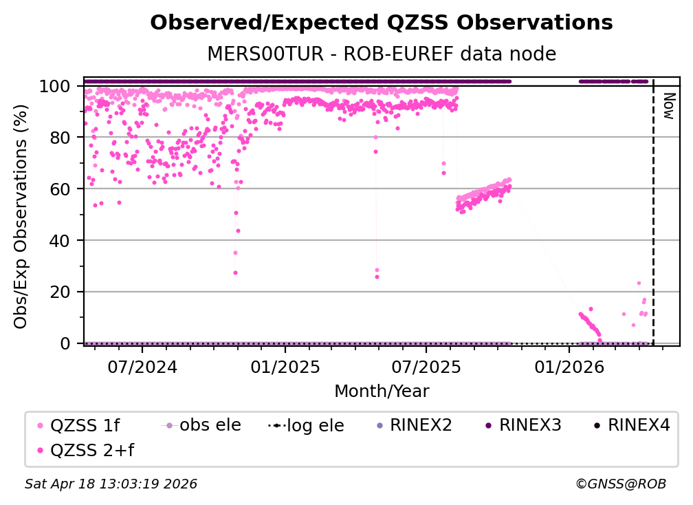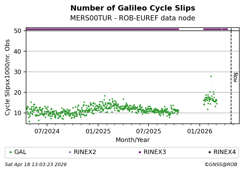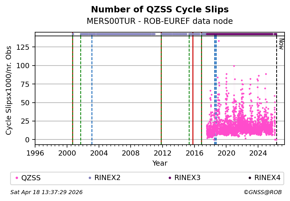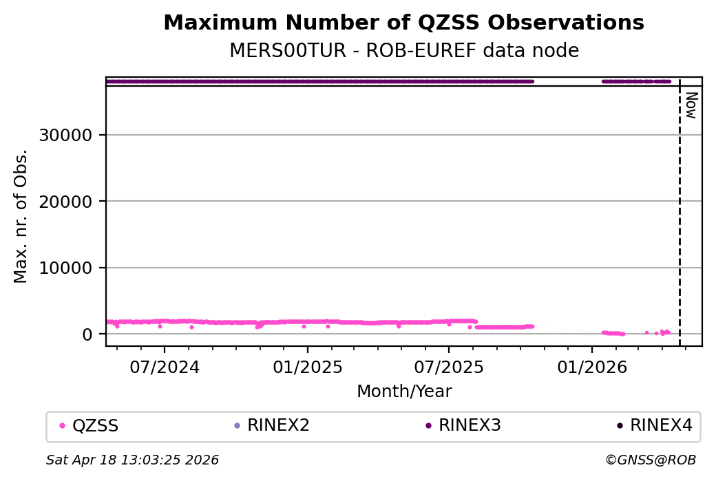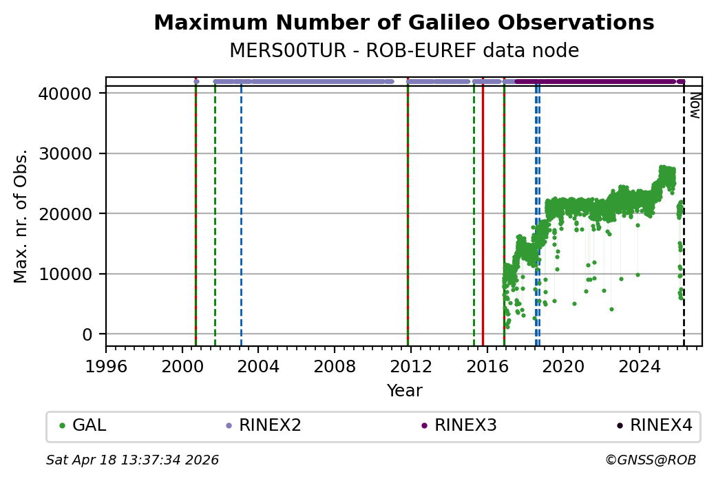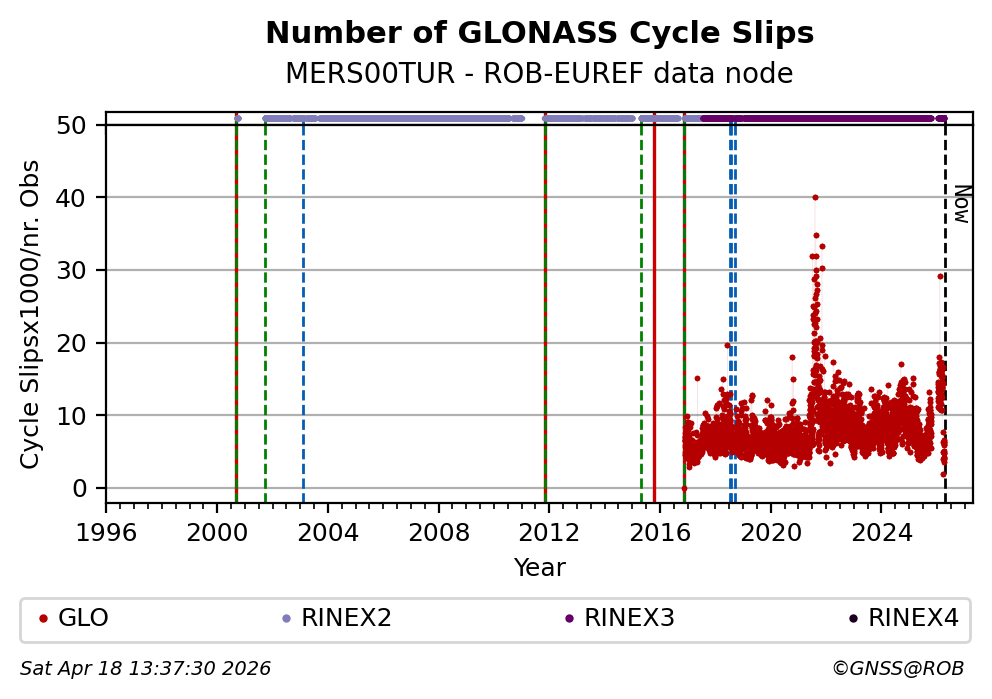 The plots below present the long-term tracking performance of the EPOS-GNSS station MERS00TUR based on the daily RINEX data available from the ROB-EUREF EPOS-GNSS data node. The data quality metrics have been computed at the data node using the G-Nut/Anubis software.