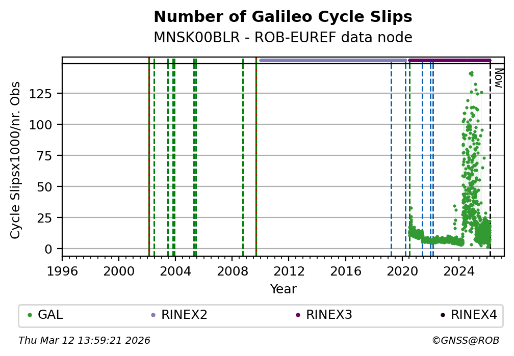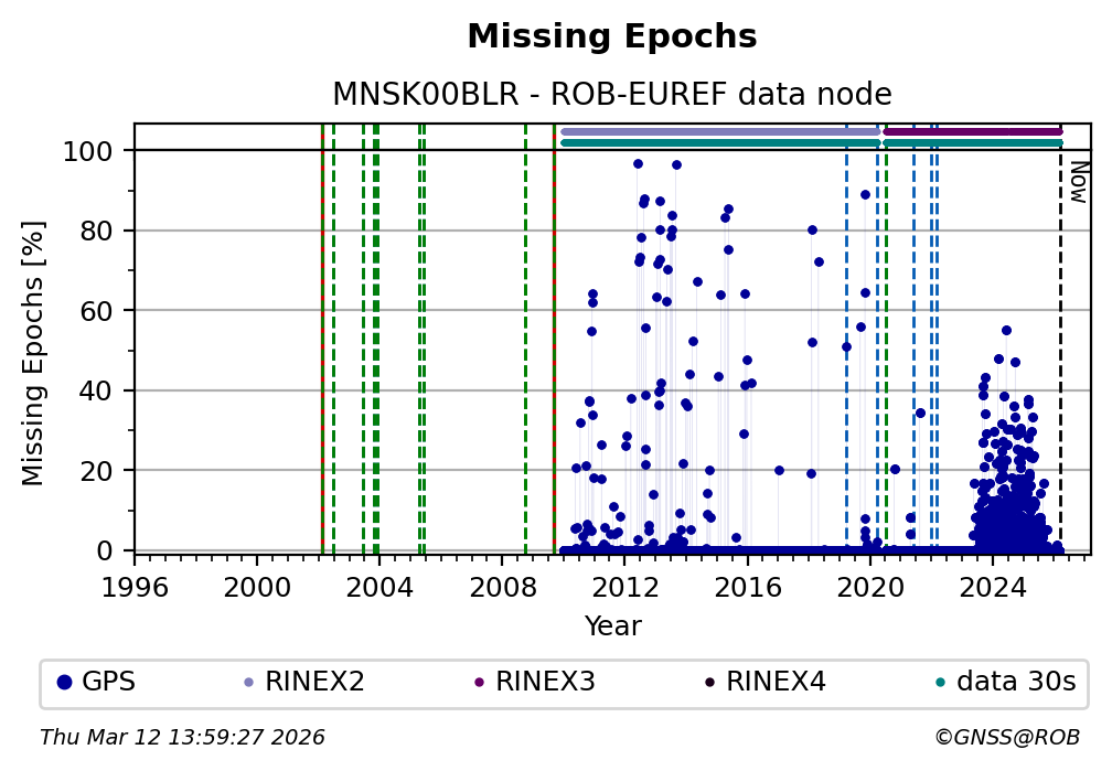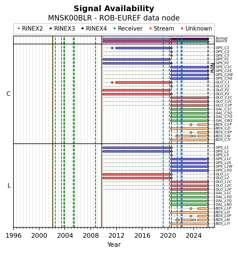 Red vertical lines, green and blue vertical dotted lines indicate respectively a change of antenna, receiver or receiver configuration (including firmware) as indicated by the station manager in the station site log available from the M3G GNSS Metadata Catalog. The purple points in the top of the plot indicate the daily RINEX data availability at the data node.
