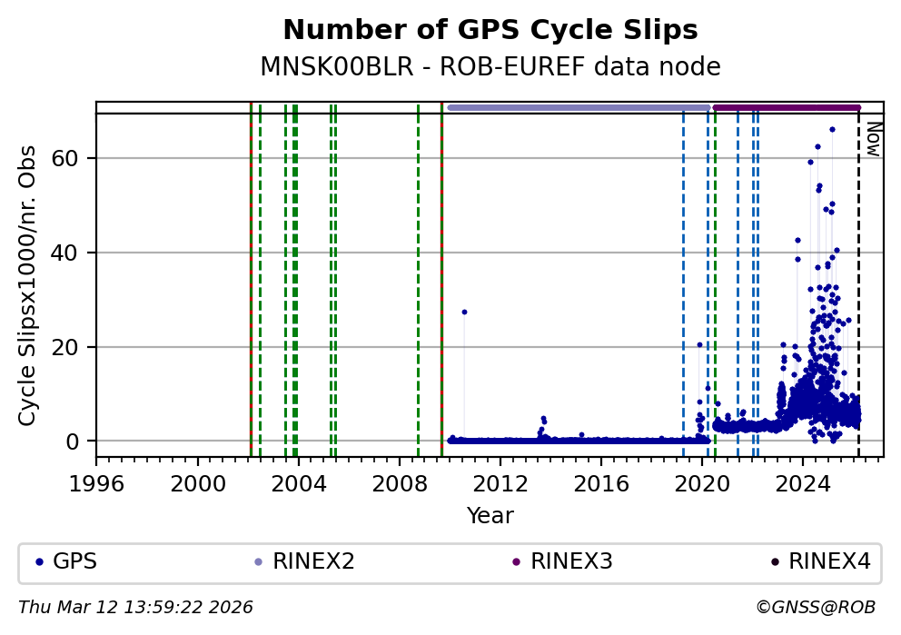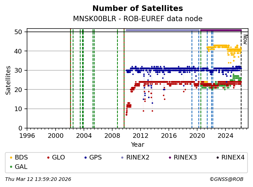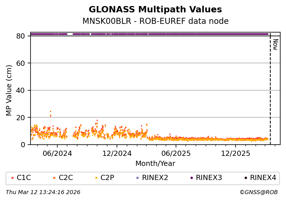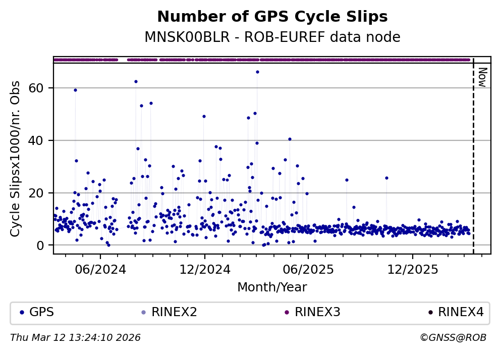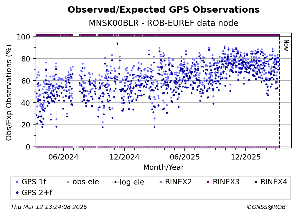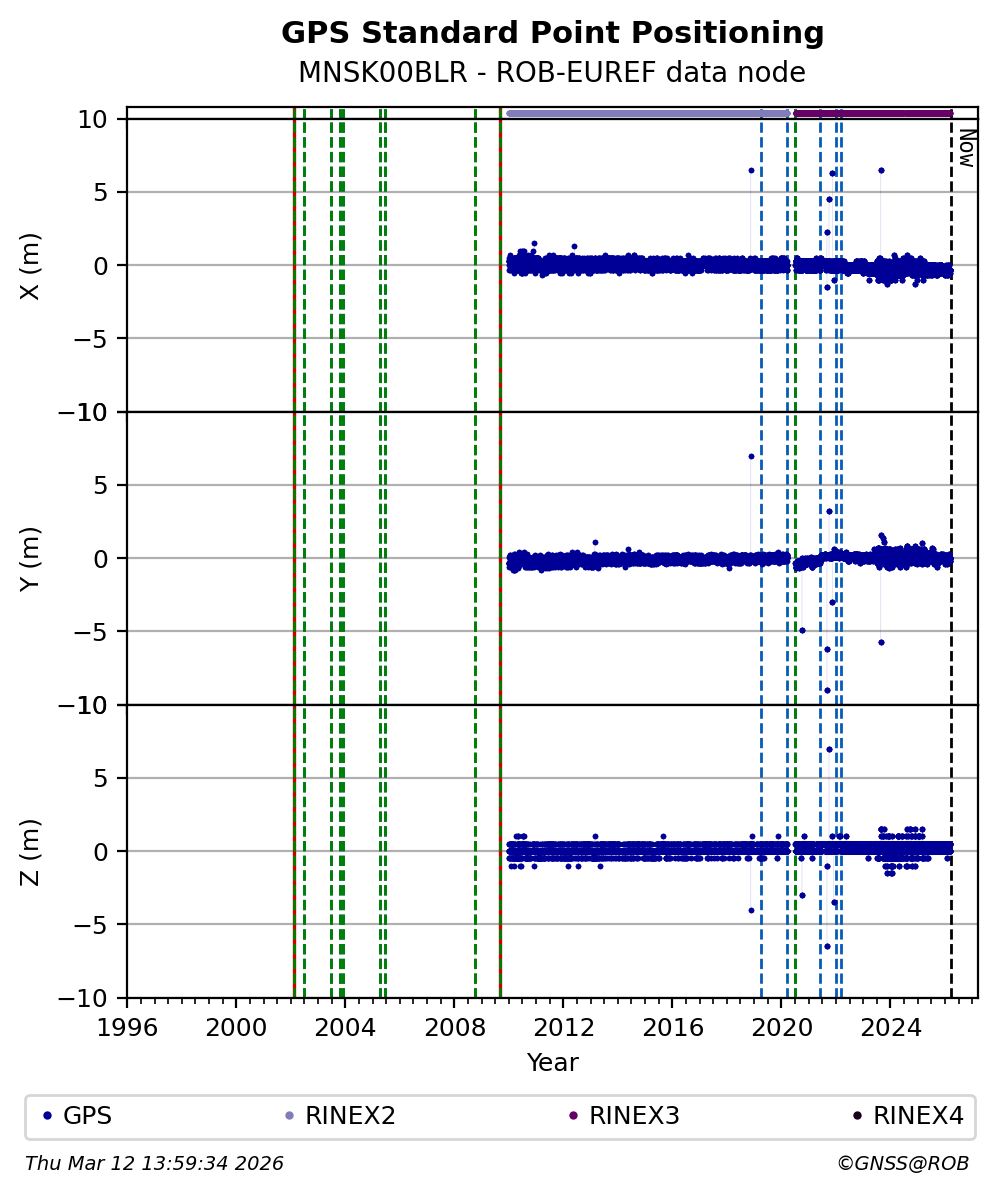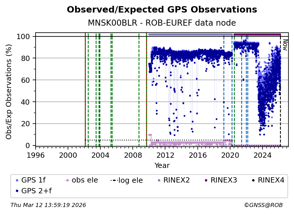 The plots below present the long-term tracking performance of the EPOS-GNSS station MNSK00BLR based on the daily RINEX data available from the ROB-EUREF EPOS-GNSS data node. The data quality metrics have been computed at the data node using the G-Nut/Anubis software.