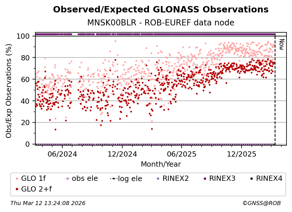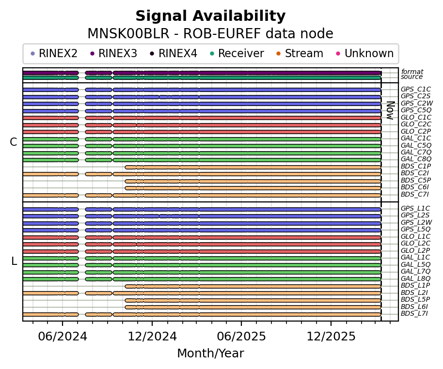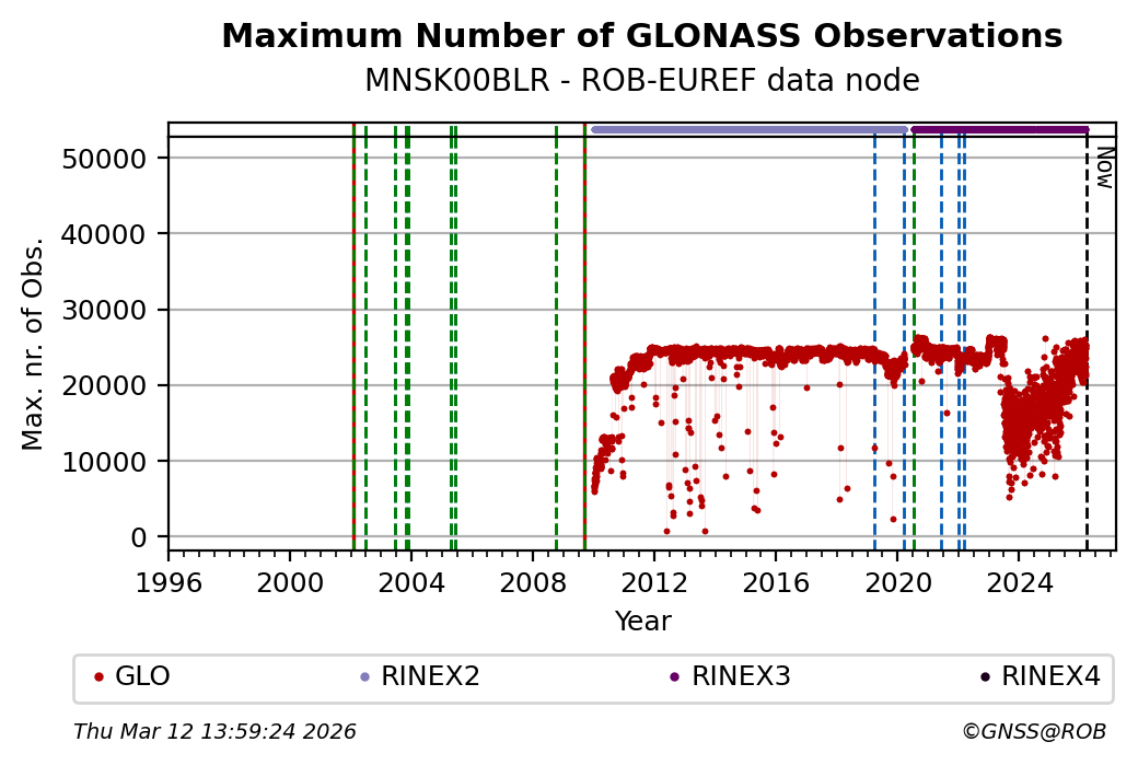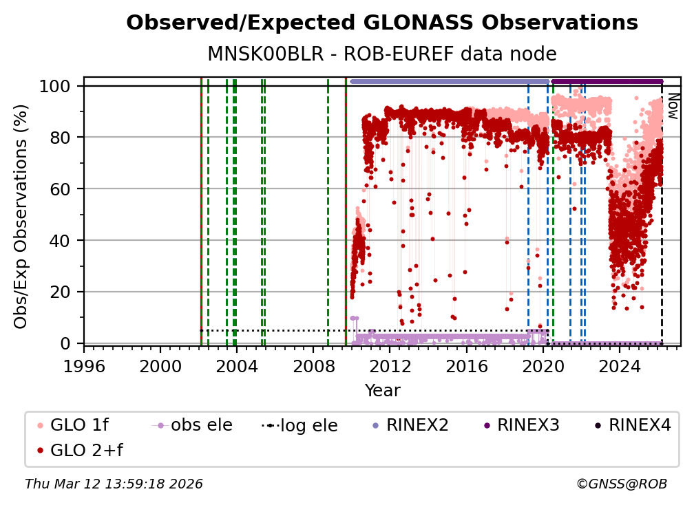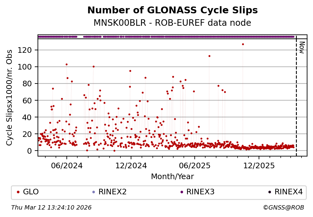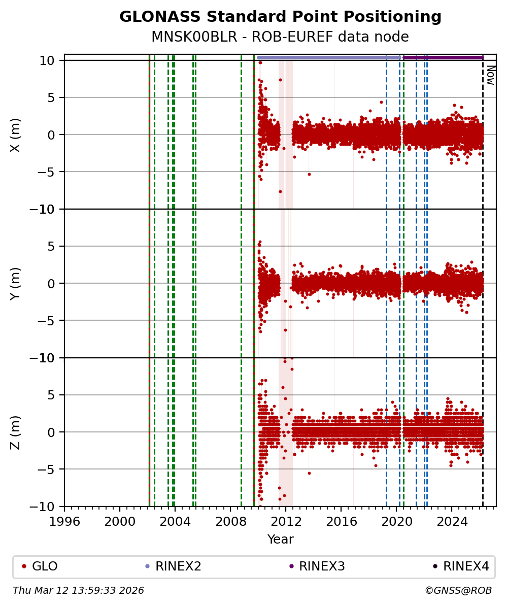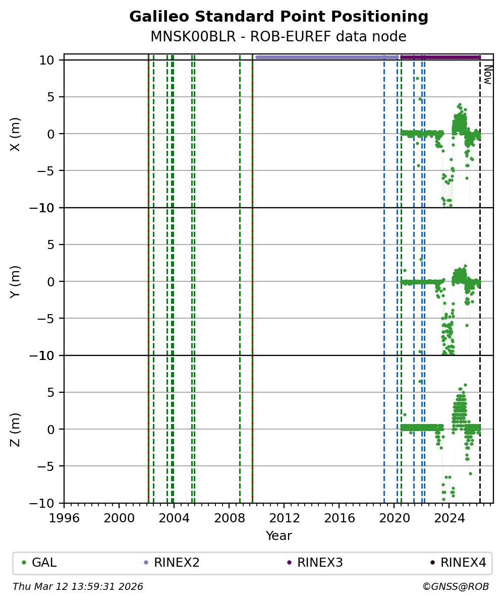 The plots below present the long-term tracking performance of the EPOS-GNSS station MNSK00BLR based on the daily RINEX data available from the ROB-EUREF EPOS-GNSS data node. The data quality metrics have been computed at the data node using the G-Nut/Anubis software.