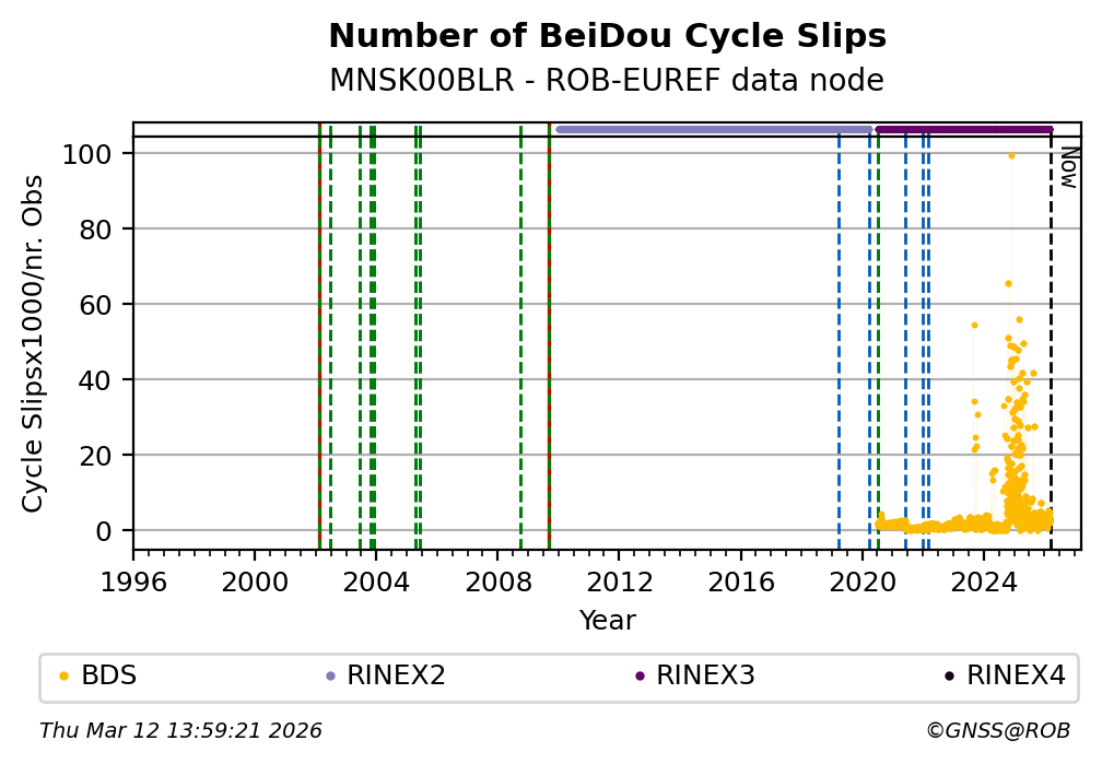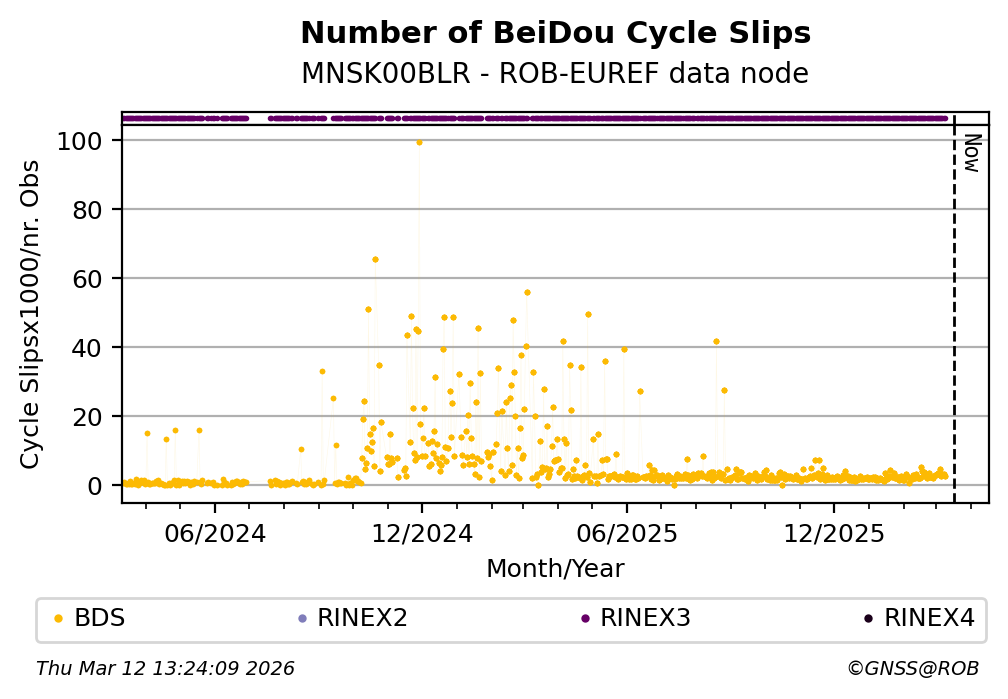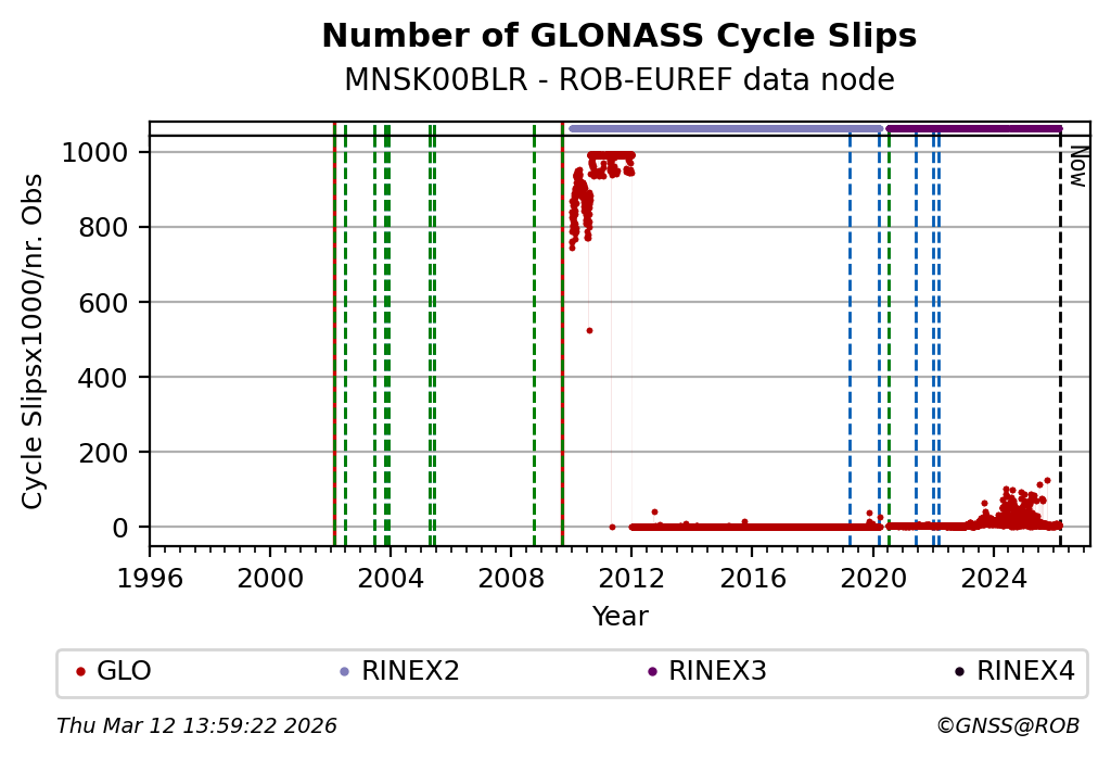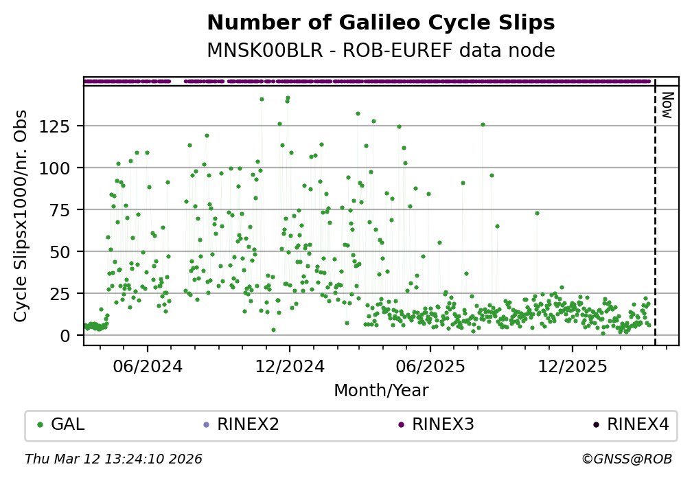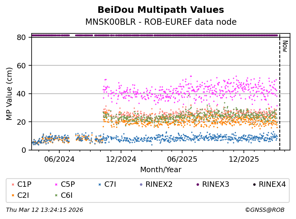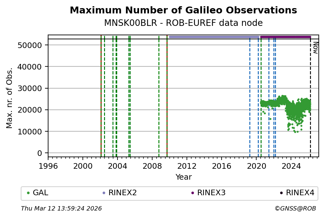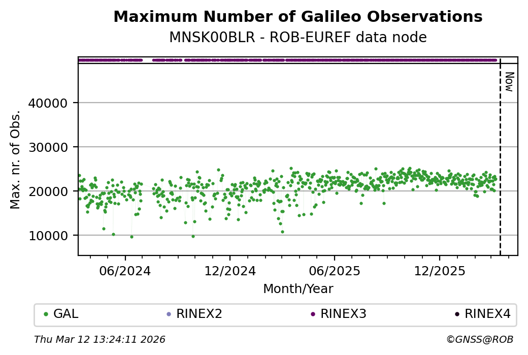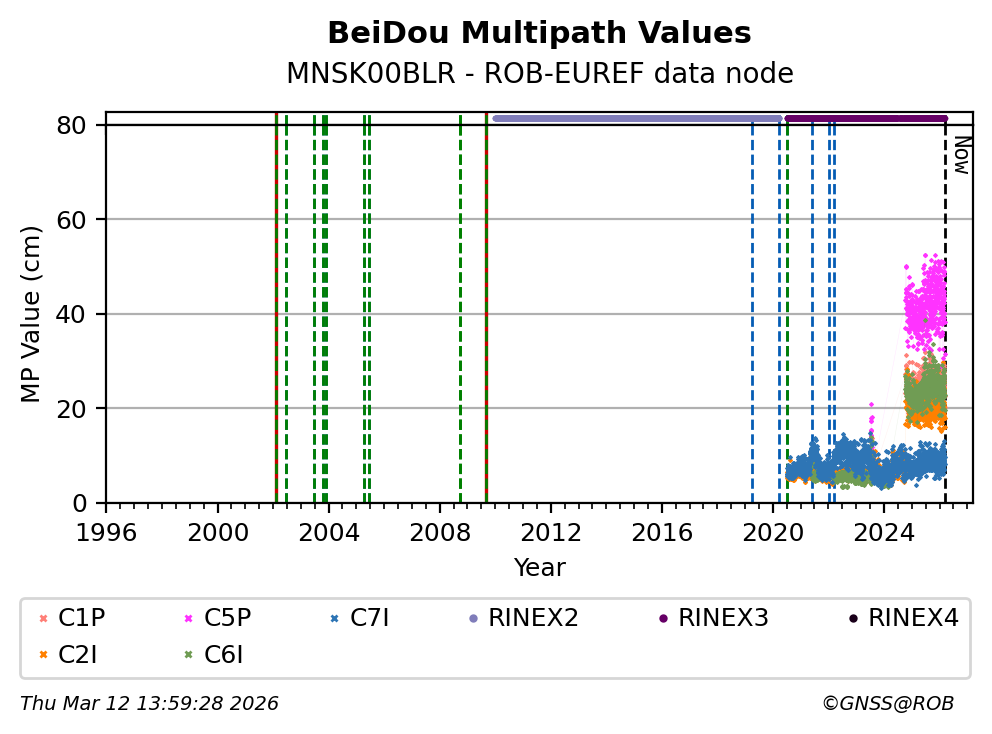 The plots below present the long-term tracking performance of the EPOS-GNSS station MNSK00BLR based on the daily RINEX data available from the ROB-EUREF EPOS-GNSS data node. The data quality metrics have been computed at the data node using the G-Nut/Anubis software.