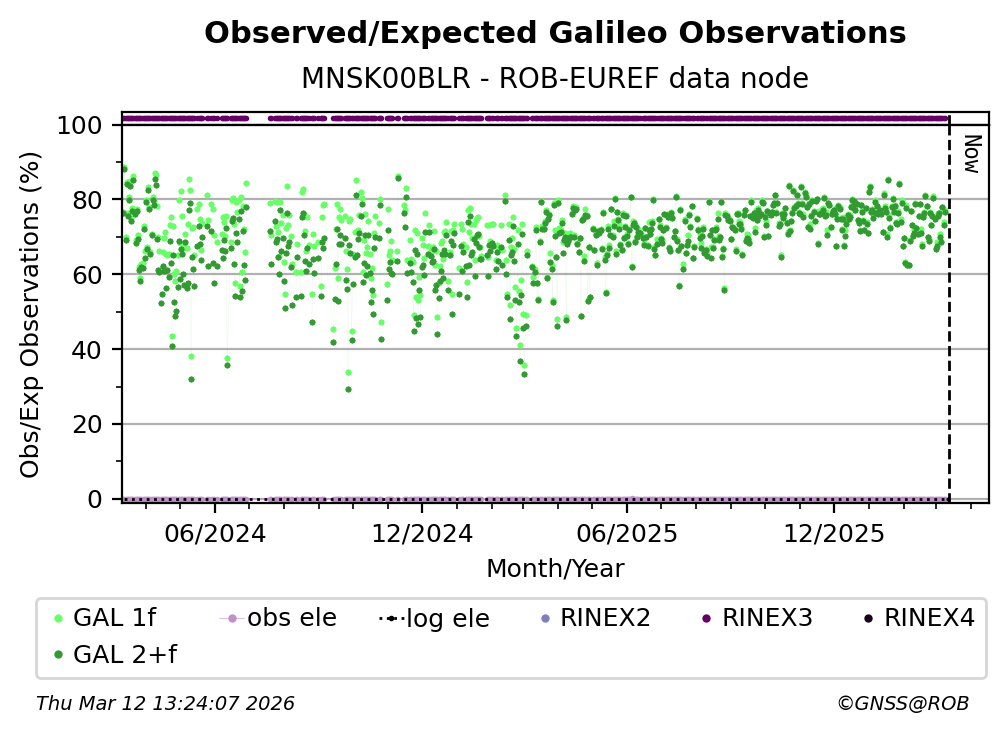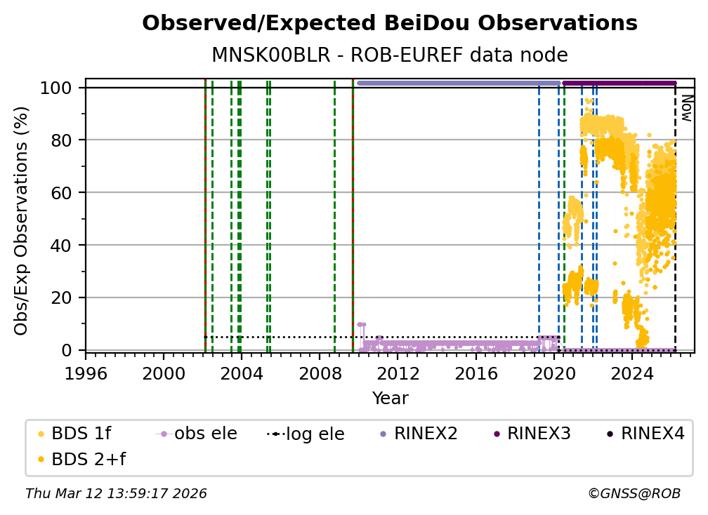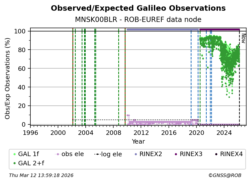 The percentage corresponds, for each constellation tracked by the station, to the ratio of the number of observations in the daily RINEX file with respect to the number of expected observations:
