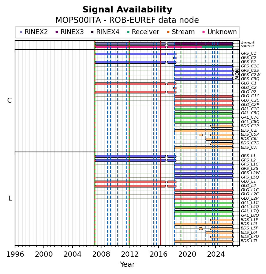 Red vertical lines, green and blue vertical dotted lines indicate respectively a change of antenna, receiver or receiver configuration (including firmware) as indicated by the station manager in the station site log available from the M3G GNSS Metadata Catalog. The purple points in the top of the plot indicate the daily RINEX data availability at the data node.