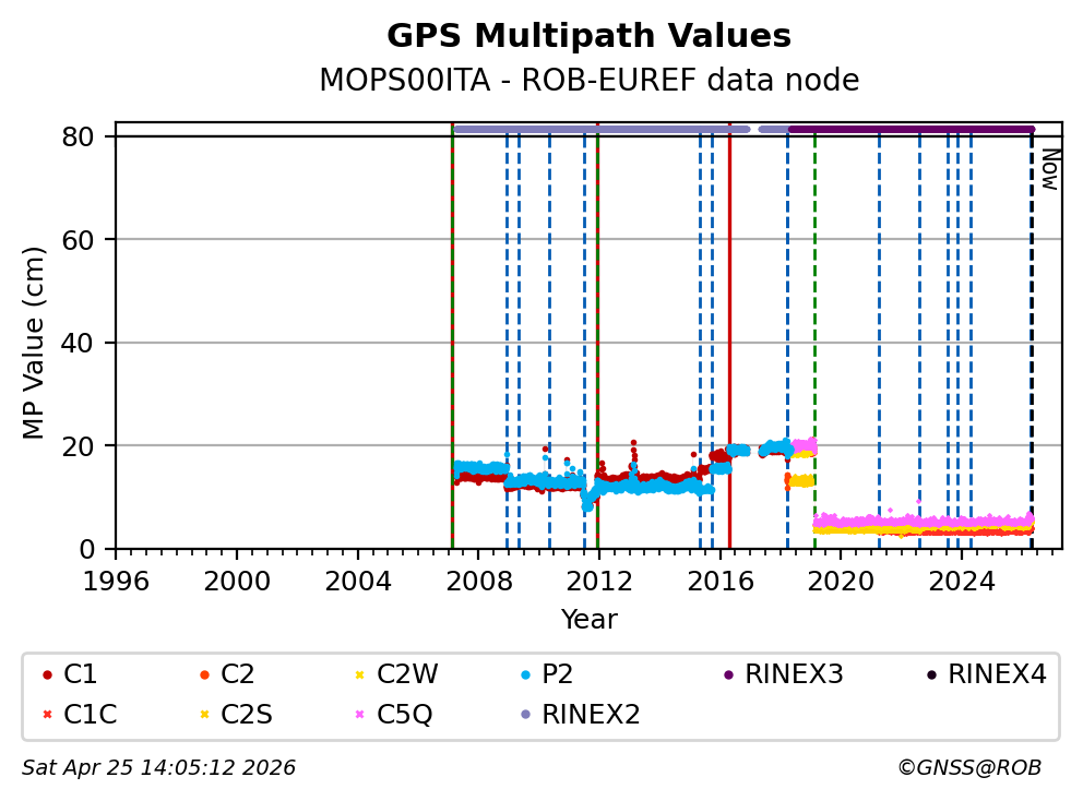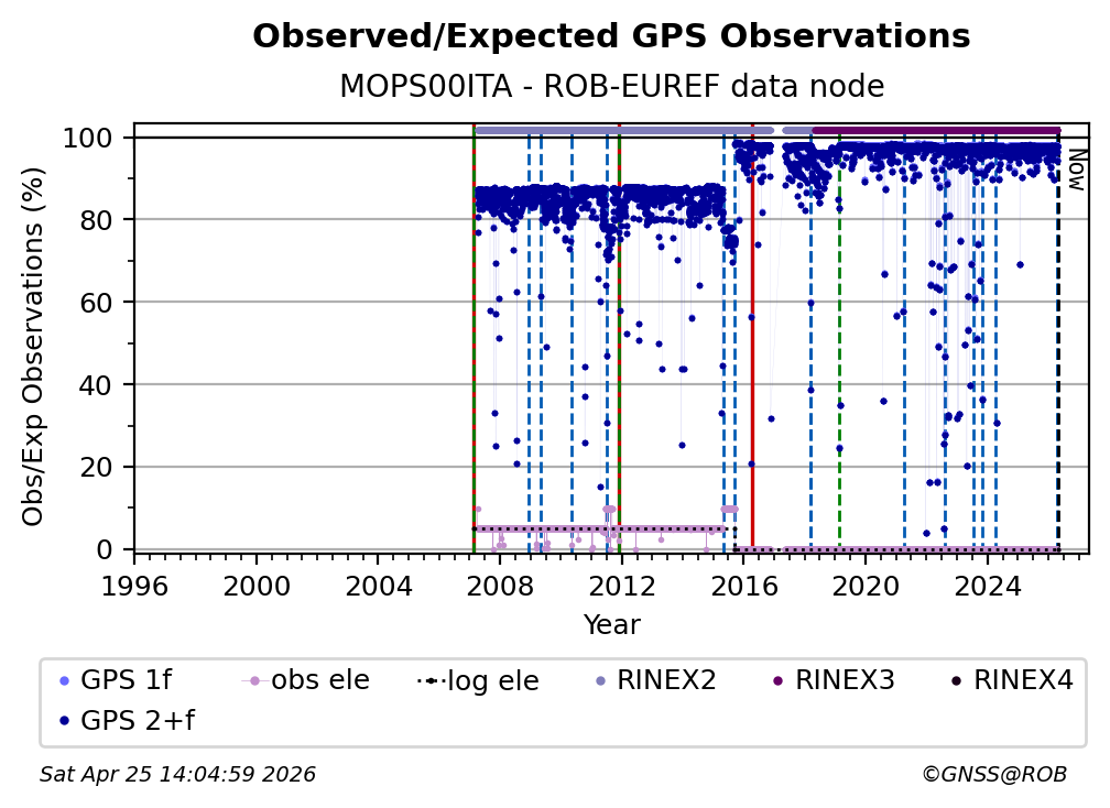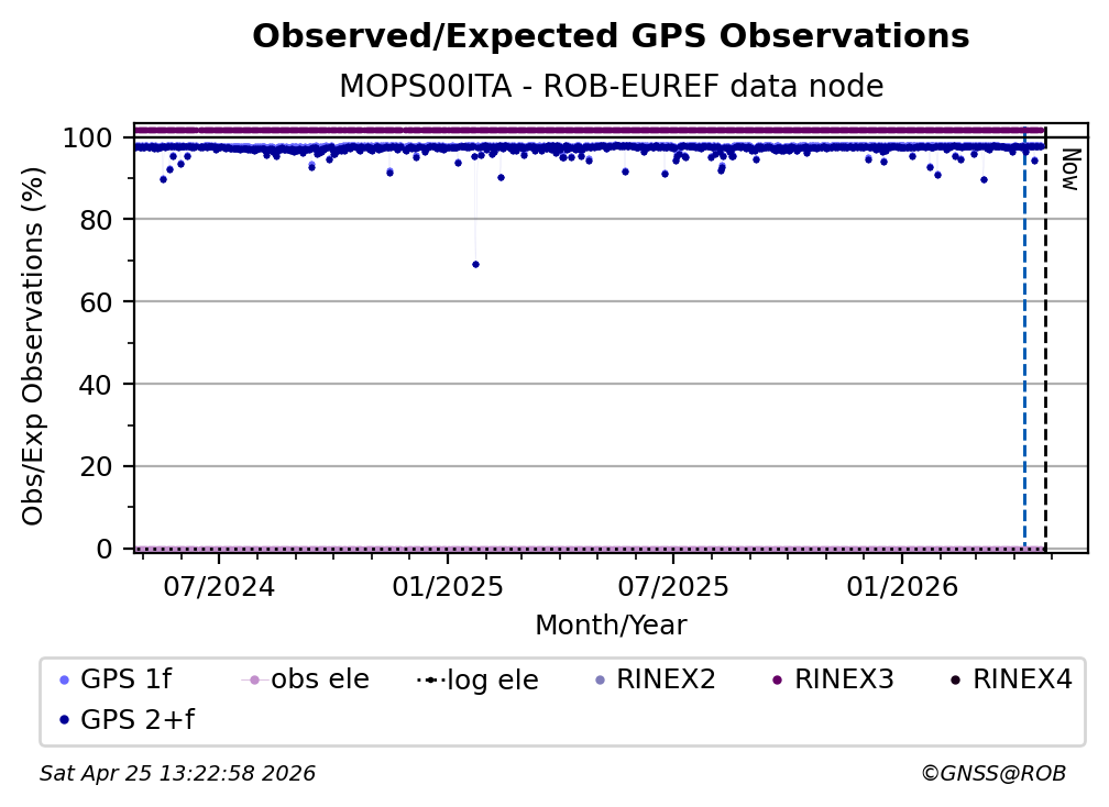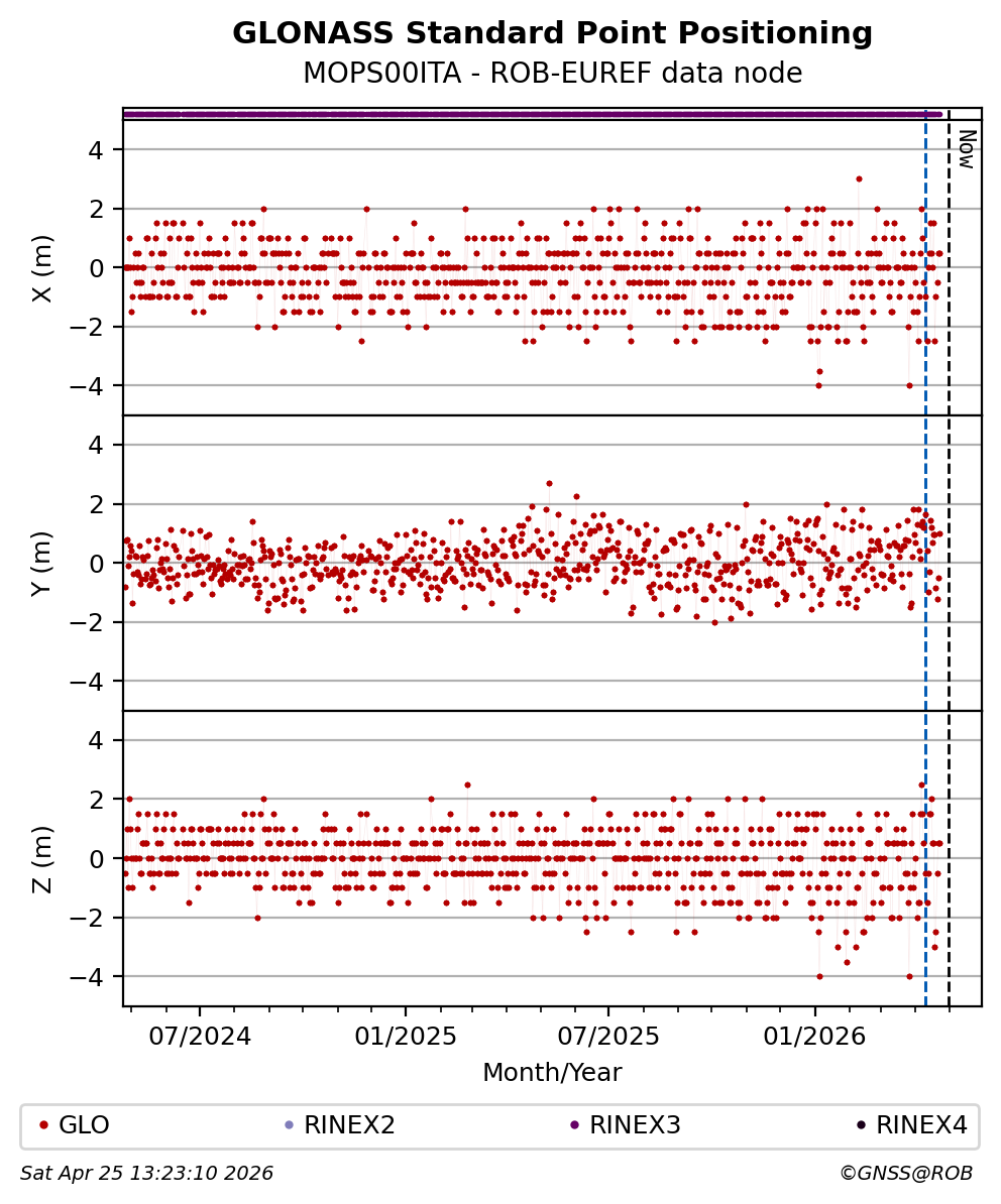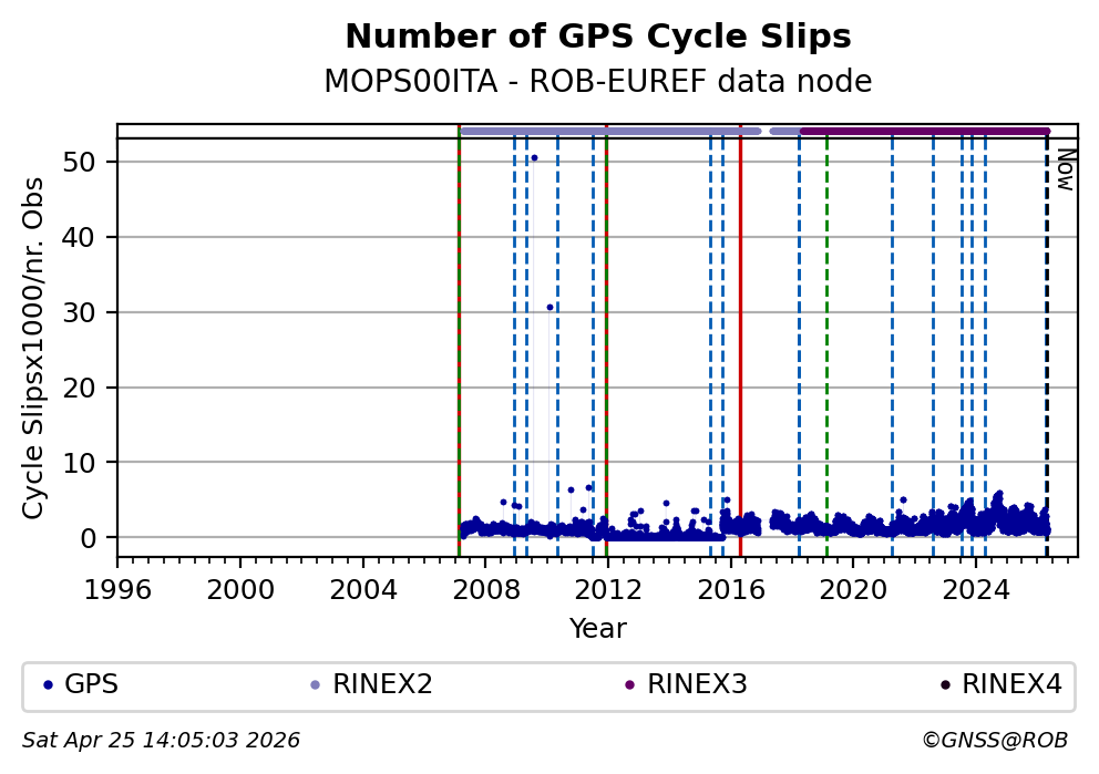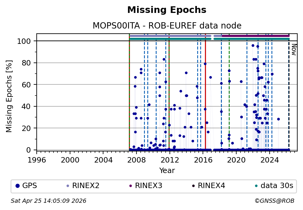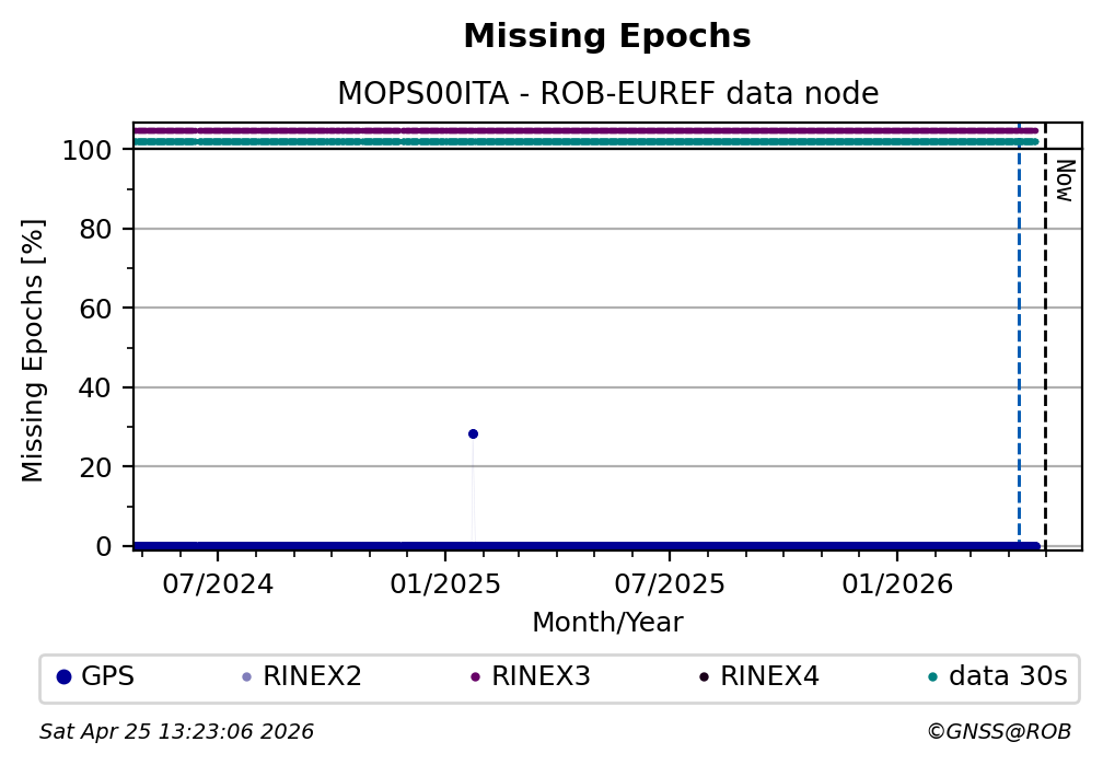 The plots below present the long-term tracking performance of the EPOS-GNSS station MOPS00ITA based on the daily RINEX data available from the ROB-EUREF EPOS-GNSS data node. The data quality metrics have been computed at the data node using the G-Nut/Anubis software.