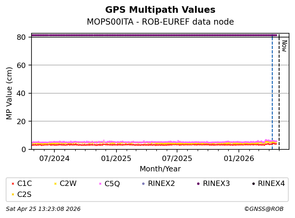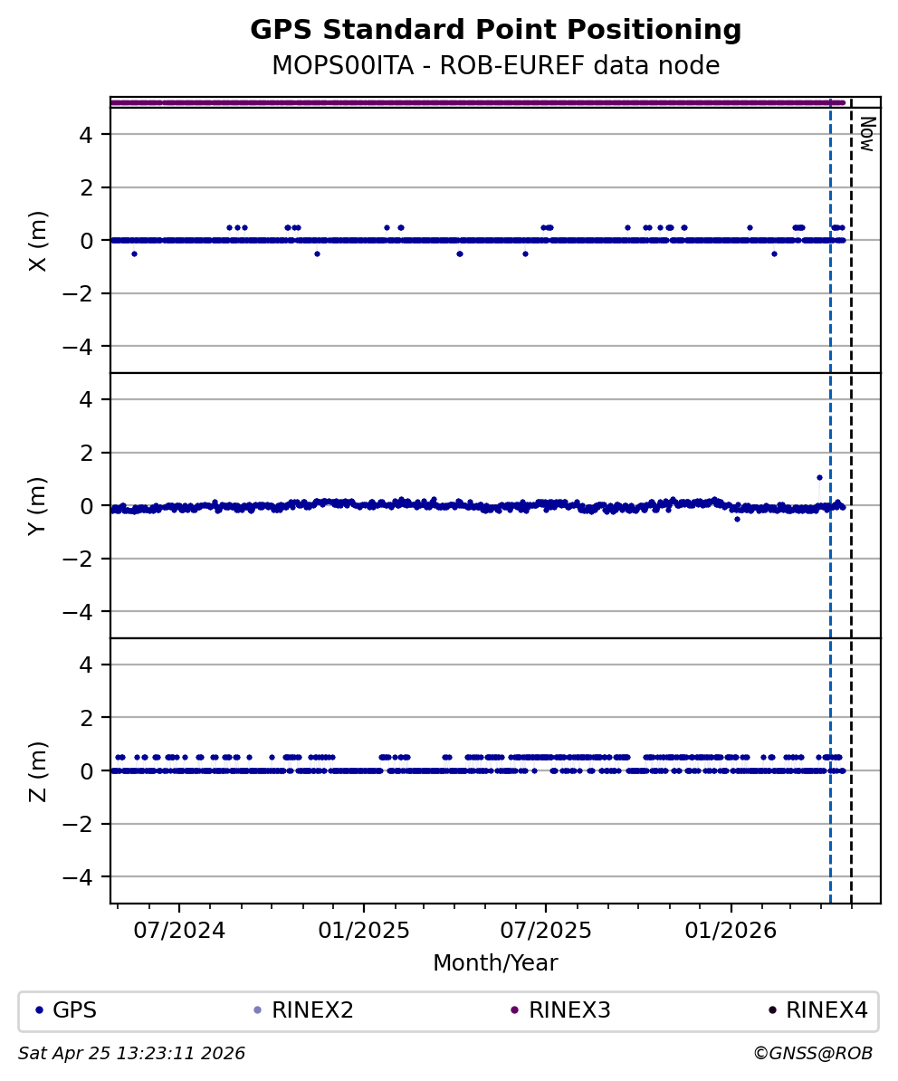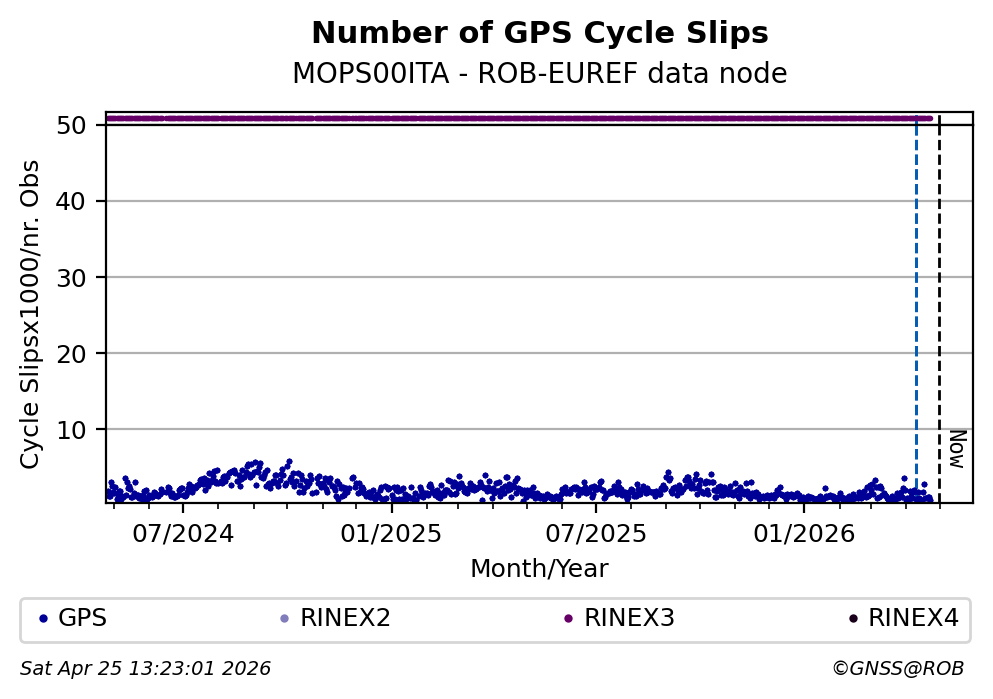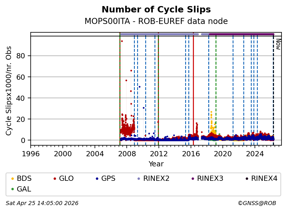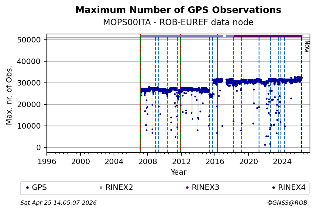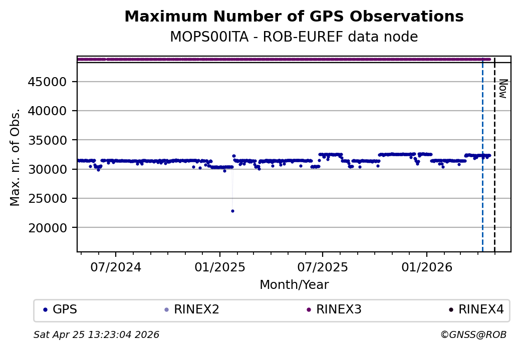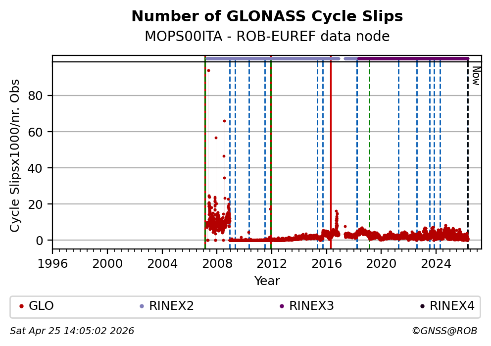 The plots below present the long-term tracking performance of the EPOS-GNSS station MOPS00ITA based on the daily RINEX data available from the ROB-EUREF EPOS-GNSS data node. The data quality metrics have been computed at the data node using the G-Nut/Anubis software.