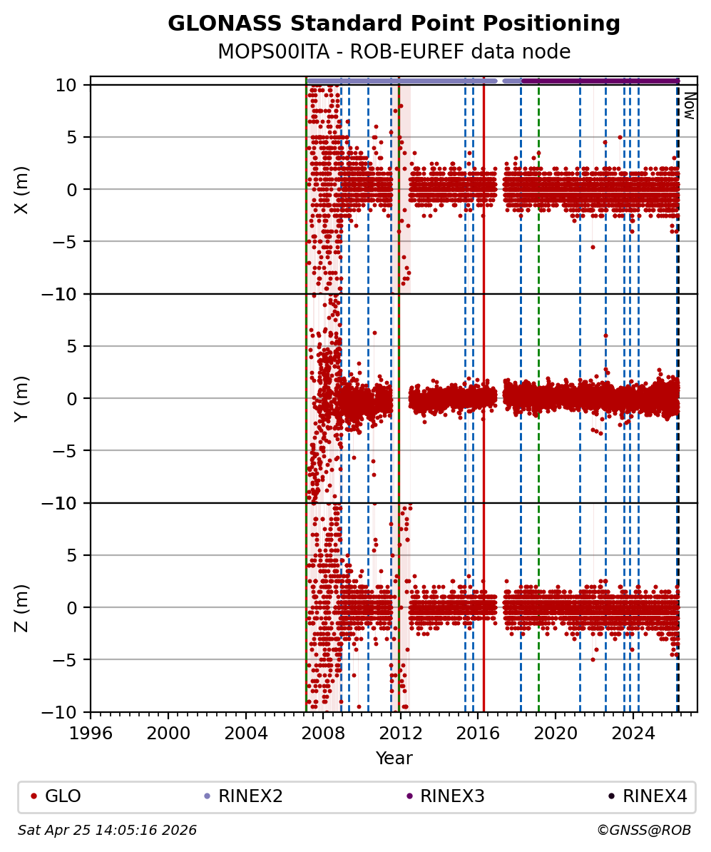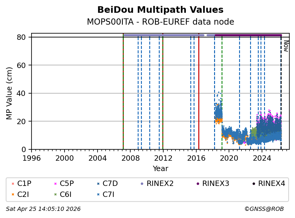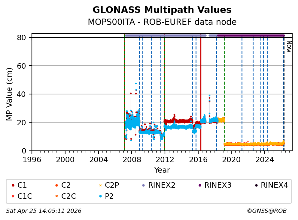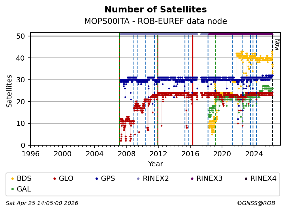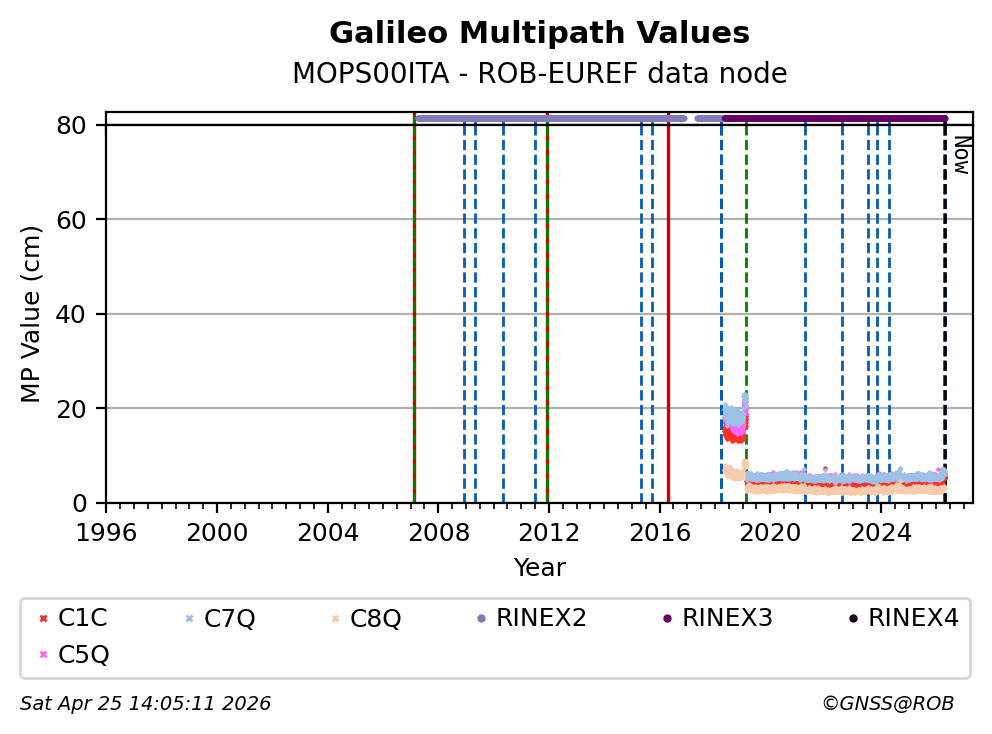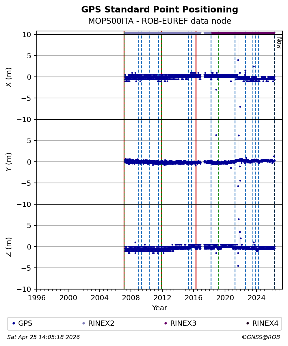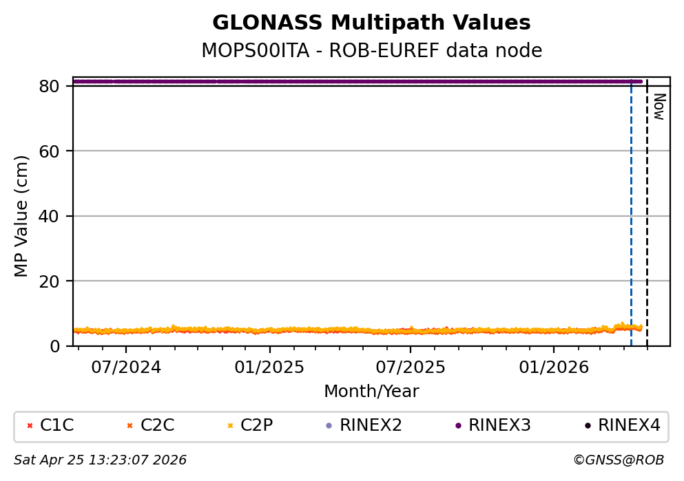 The plots below present the long-term tracking performance of the EPOS-GNSS station MOPS00ITA based on the daily RINEX data available from the ROB-EUREF EPOS-GNSS data node. The data quality metrics have been computed at the data node using the G-Nut/Anubis software.