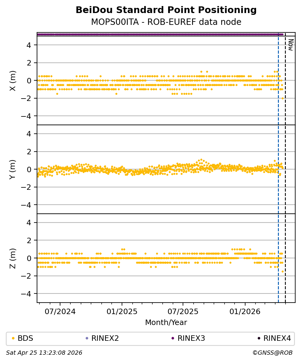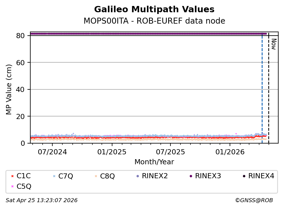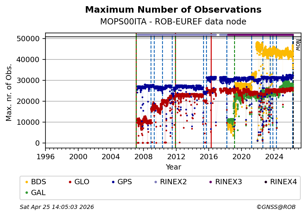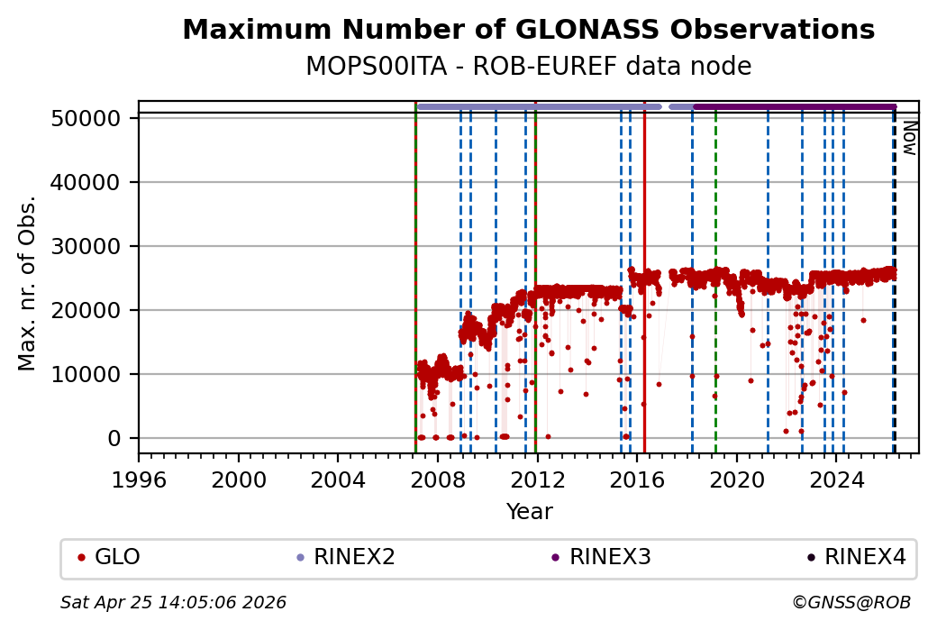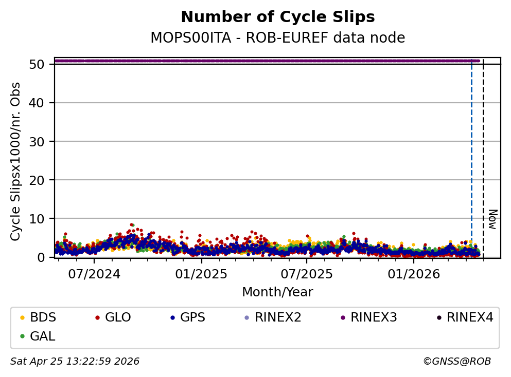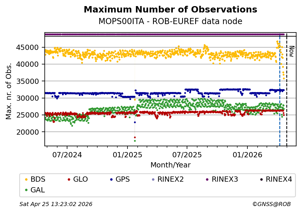 The plots below present the long-term tracking performance of the EPOS-GNSS station MOPS00ITA based on the daily RINEX data available from the ROB-EUREF EPOS-GNSS data node. The data quality metrics have been computed at the data node using the G-Nut/Anubis software.