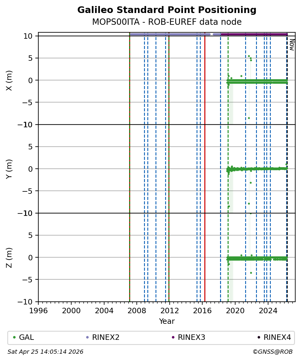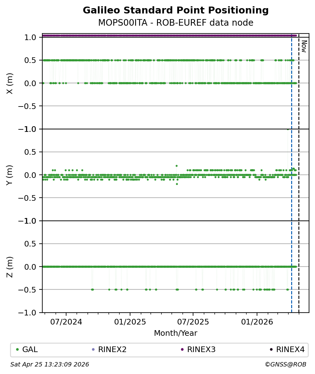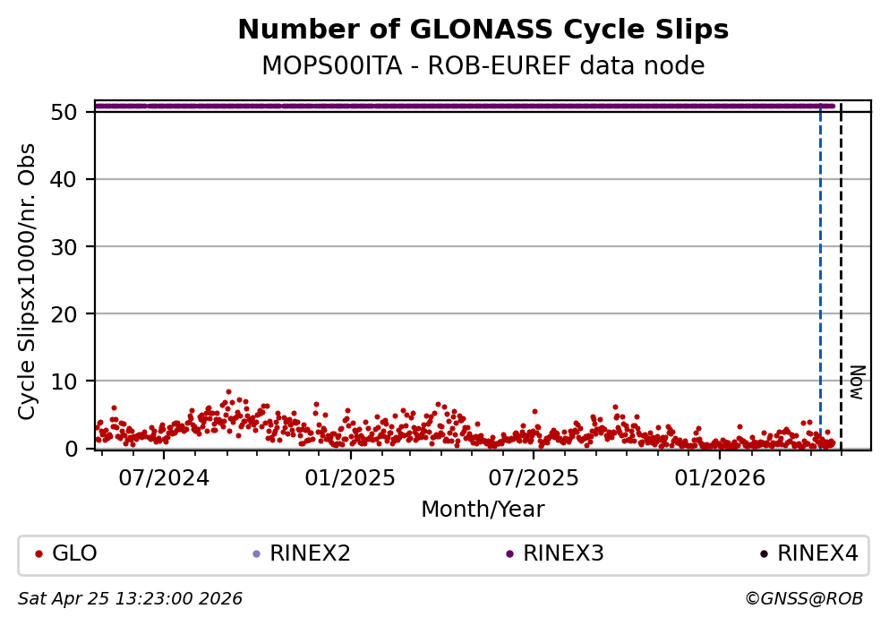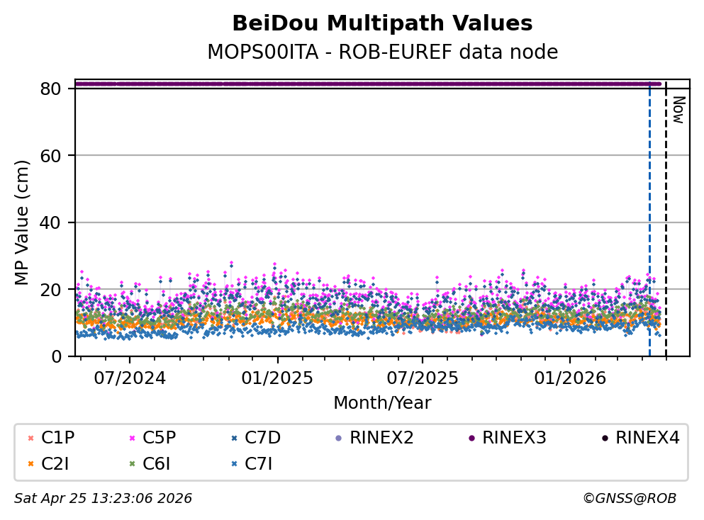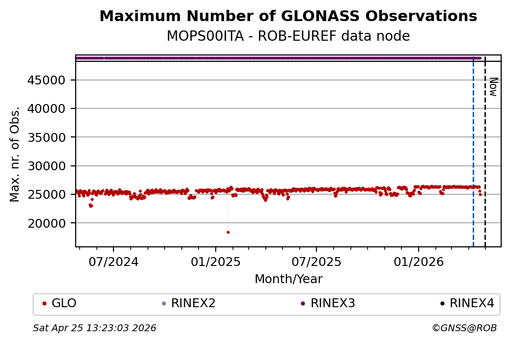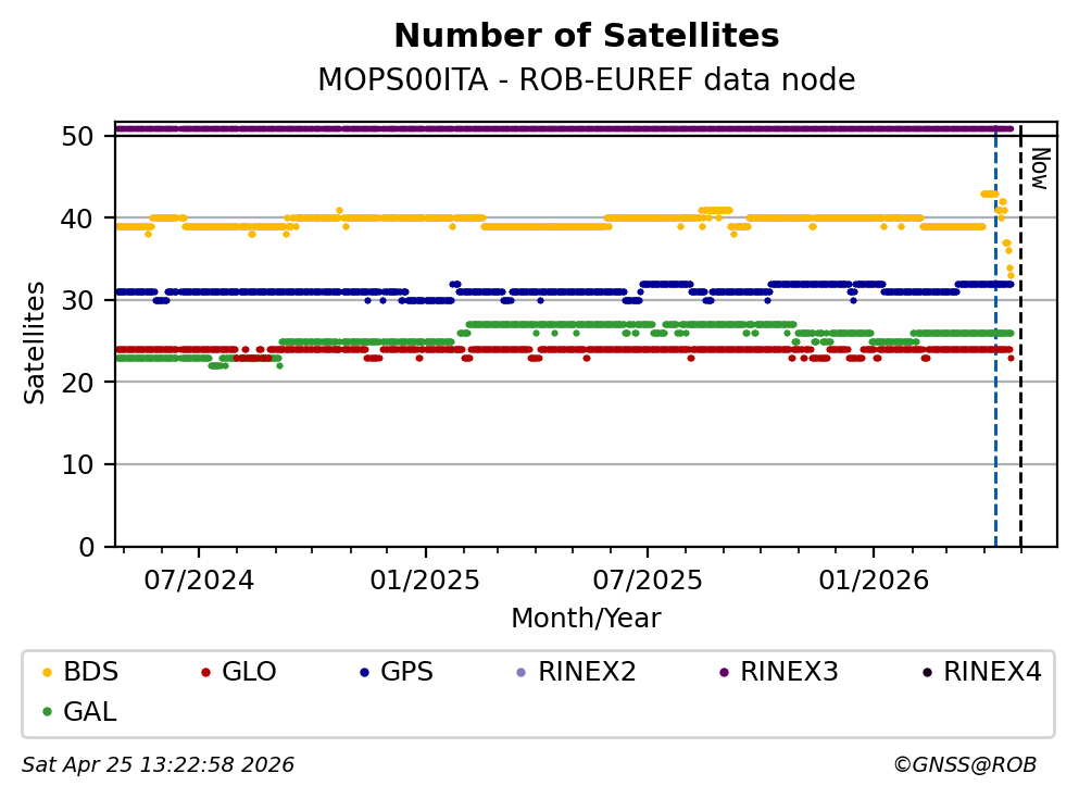 The plots below present the long-term tracking performance of the EPOS-GNSS station MOPS00ITA based on the daily RINEX data available from the ROB-EUREF EPOS-GNSS data node. The data quality metrics have been computed at the data node using the G-Nut/Anubis software.