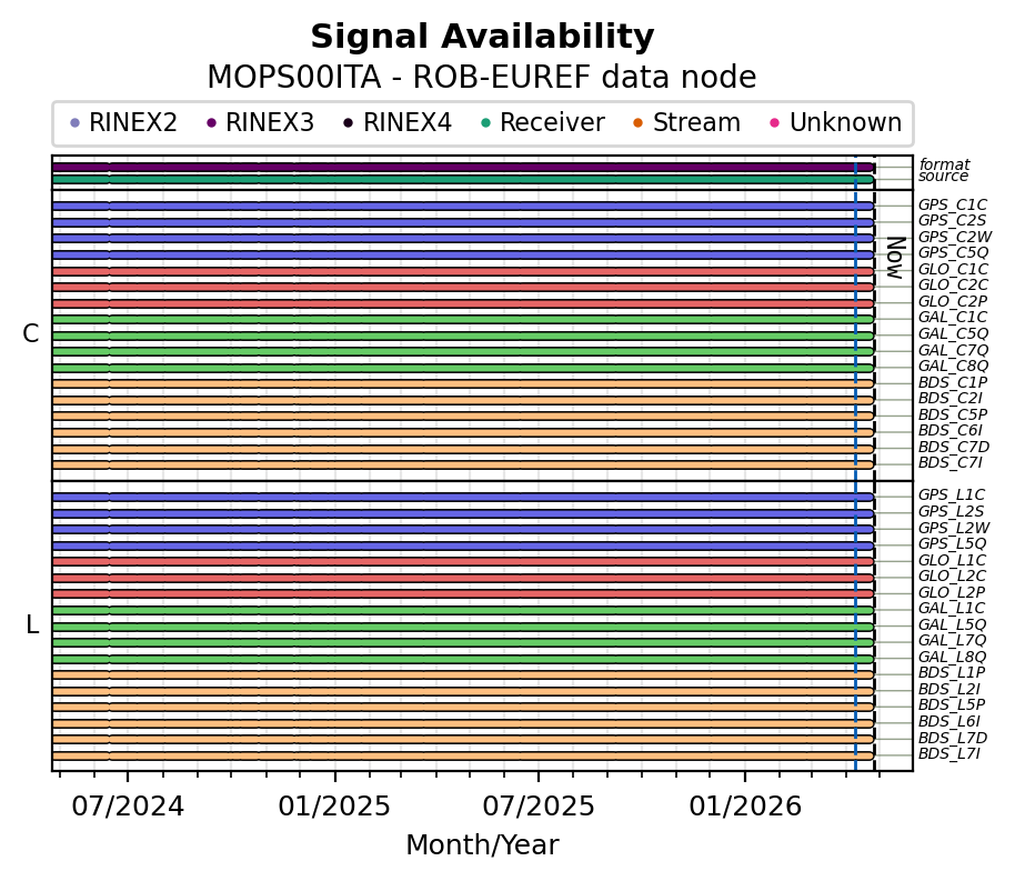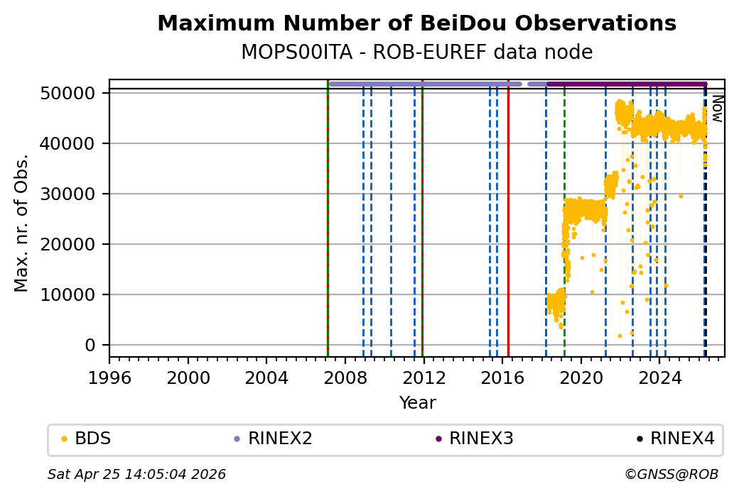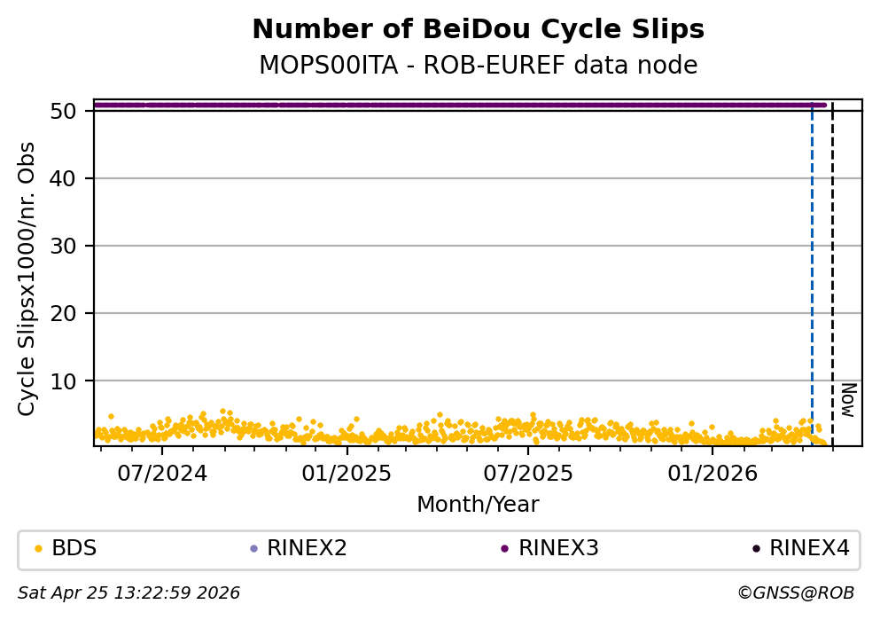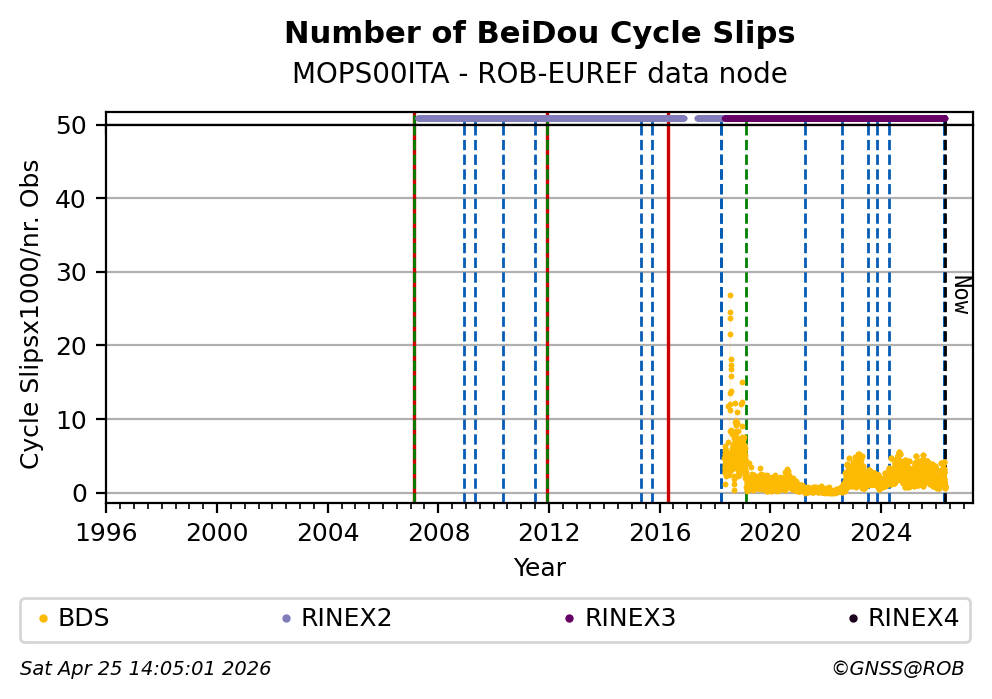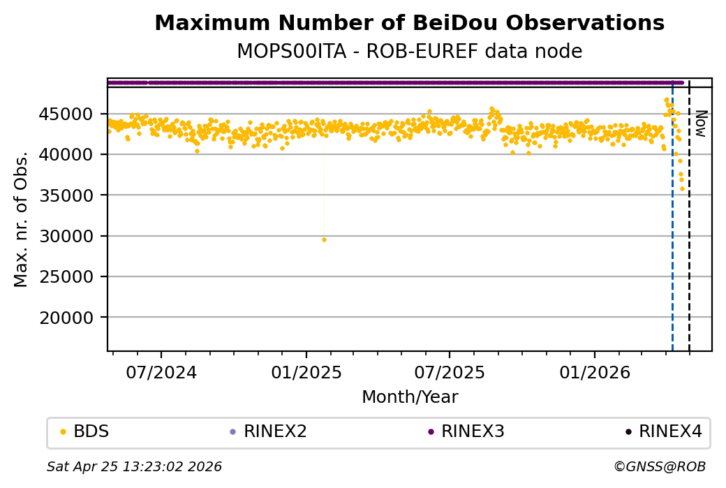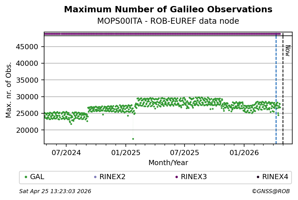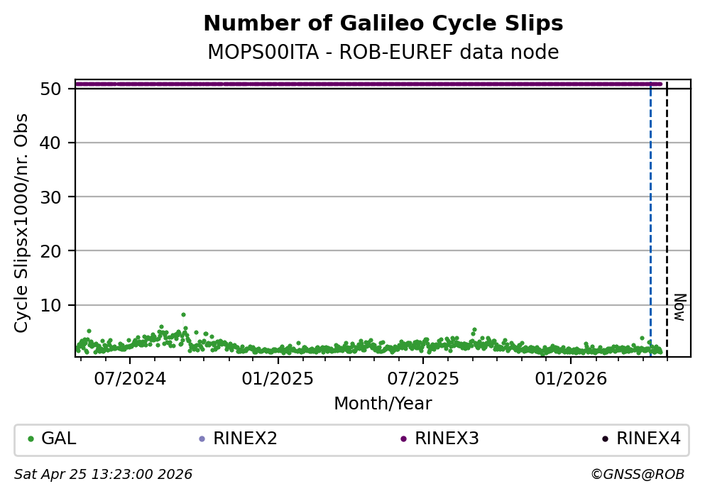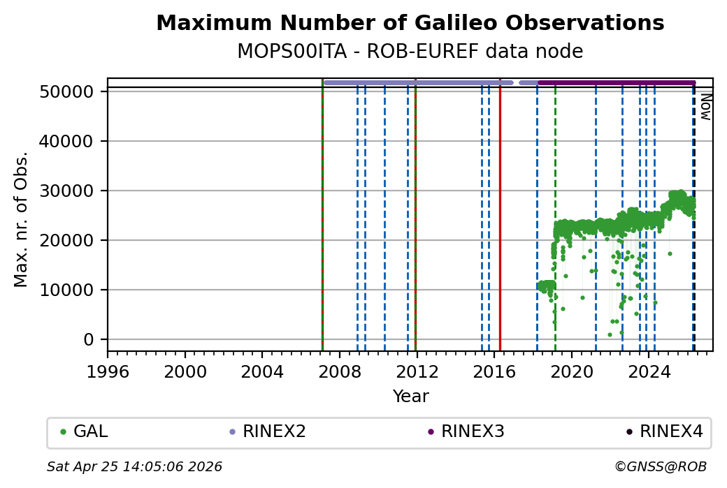 The plots below present the long-term tracking performance of the EPOS-GNSS station MOPS00ITA based on the daily RINEX data available from the ROB-EUREF EPOS-GNSS data node. The data quality metrics have been computed at the data node using the G-Nut/Anubis software.