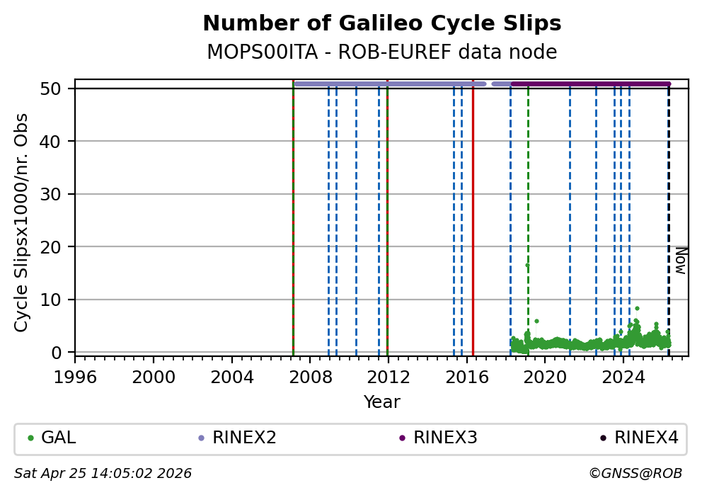 These plots display the number of identified phase cycle slips for each constellation tracked by the station.