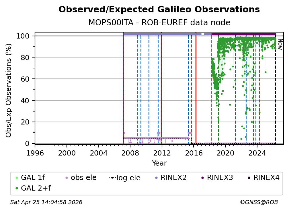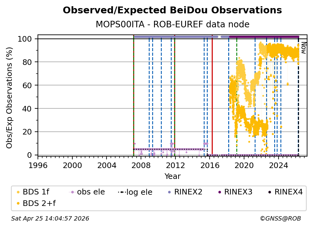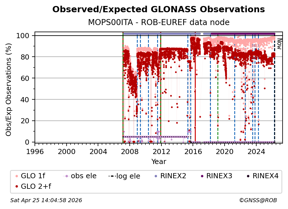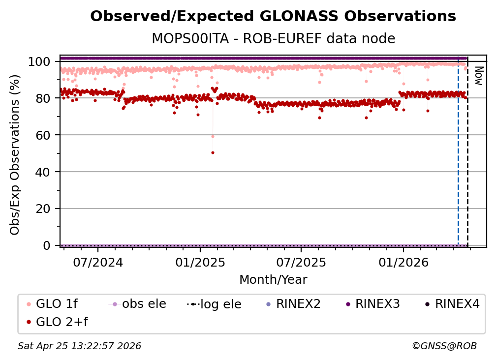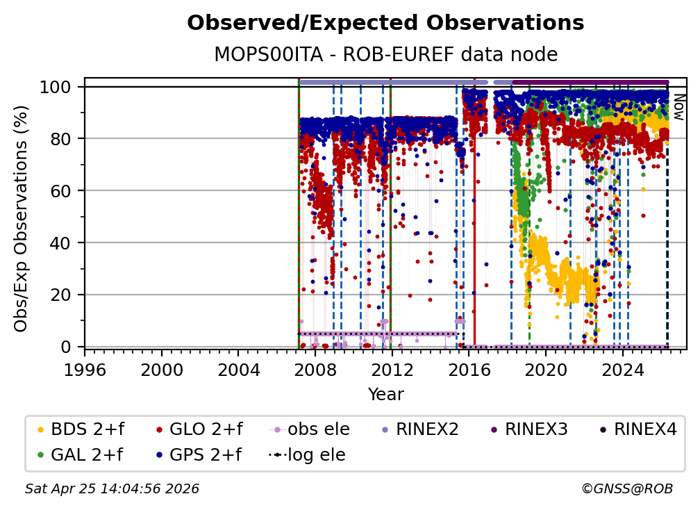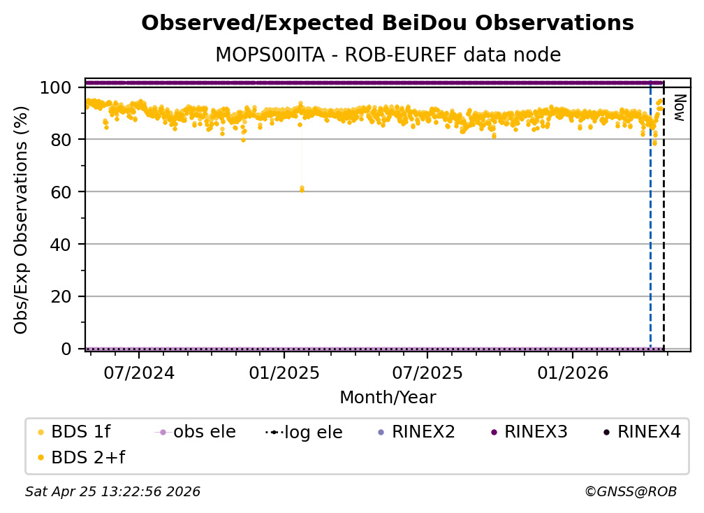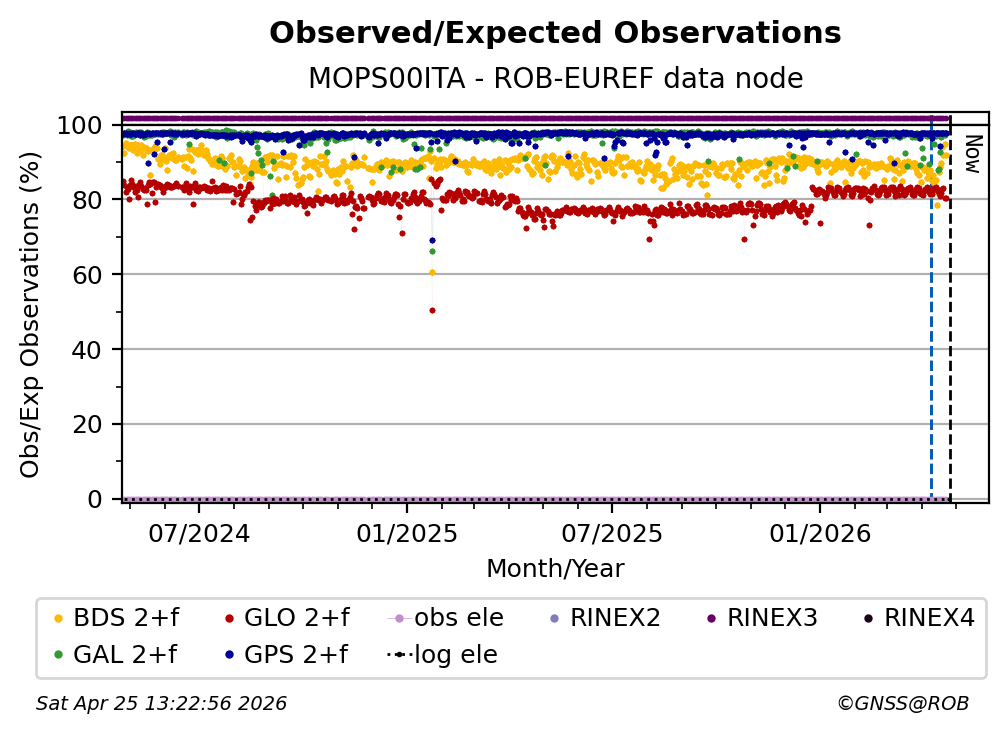 The percentage corresponds, for each constellation tracked by the station, to the ratio of the number of observations in the daily RINEX file with respect to the number of expected observations: