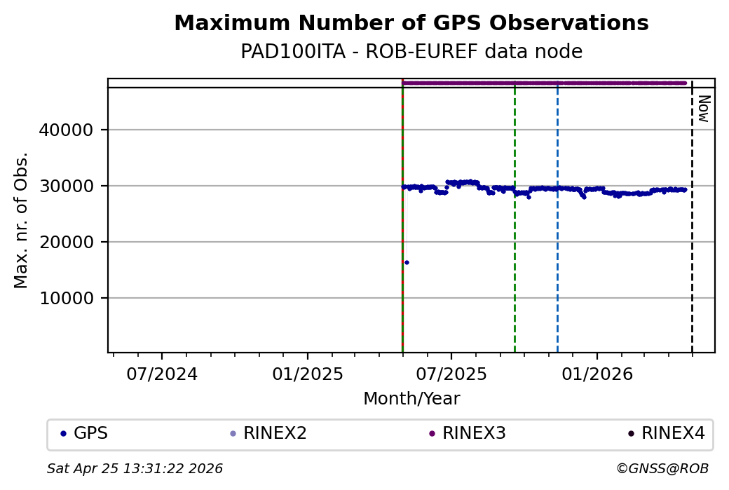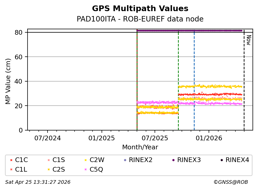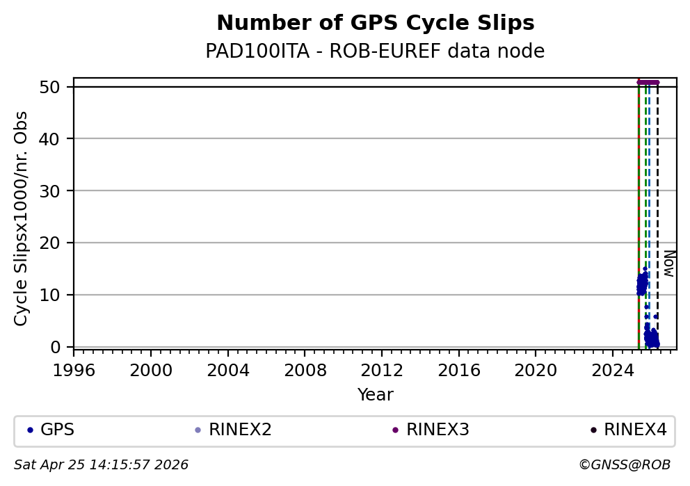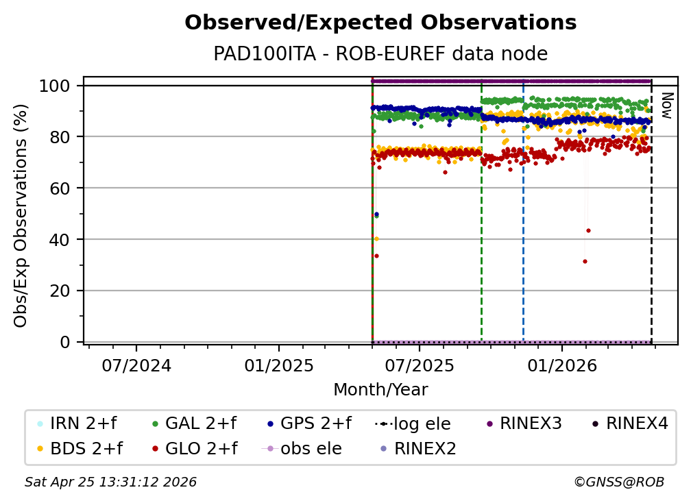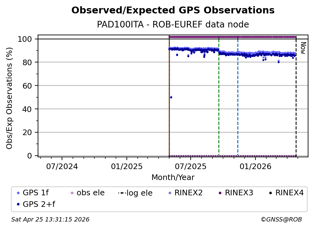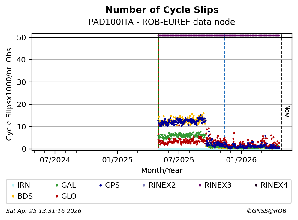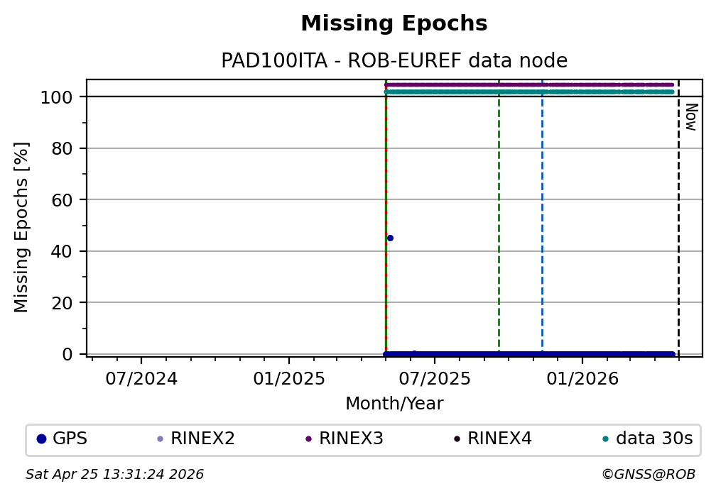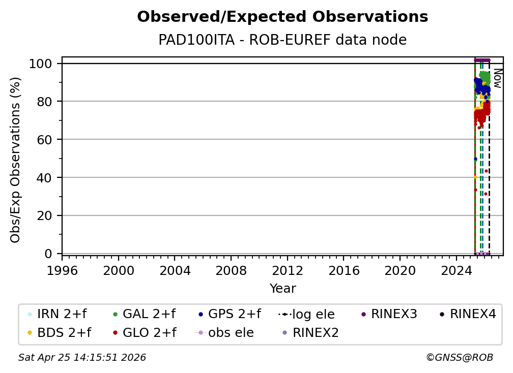 The plots below present the long-term tracking performance of the EPOS-GNSS station PAD100ITA based on the daily RINEX data available from the ROB-EUREF EPOS-GNSS data node. The data quality metrics have been computed at the data node using the G-Nut/Anubis software.