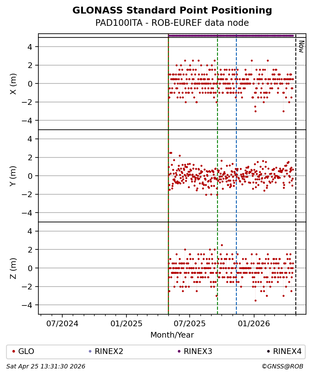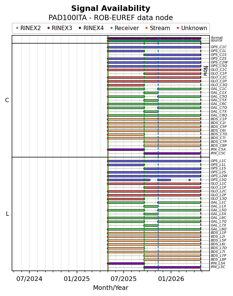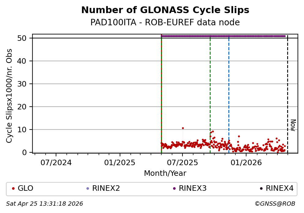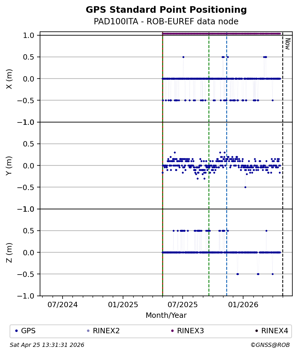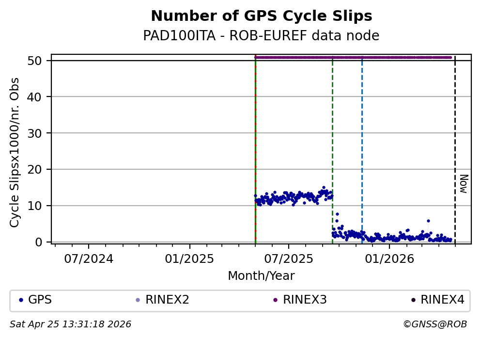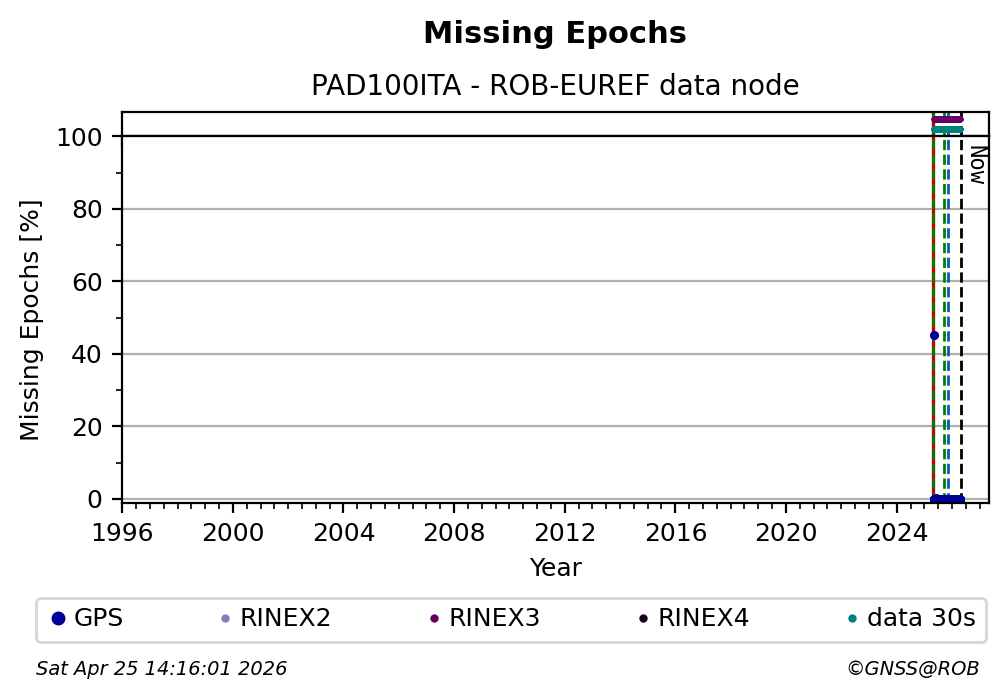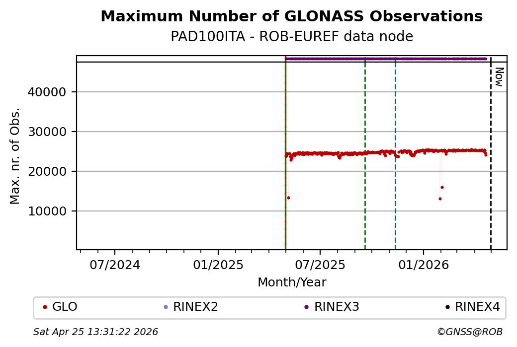 The plots below present the long-term tracking performance of the EPOS-GNSS station PAD100ITA based on the daily RINEX data available from the ROB-EUREF EPOS-GNSS data node. The data quality metrics have been computed at the data node using the G-Nut/Anubis software.