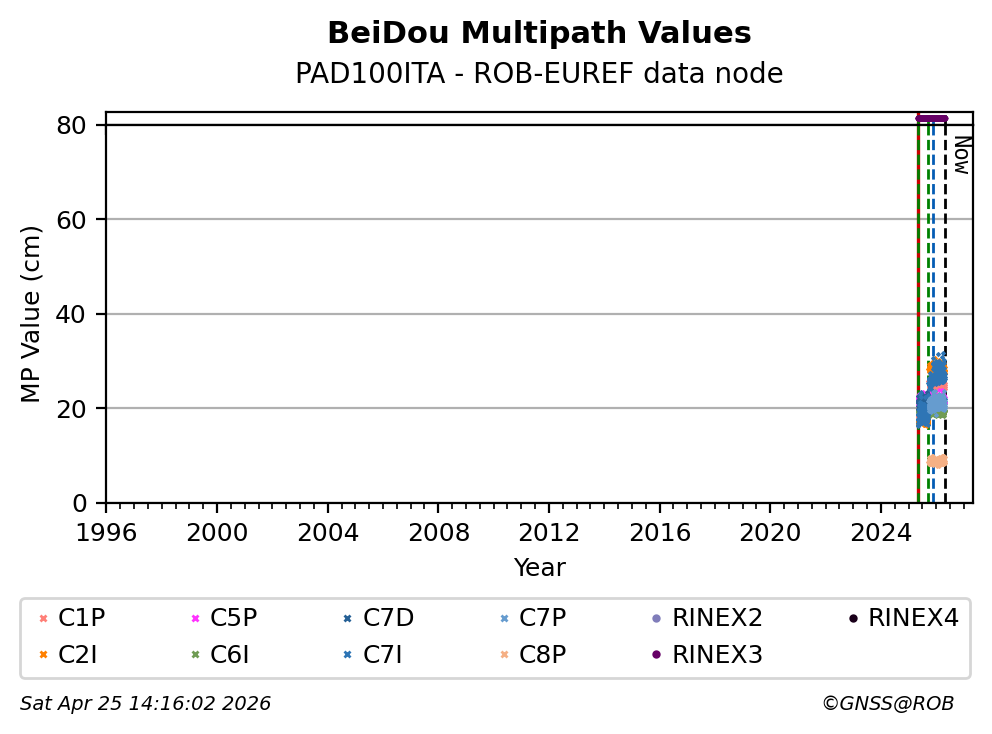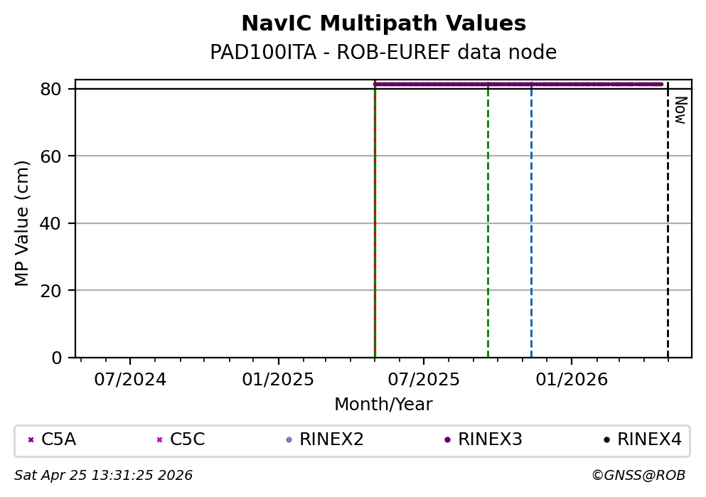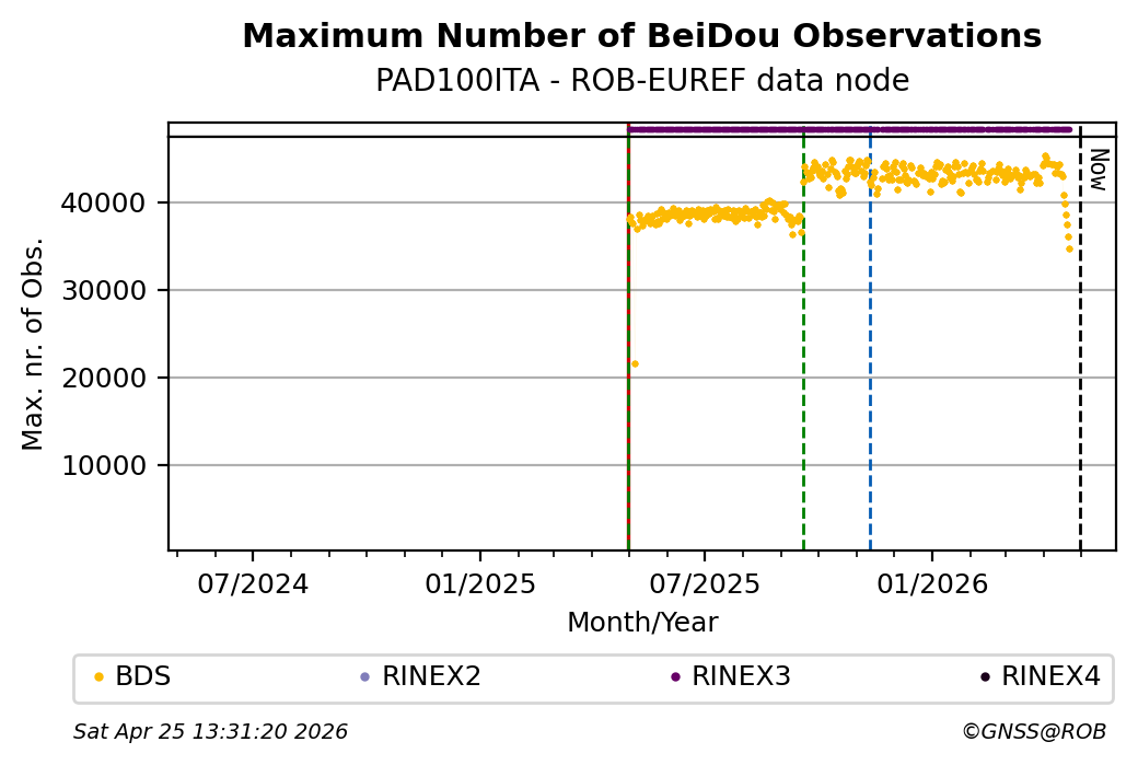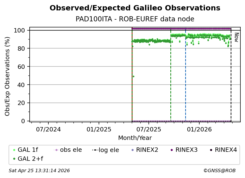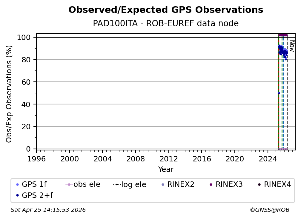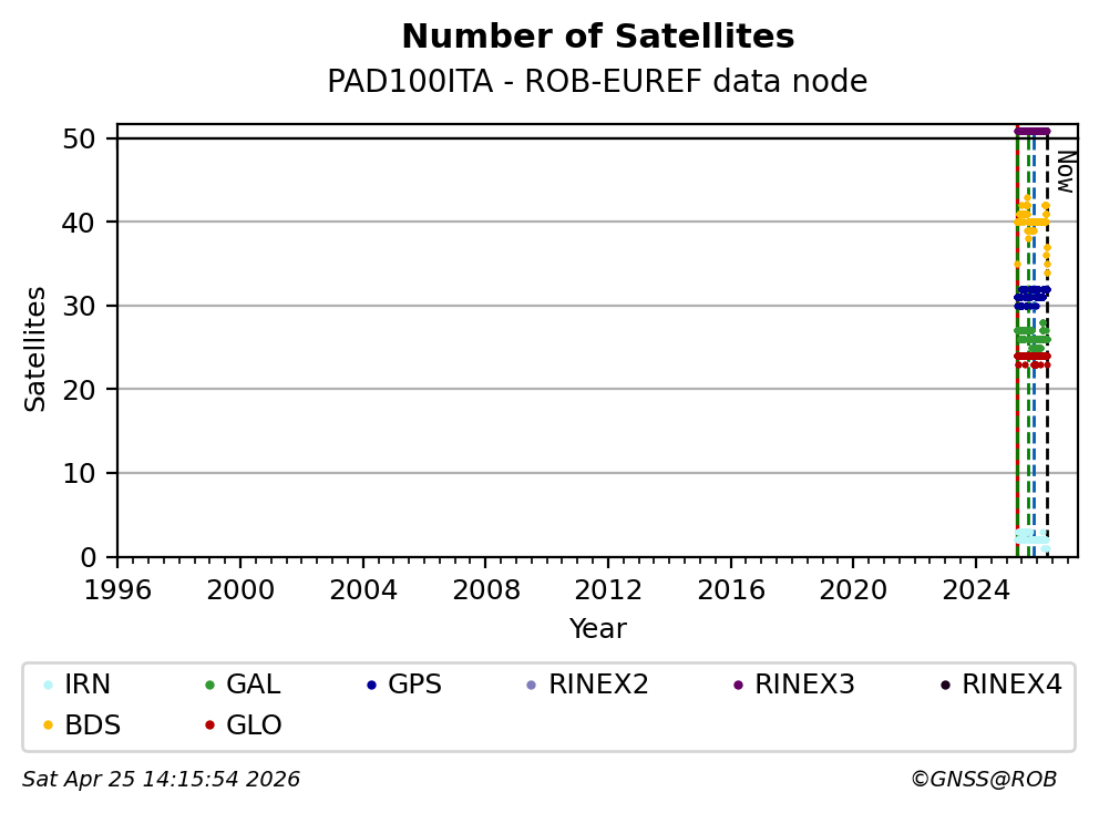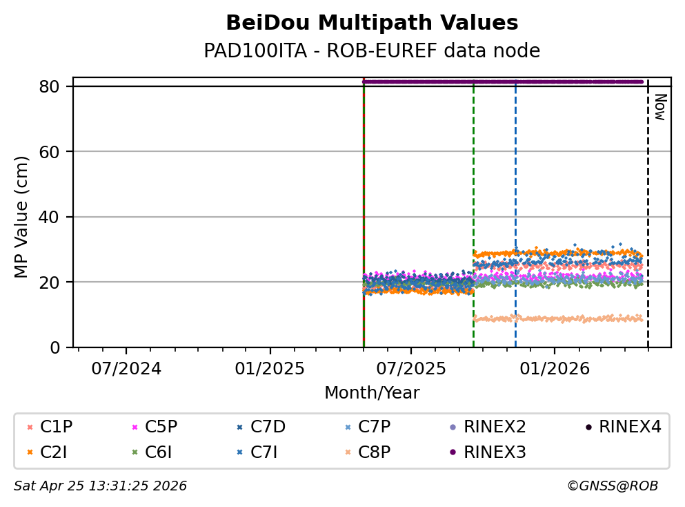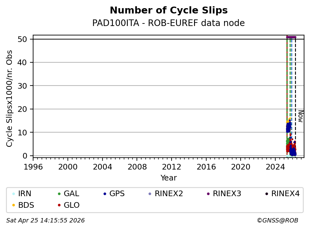 The plots below present the long-term tracking performance of the EPOS-GNSS station PAD100ITA based on the daily RINEX data available from the ROB-EUREF EPOS-GNSS data node. The data quality metrics have been computed at the data node using the G-Nut/Anubis software.