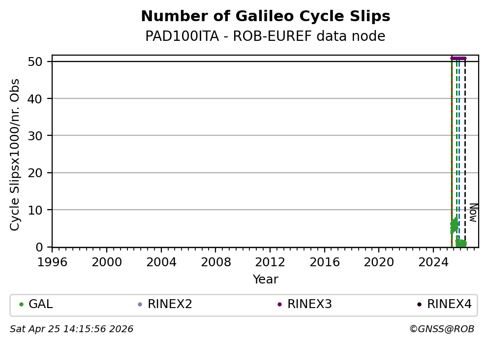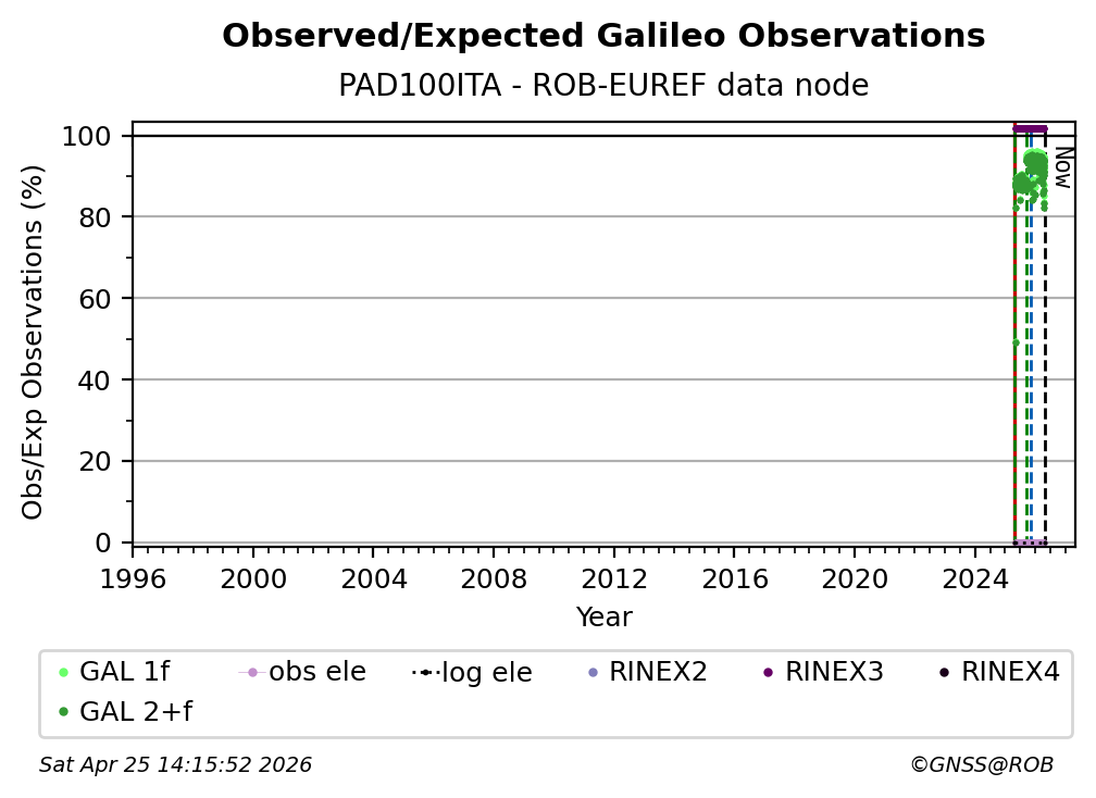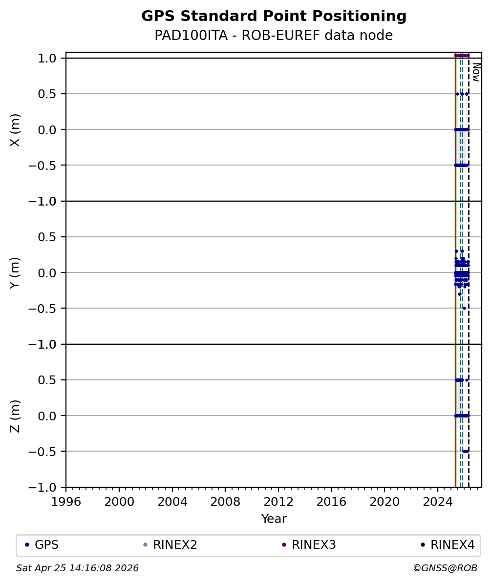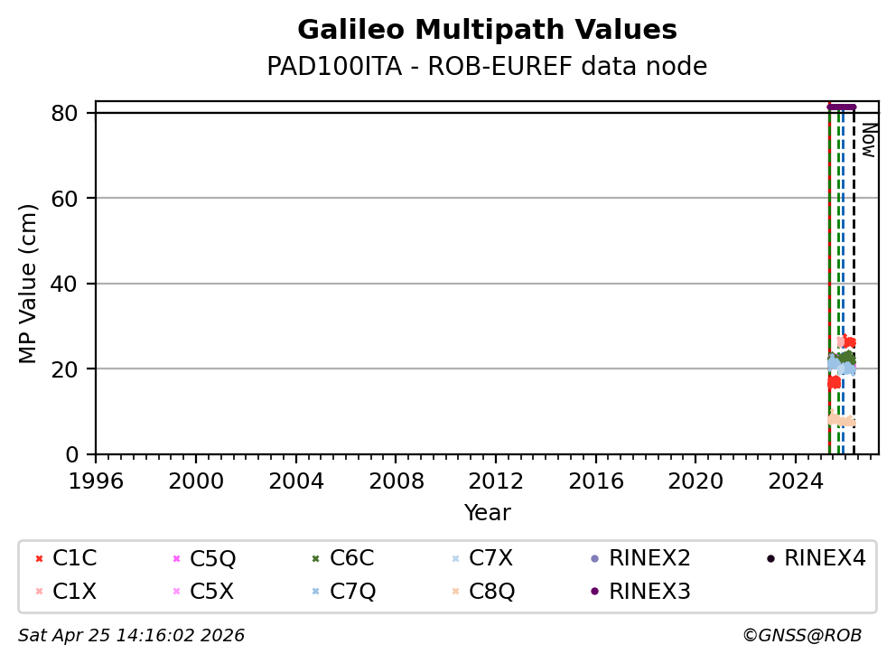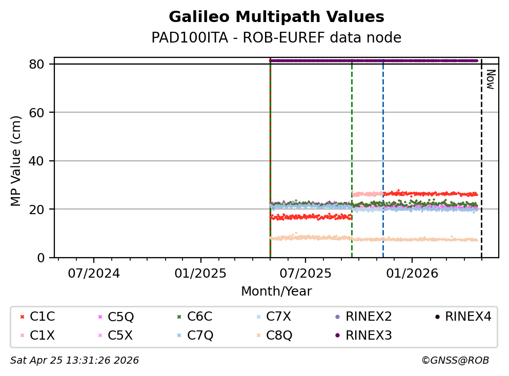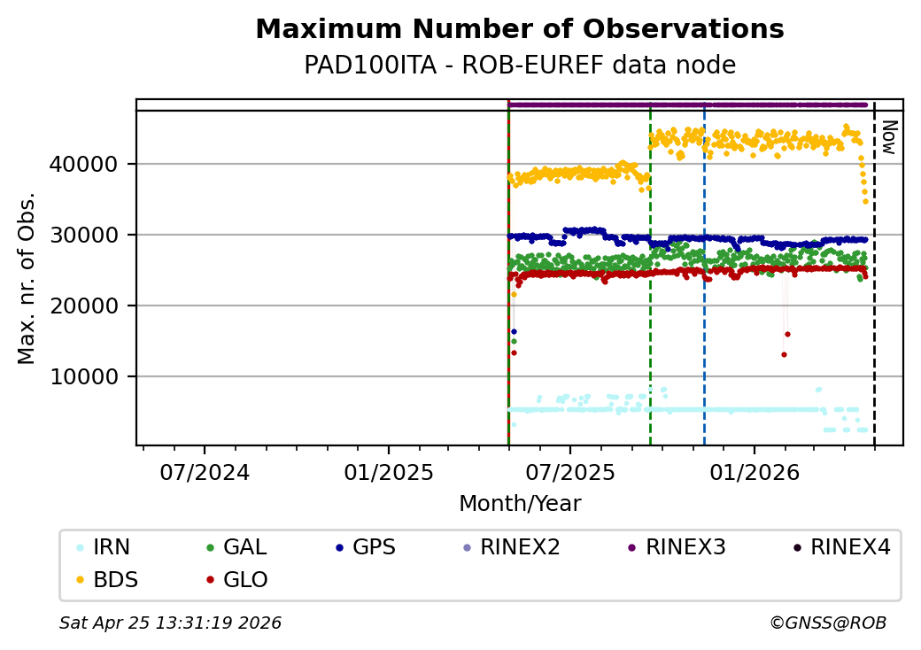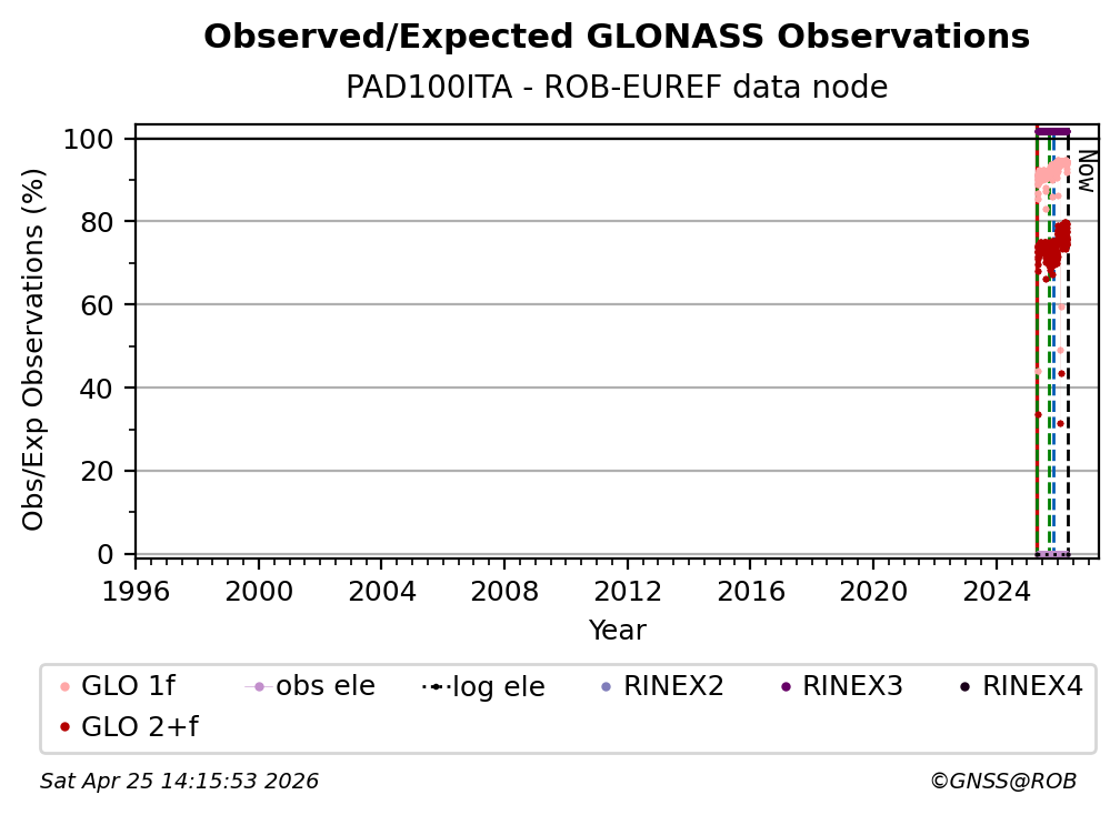 The plots below present the long-term tracking performance of the EPOS-GNSS station PAD100ITA based on the daily RINEX data available from the ROB-EUREF EPOS-GNSS data node. The data quality metrics have been computed at the data node using the G-Nut/Anubis software.