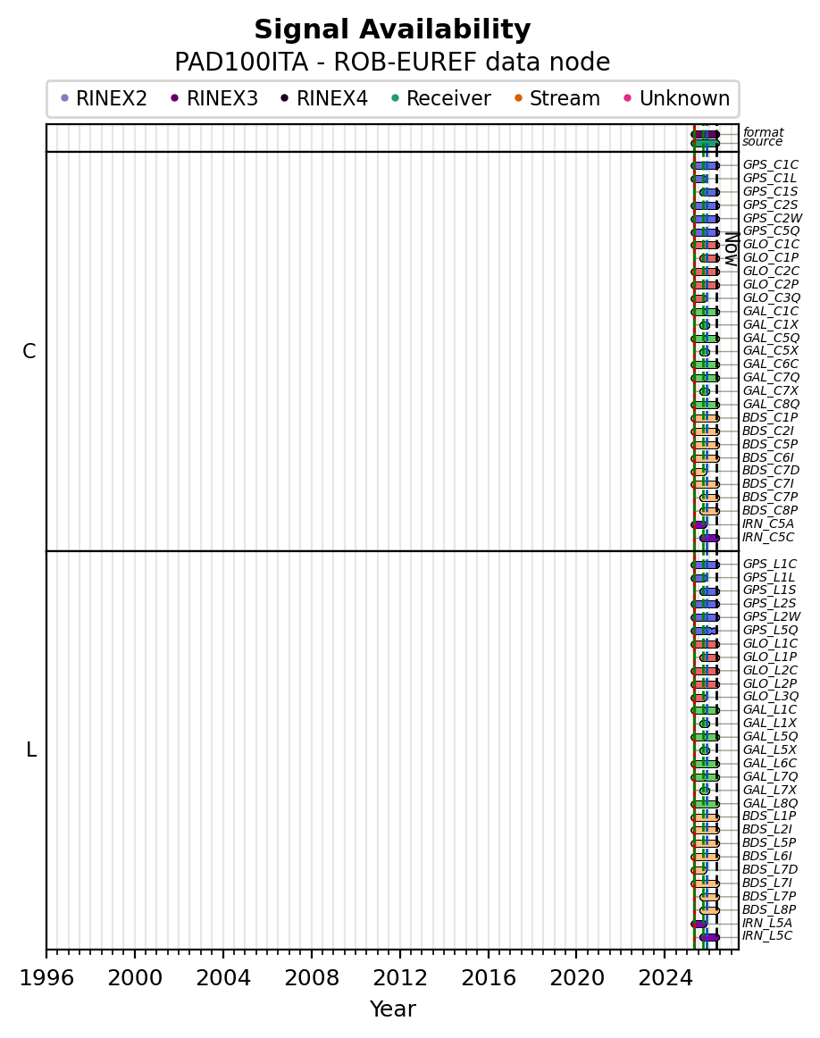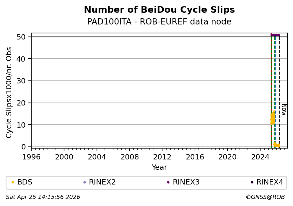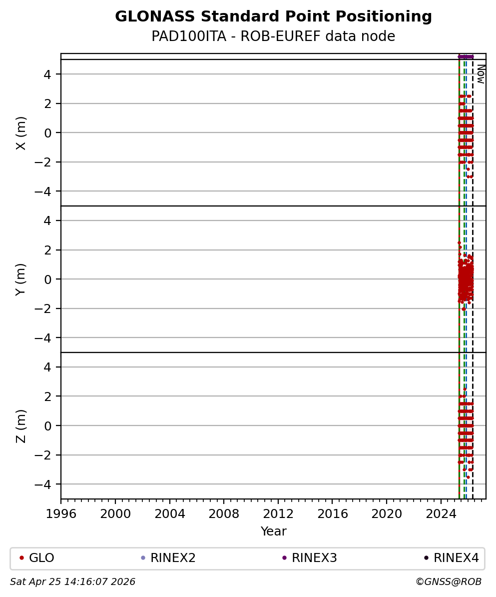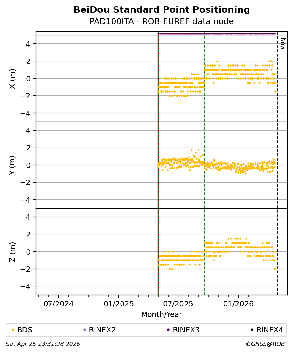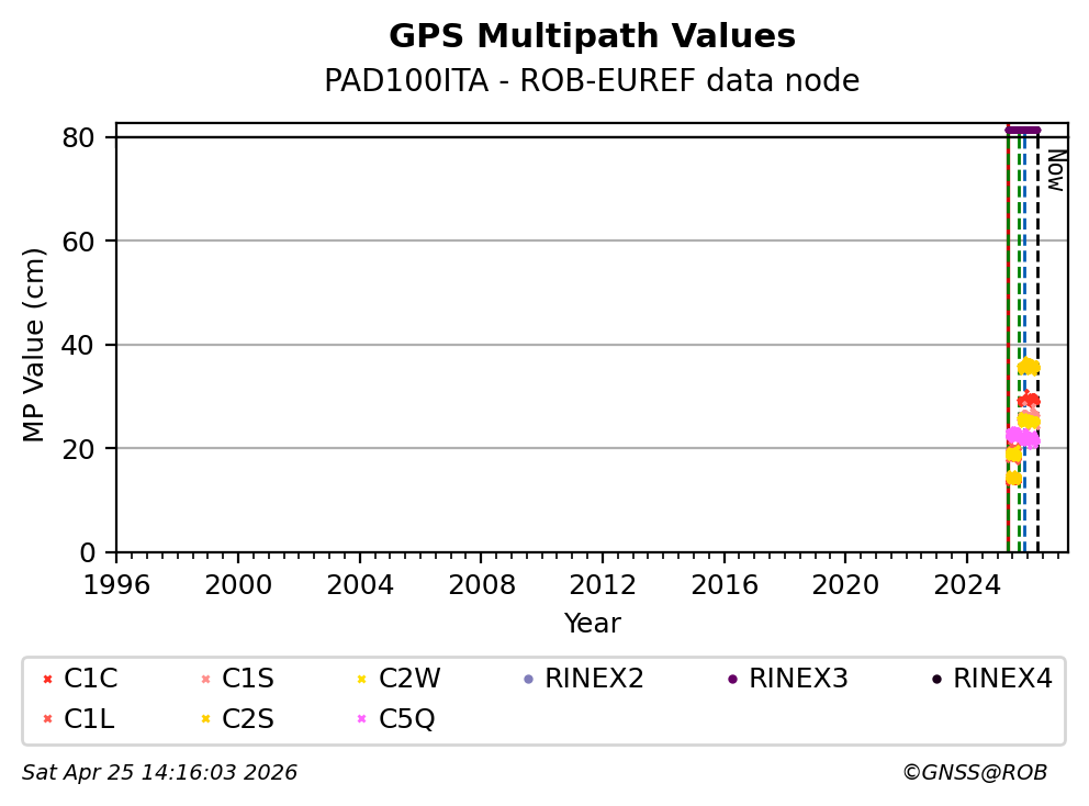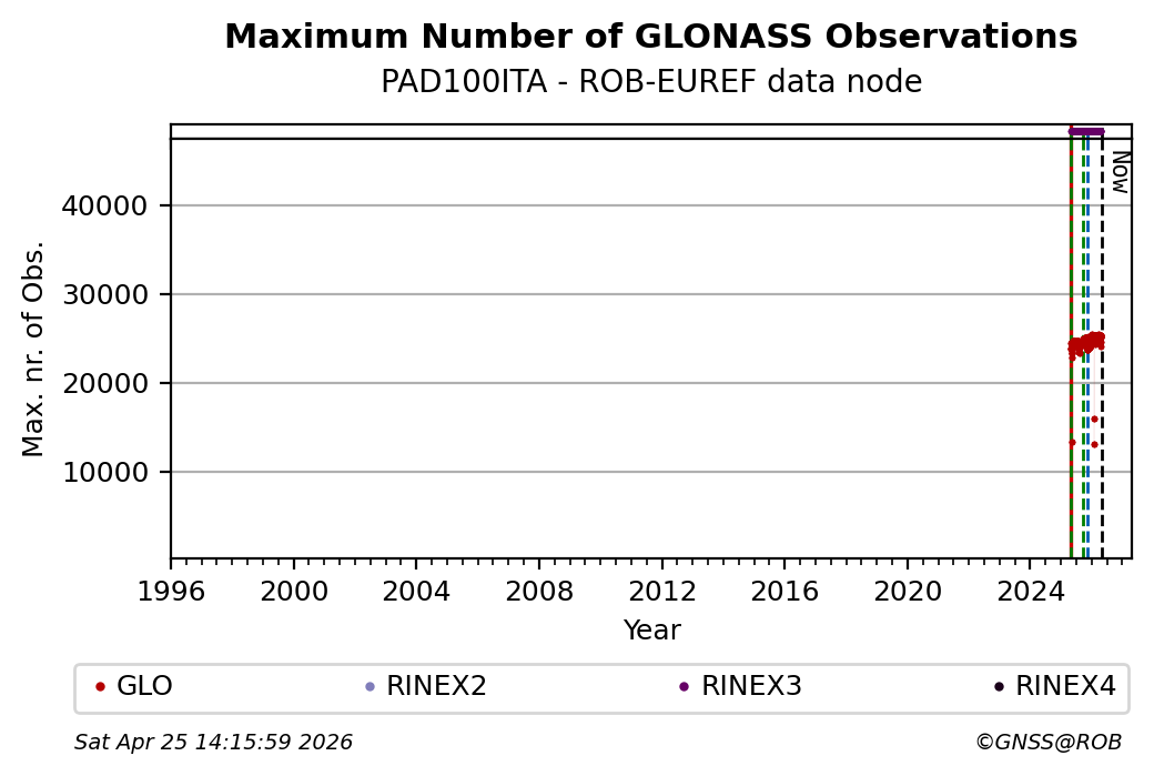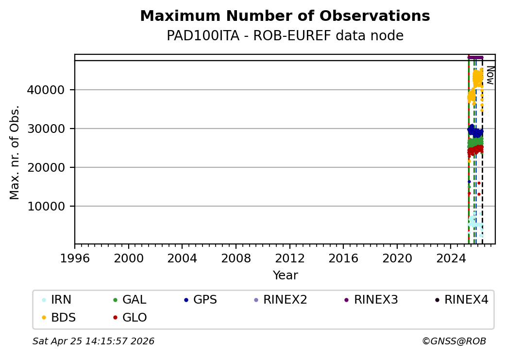 The plots below present the long-term tracking performance of the EPOS-GNSS station PAD100ITA based on the daily RINEX data available from the ROB-EUREF EPOS-GNSS data node. The data quality metrics have been computed at the data node using the G-Nut/Anubis software.