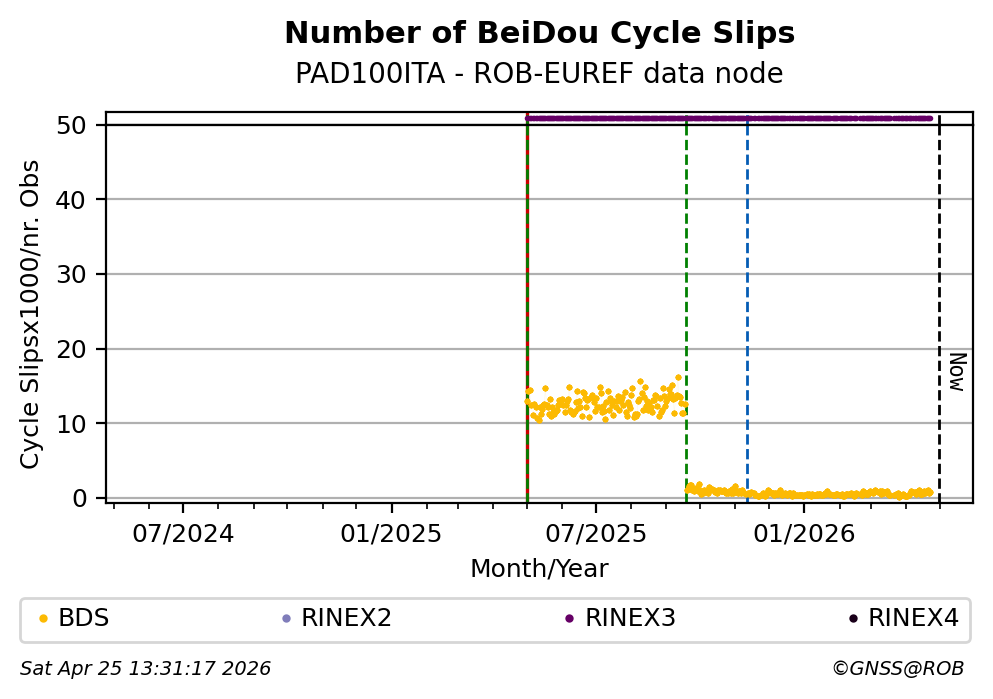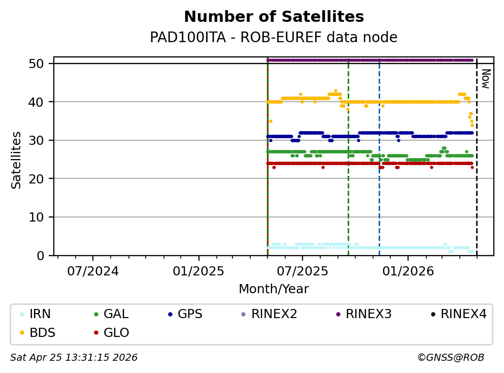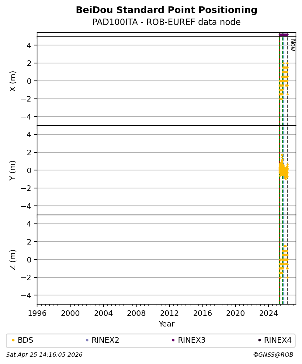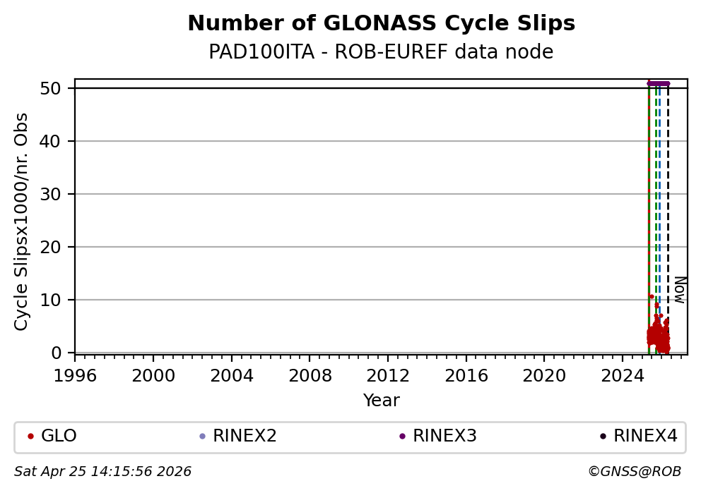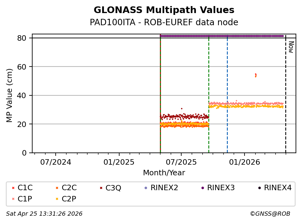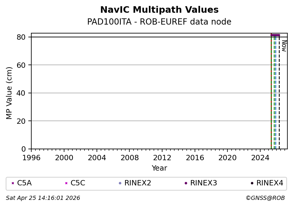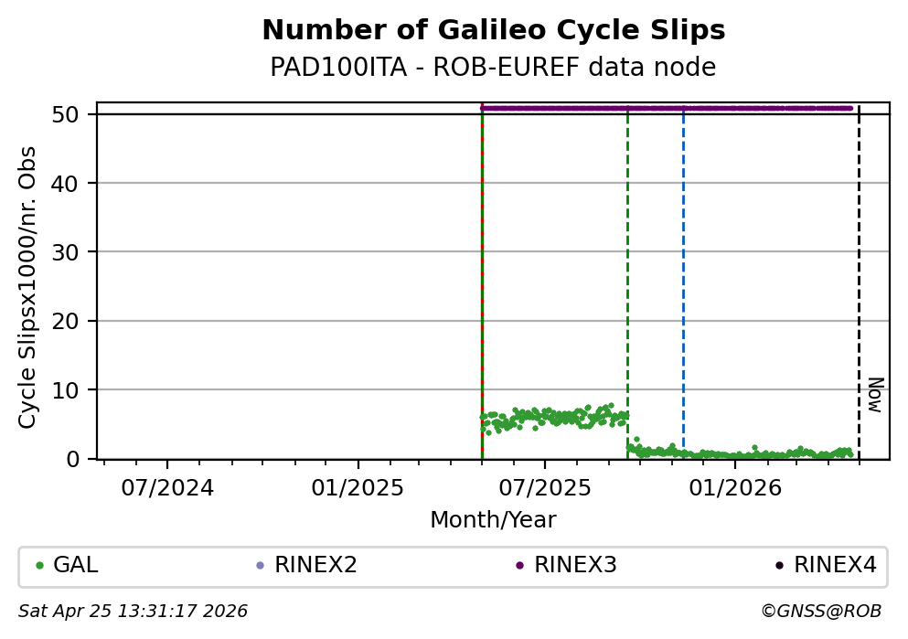 The plots below present the long-term tracking performance of the EPOS-GNSS station PAD100ITA based on the daily RINEX data available from the ROB-EUREF EPOS-GNSS data node. The data quality metrics have been computed at the data node using the G-Nut/Anubis software.