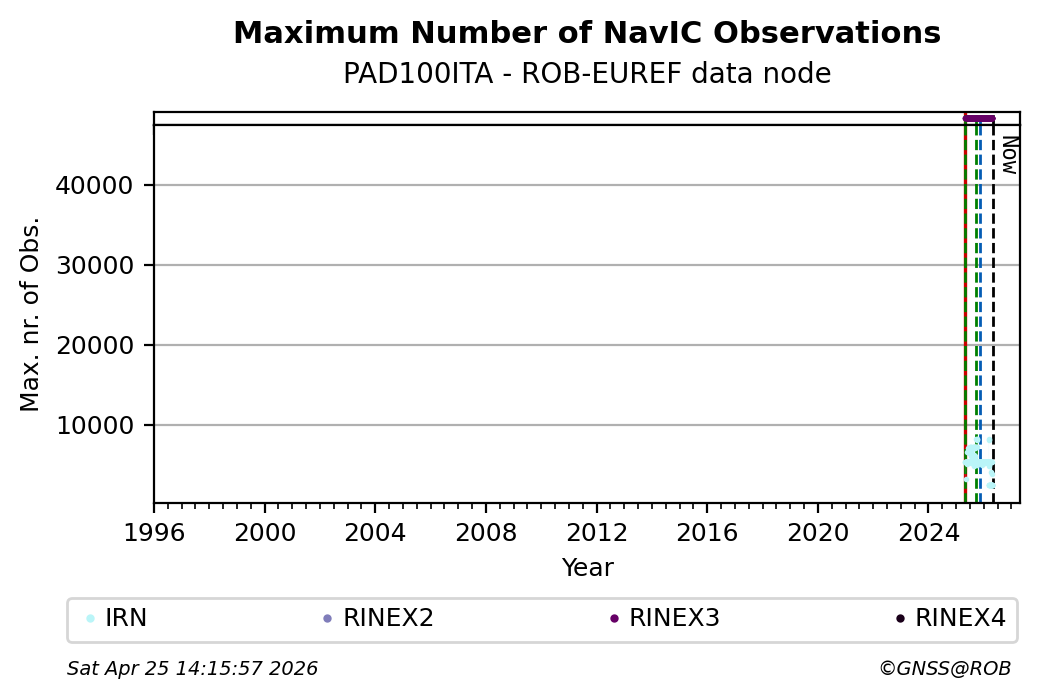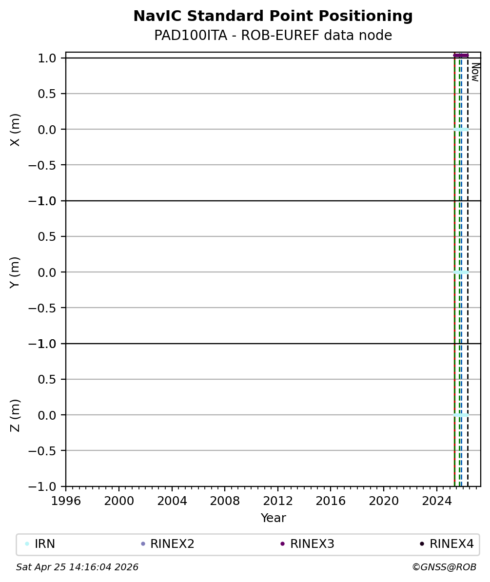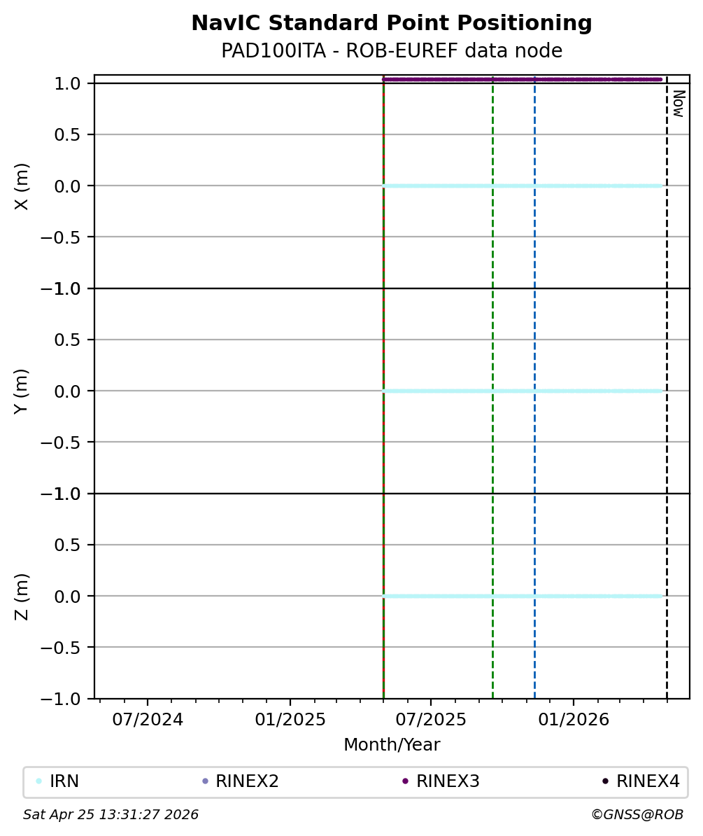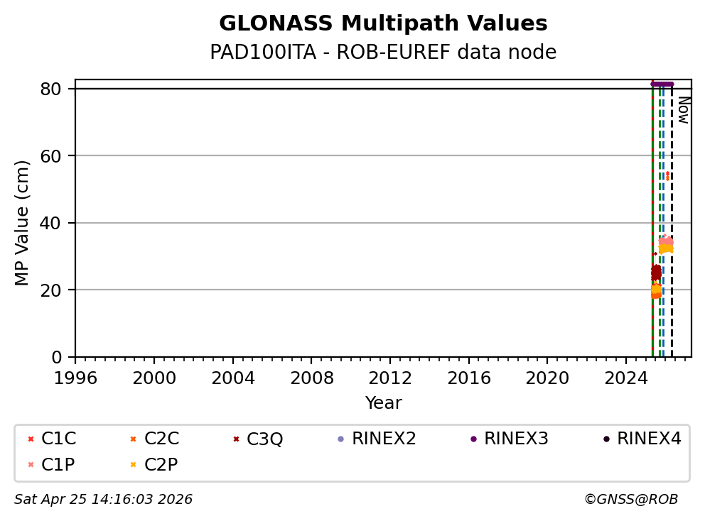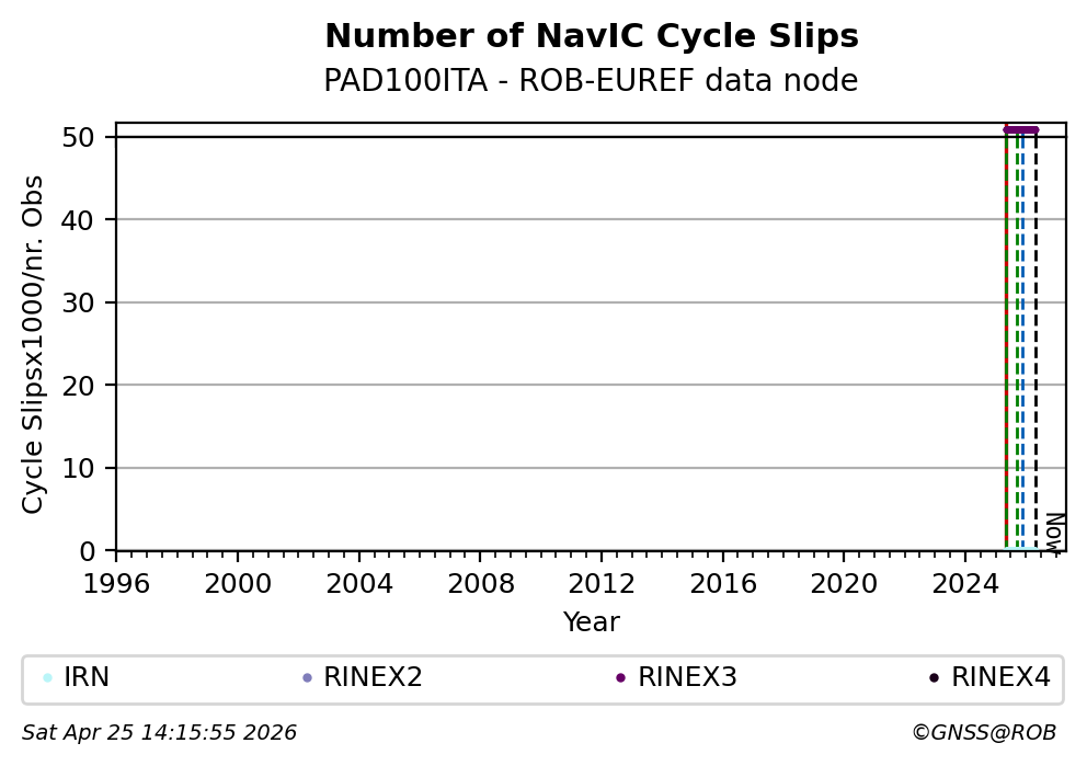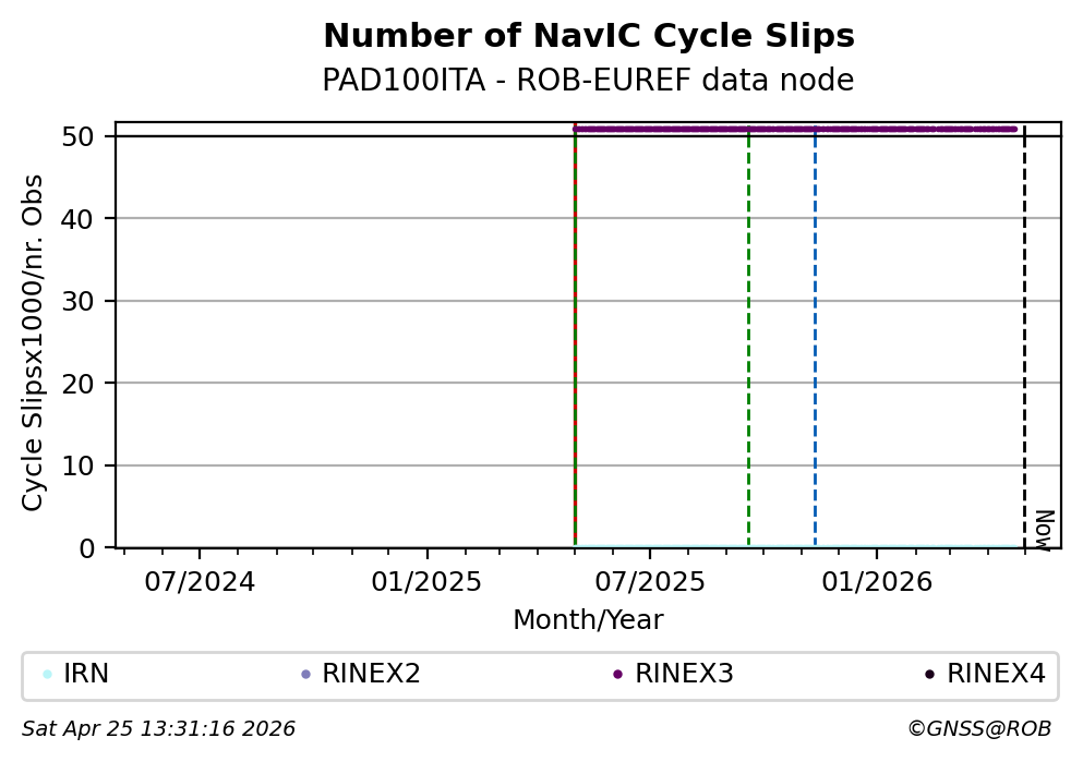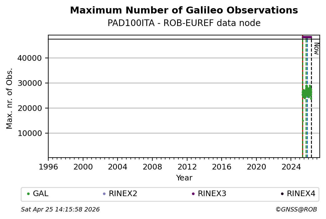 The plots below present the long-term tracking performance of the EPOS-GNSS station PAD100ITA based on the daily RINEX data available from the ROB-EUREF EPOS-GNSS data node. The data quality metrics have been computed at the data node using the G-Nut/Anubis software.