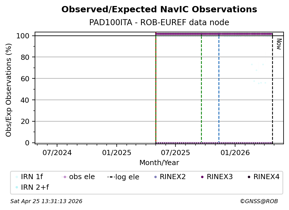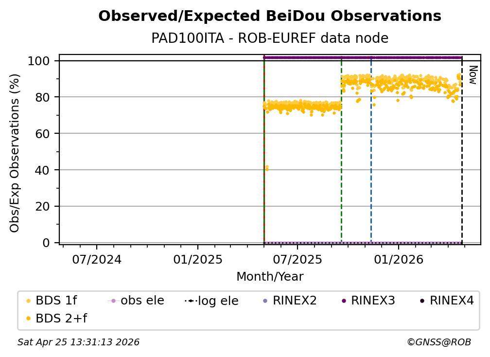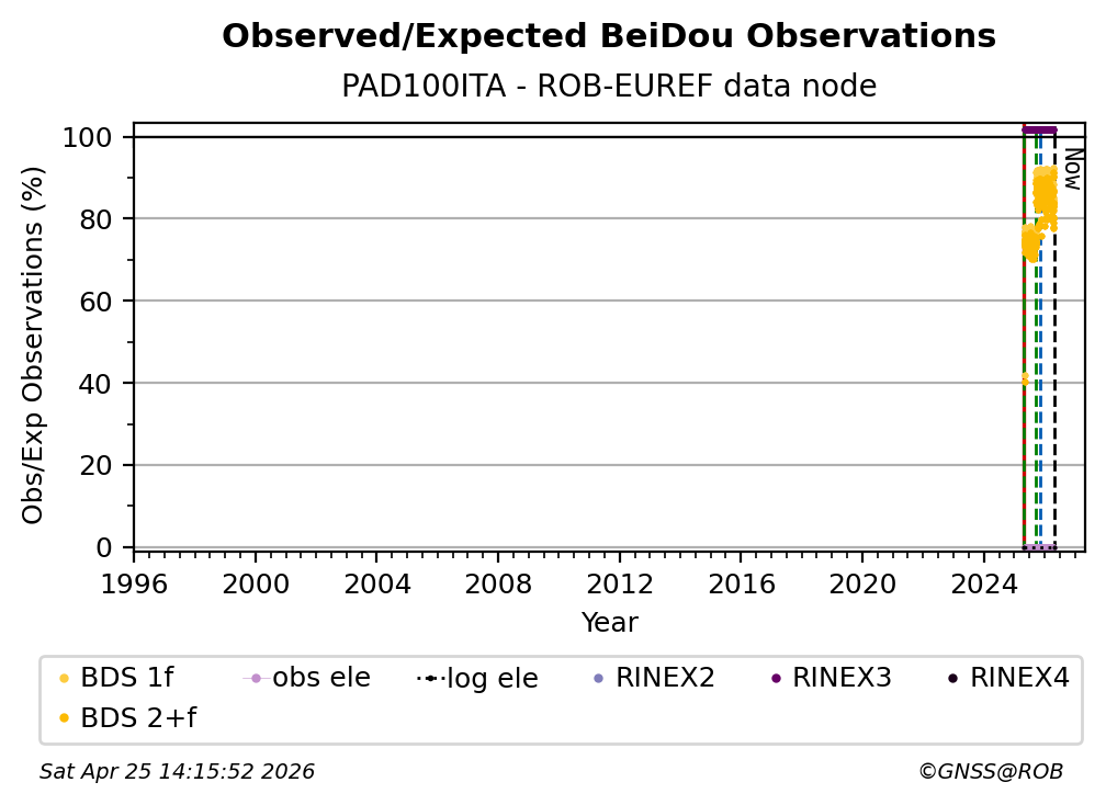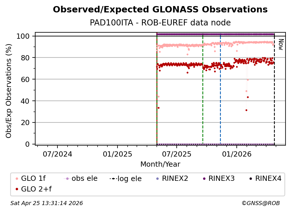 The percentage corresponds, for each constellation tracked by the station, to the ratio of the number of observations in the daily RINEX file with respect to the number of expected observations: