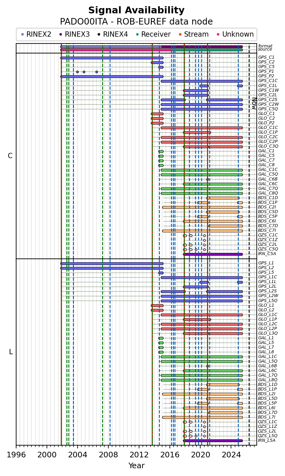 Red vertical lines, green and blue vertical dotted lines indicate respectively a change of antenna, receiver or receiver configuration (including firmware) as indicated by the station manager in the station site log available from the M3G GNSS Metadata Catalog. The purple points in the top of the plot indicate the daily RINEX data availability at the data node.