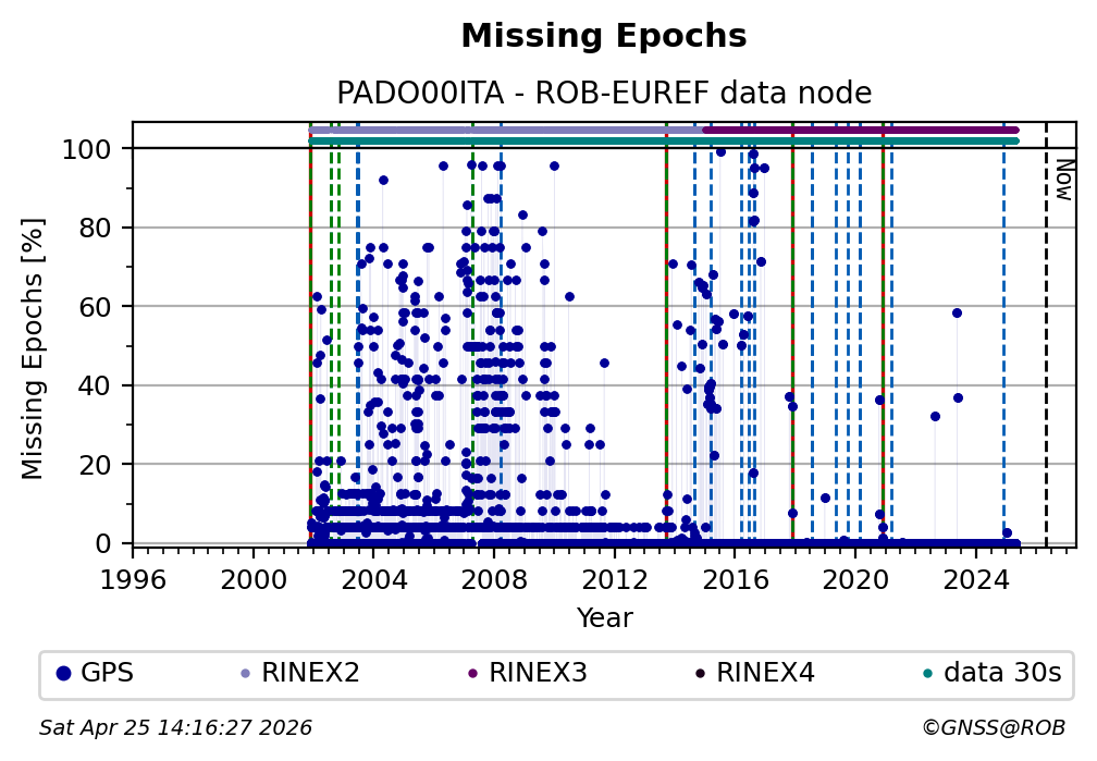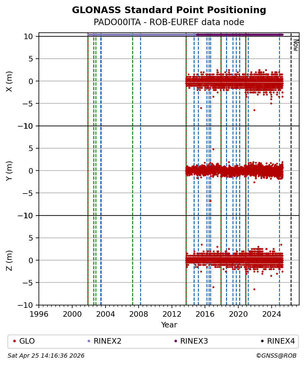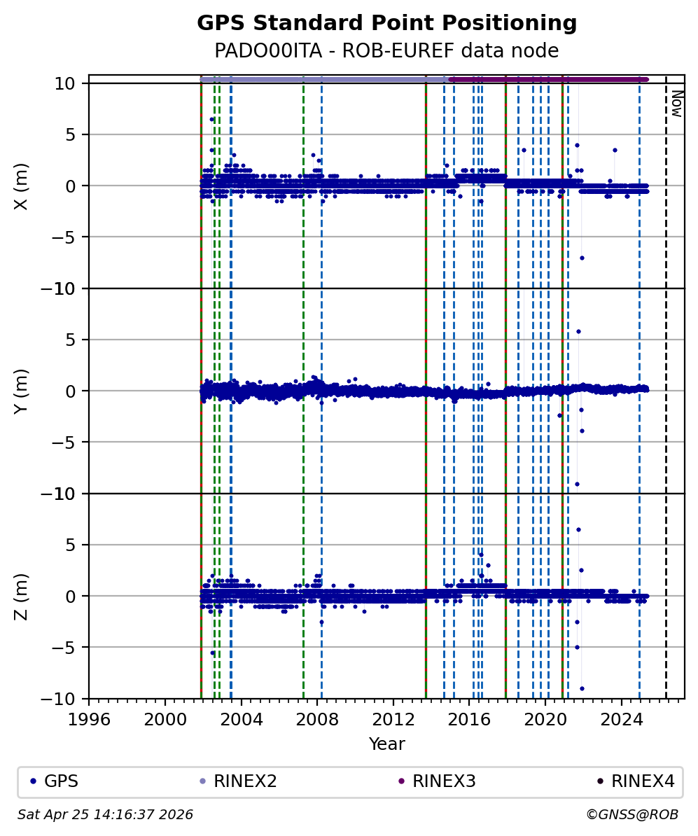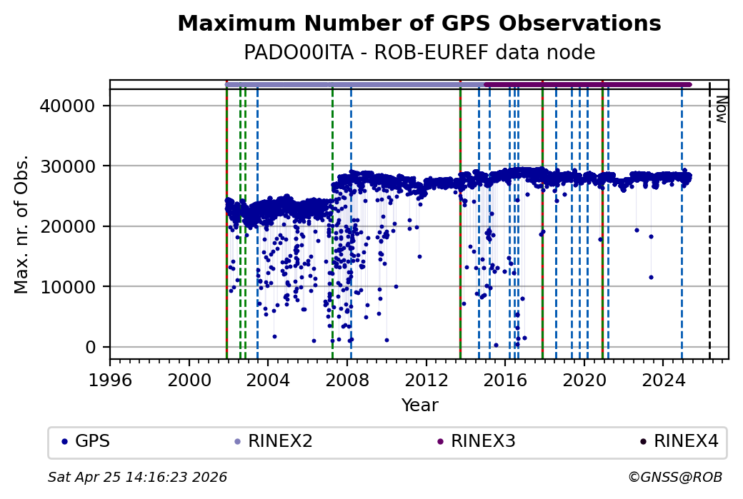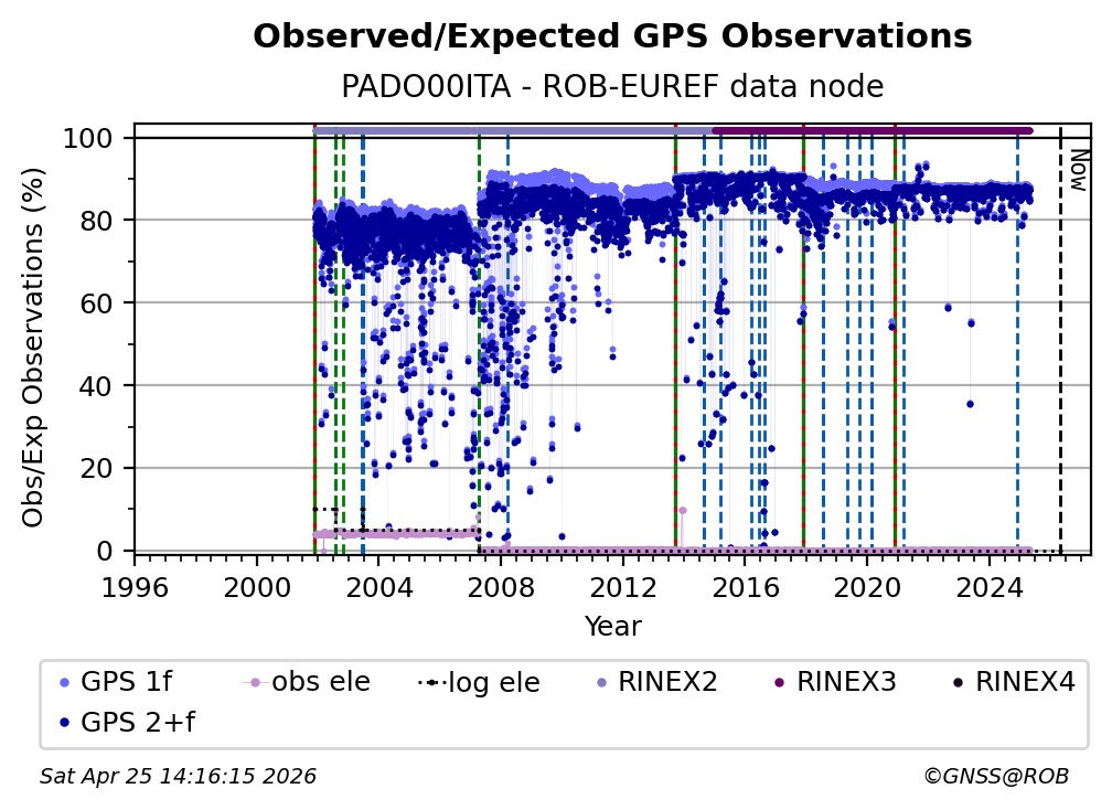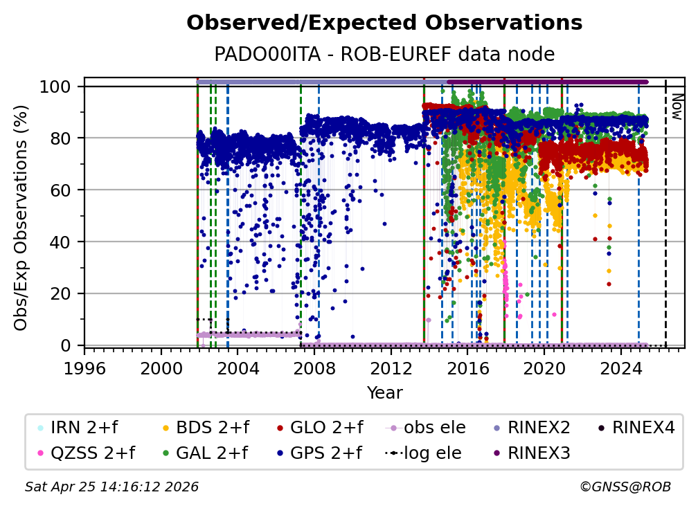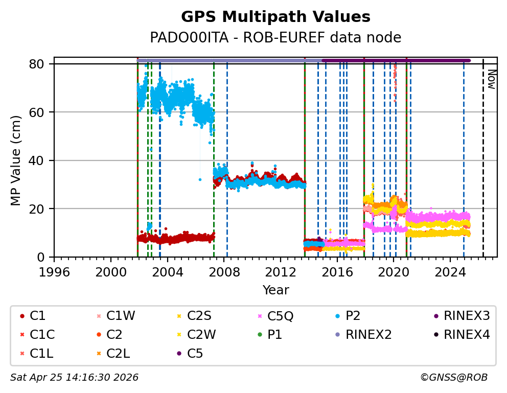 The plots below present the long-term tracking performance of the EPOS-GNSS station PADO00ITA based on the daily RINEX data available from the ROB-EUREF EPOS-GNSS data node. The data quality metrics have been computed at the data node using the G-Nut/Anubis software.