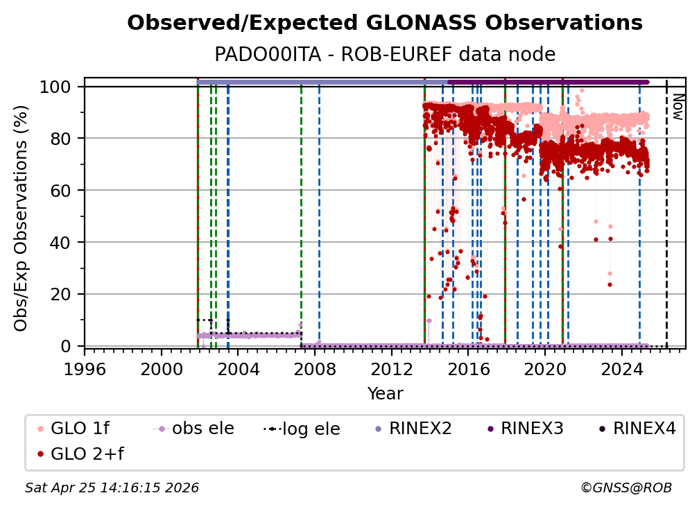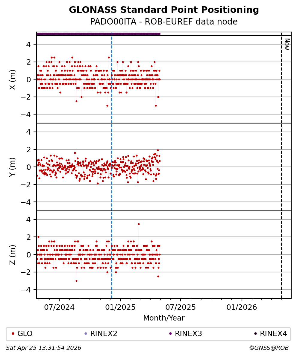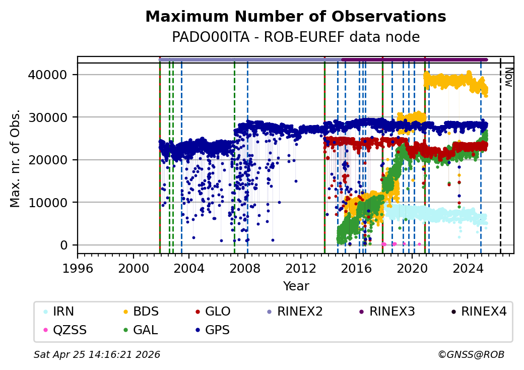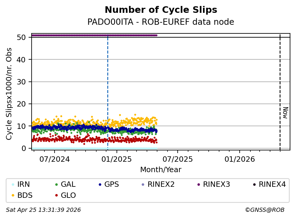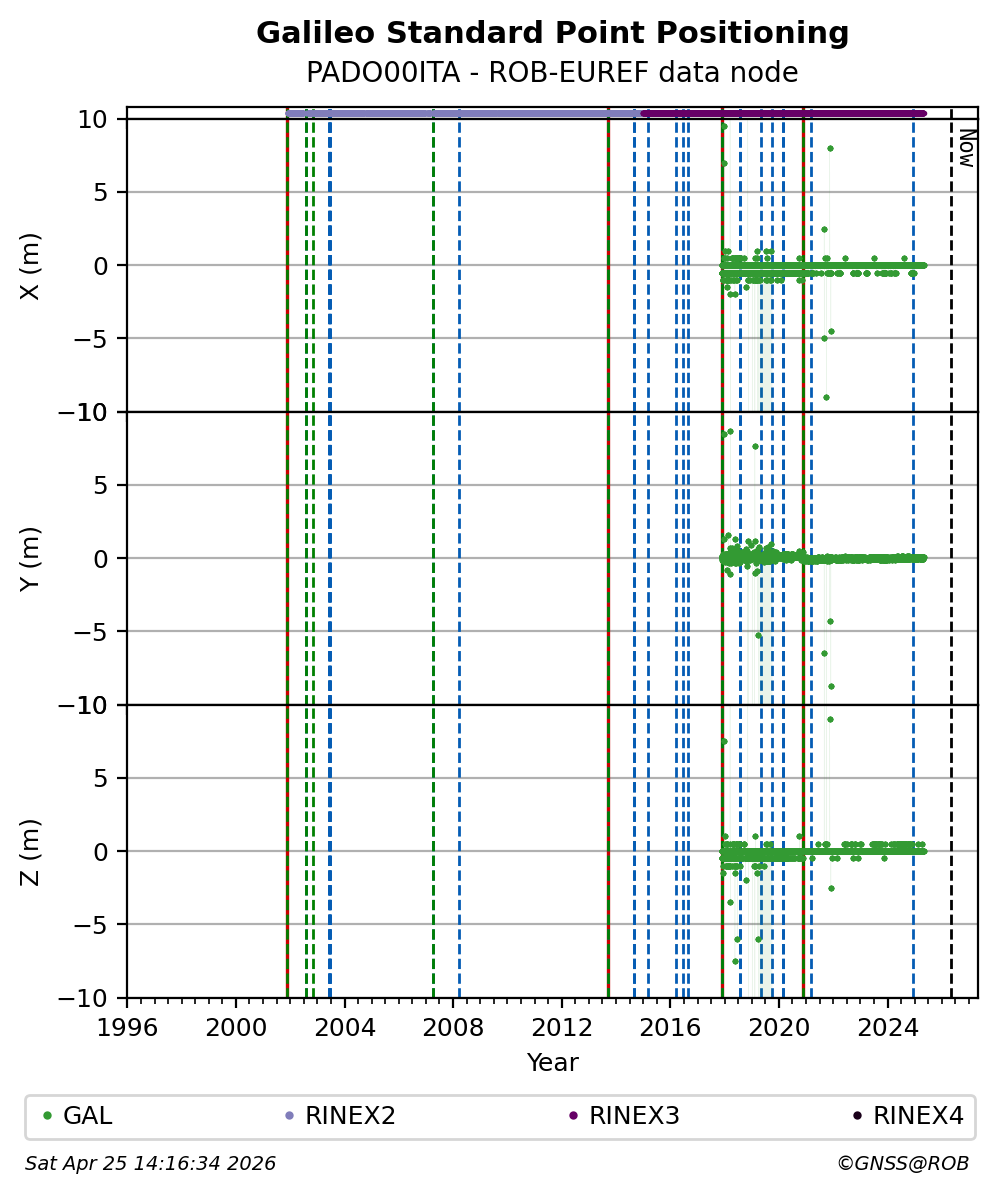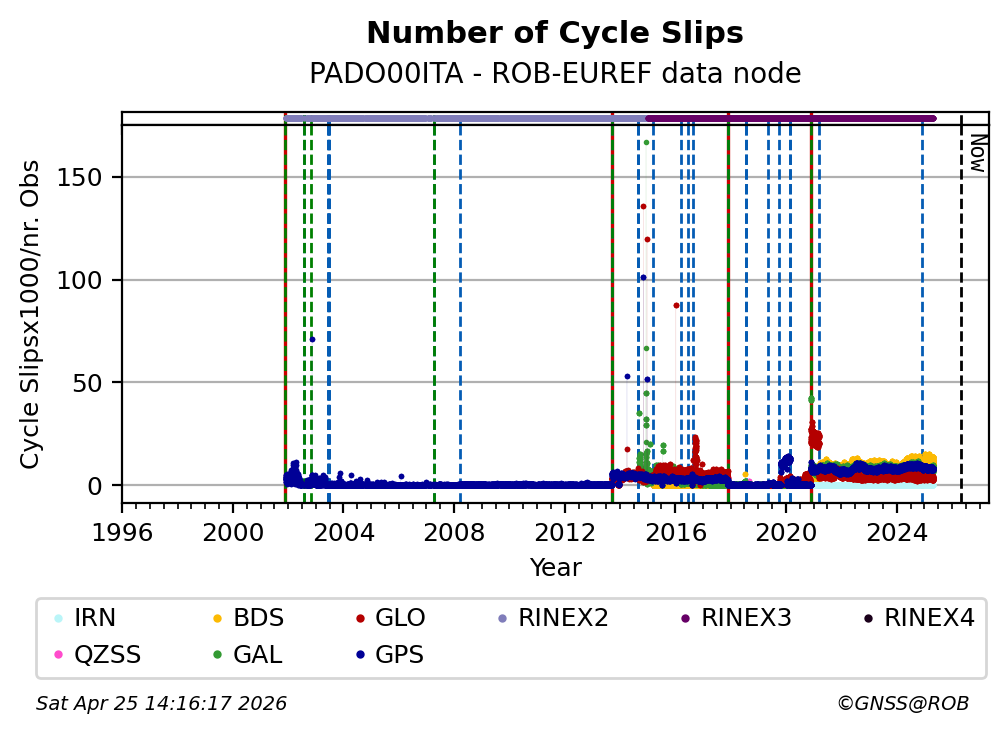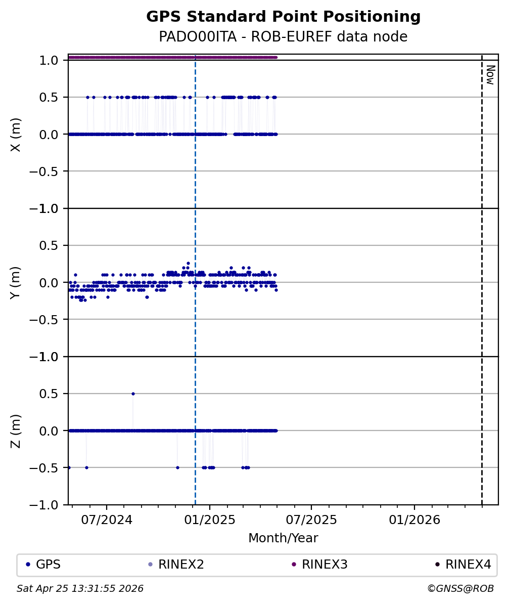 The plots below present the long-term tracking performance of the EPOS-GNSS station PADO00ITA based on the daily RINEX data available from the ROB-EUREF EPOS-GNSS data node. The data quality metrics have been computed at the data node using the G-Nut/Anubis software.