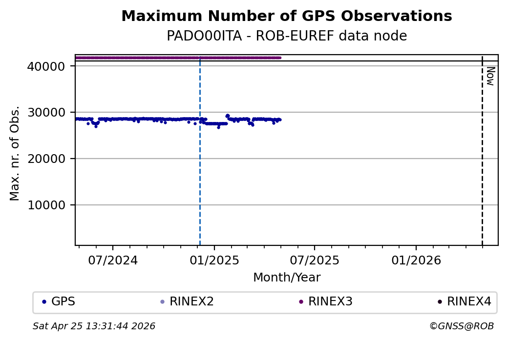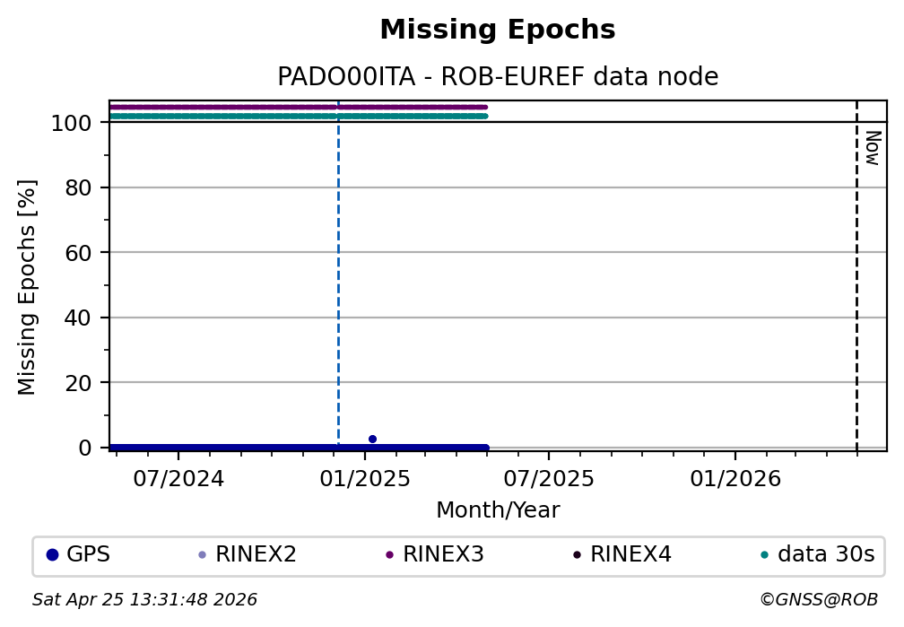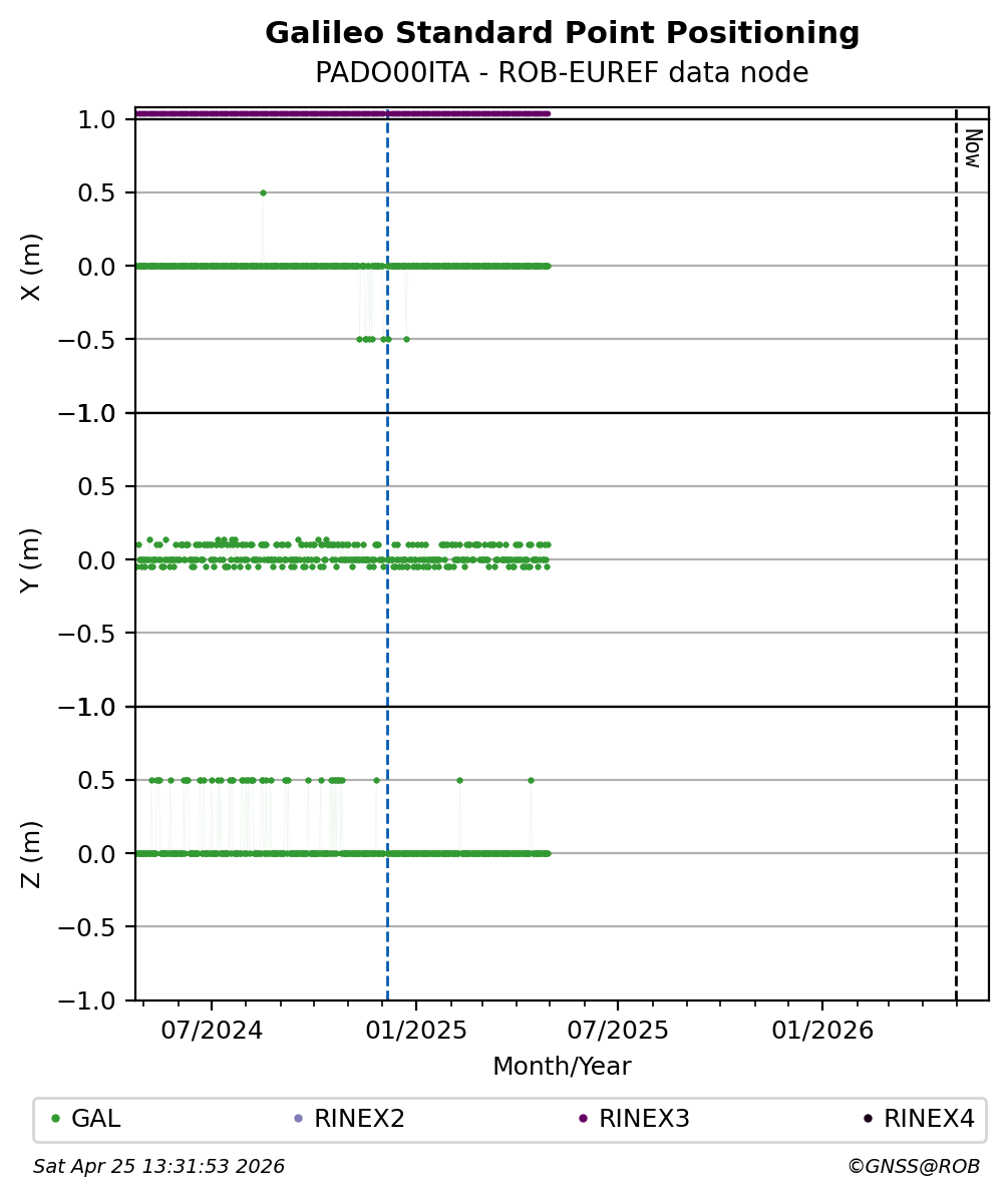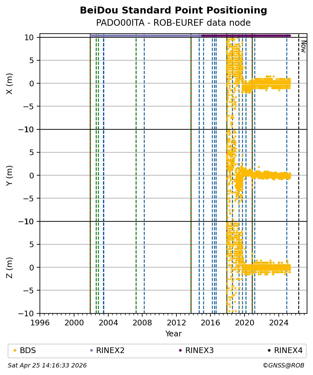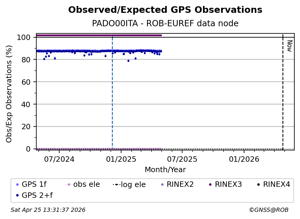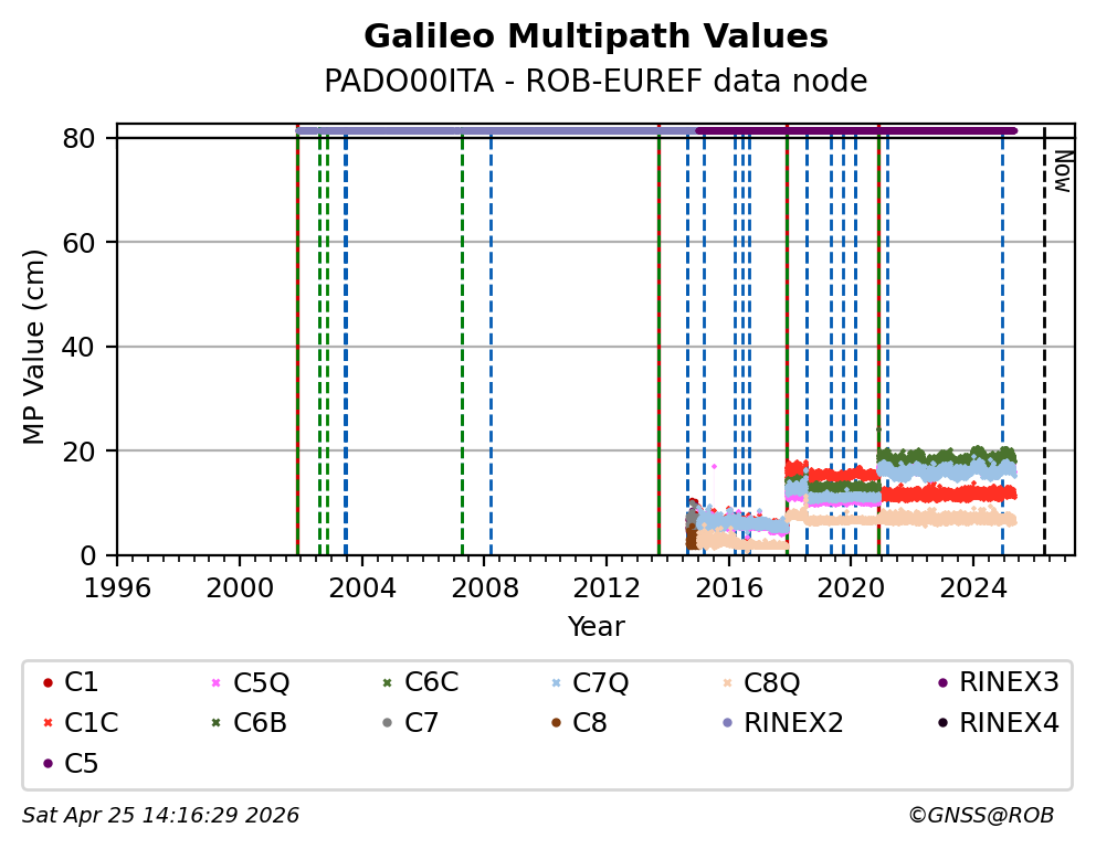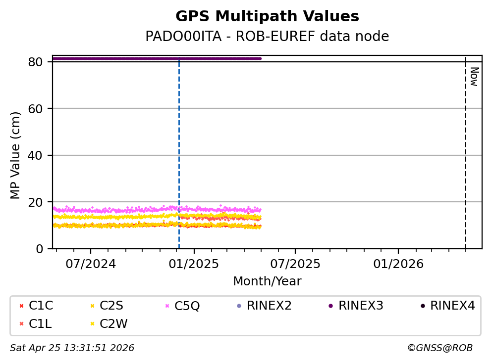 The plots below present the long-term tracking performance of the EPOS-GNSS station PADO00ITA based on the daily RINEX data available from the ROB-EUREF EPOS-GNSS data node. The data quality metrics have been computed at the data node using the G-Nut/Anubis software.