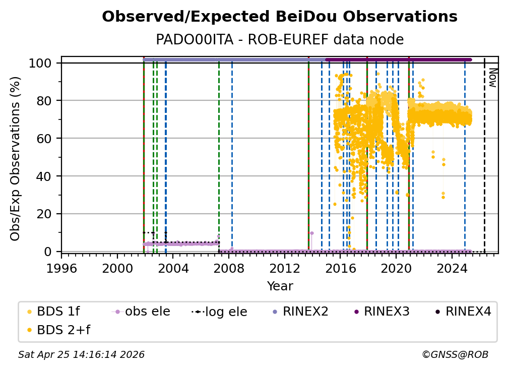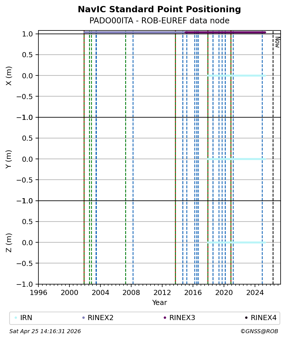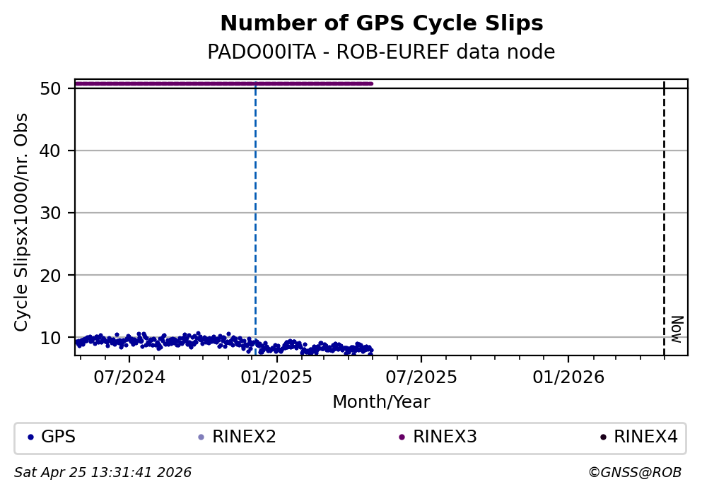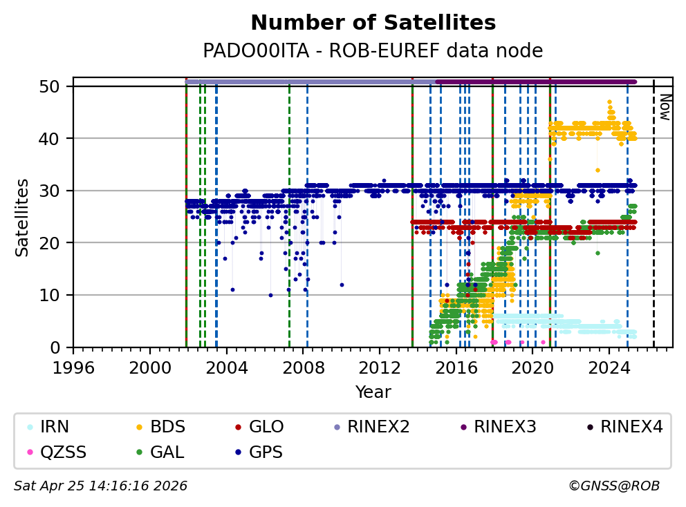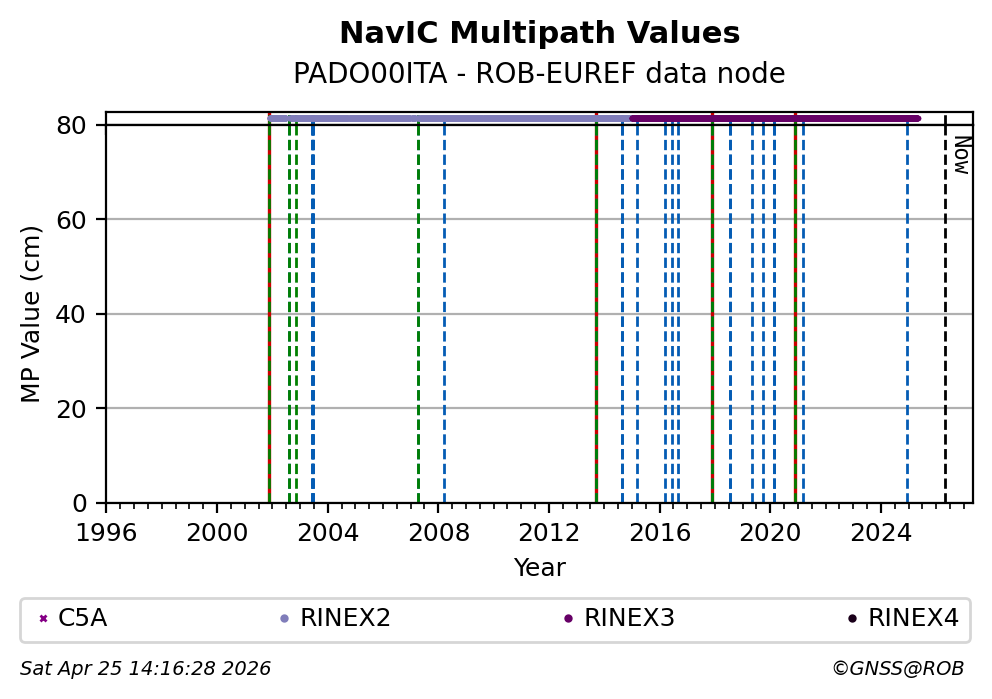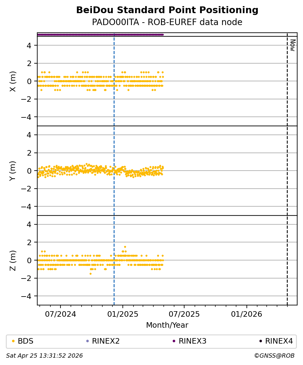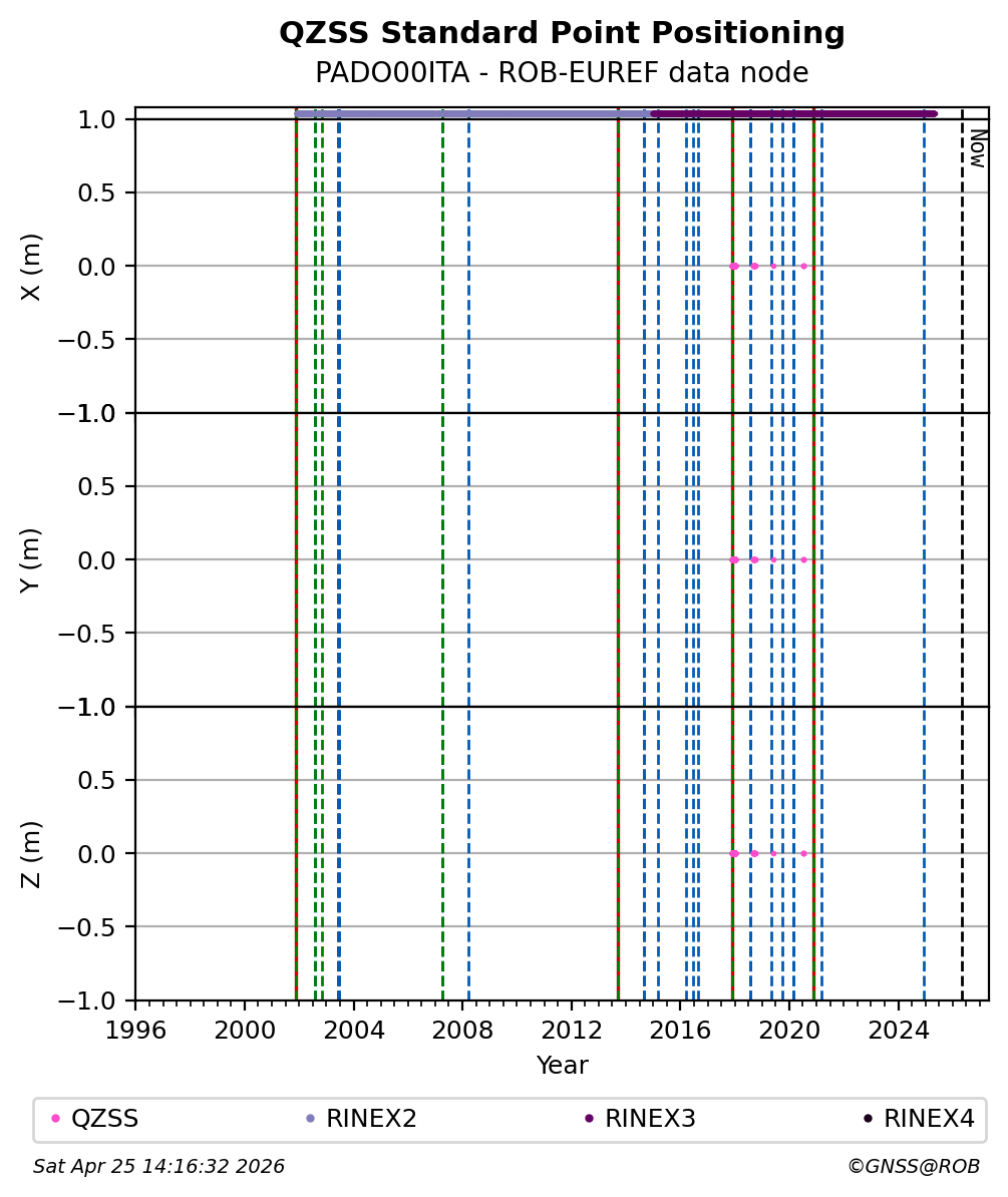 The plots below present the long-term tracking performance of the EPOS-GNSS station PADO00ITA based on the daily RINEX data available from the ROB-EUREF EPOS-GNSS data node. The data quality metrics have been computed at the data node using the G-Nut/Anubis software.
