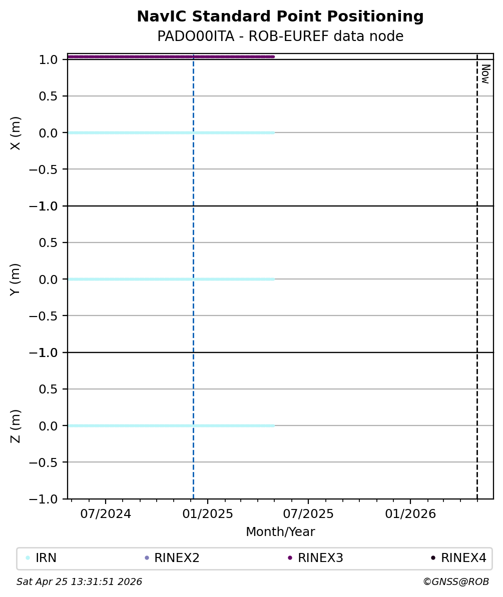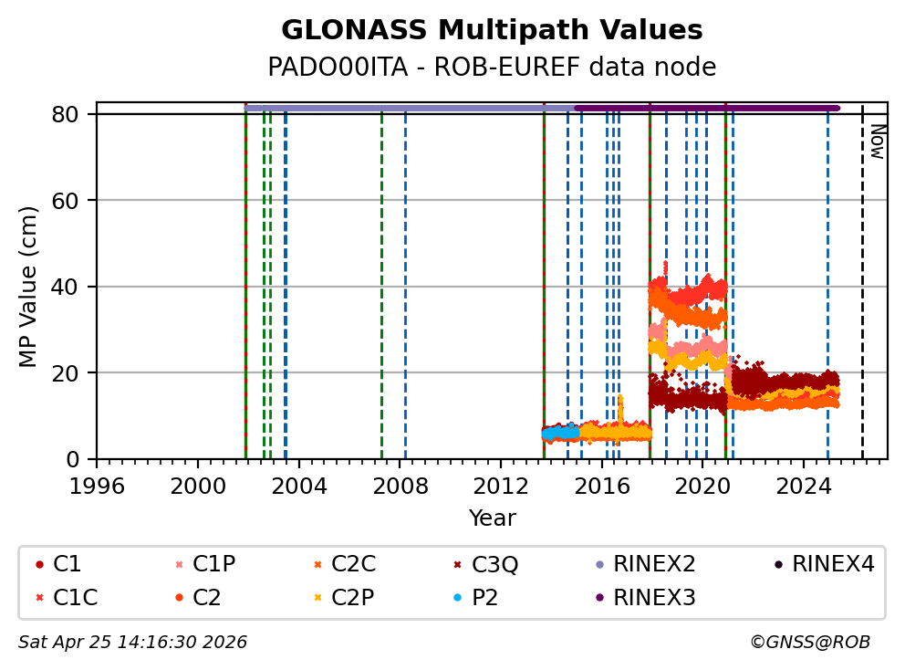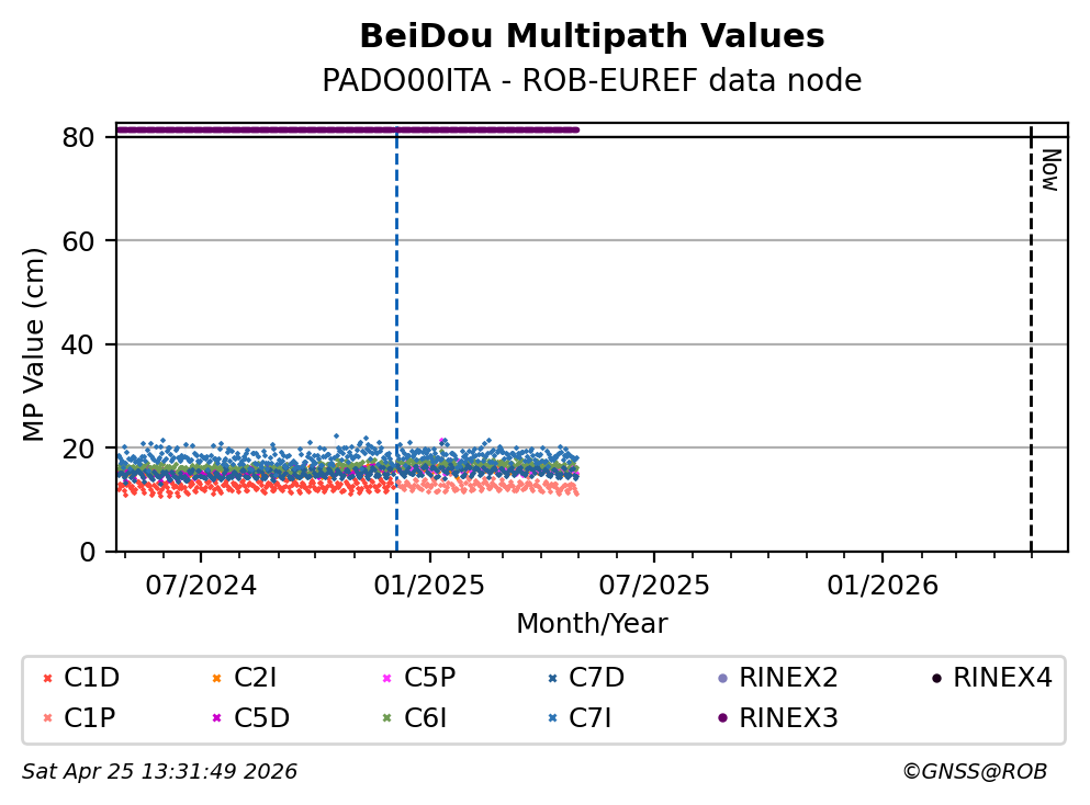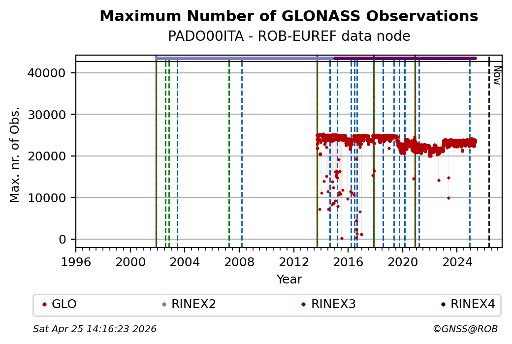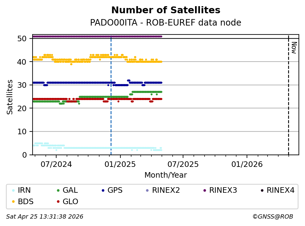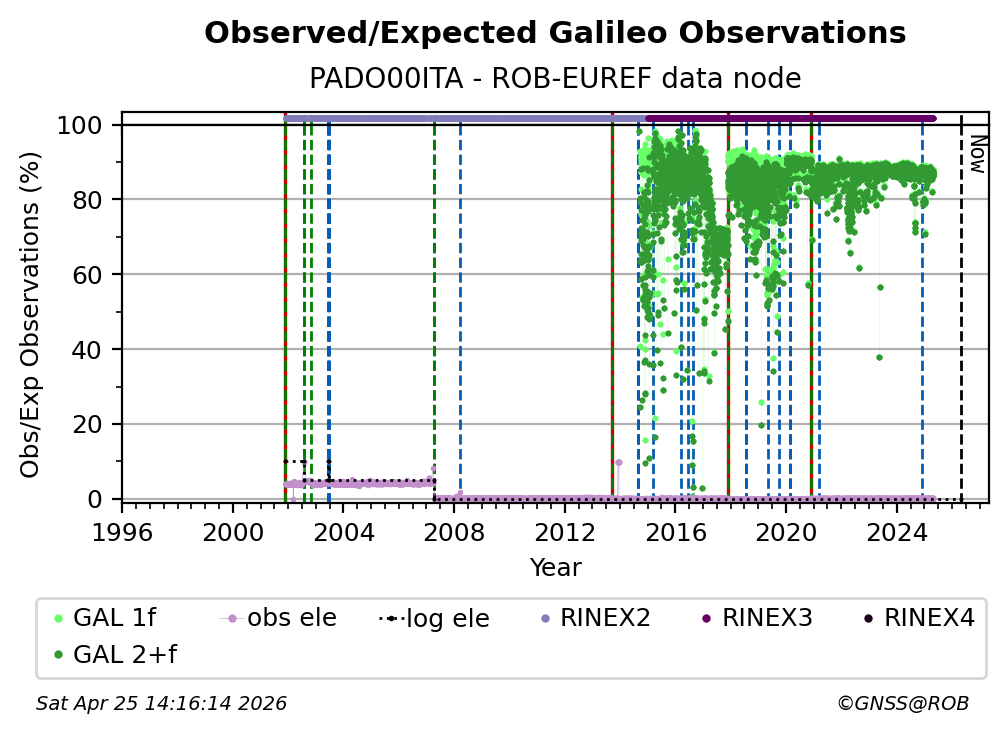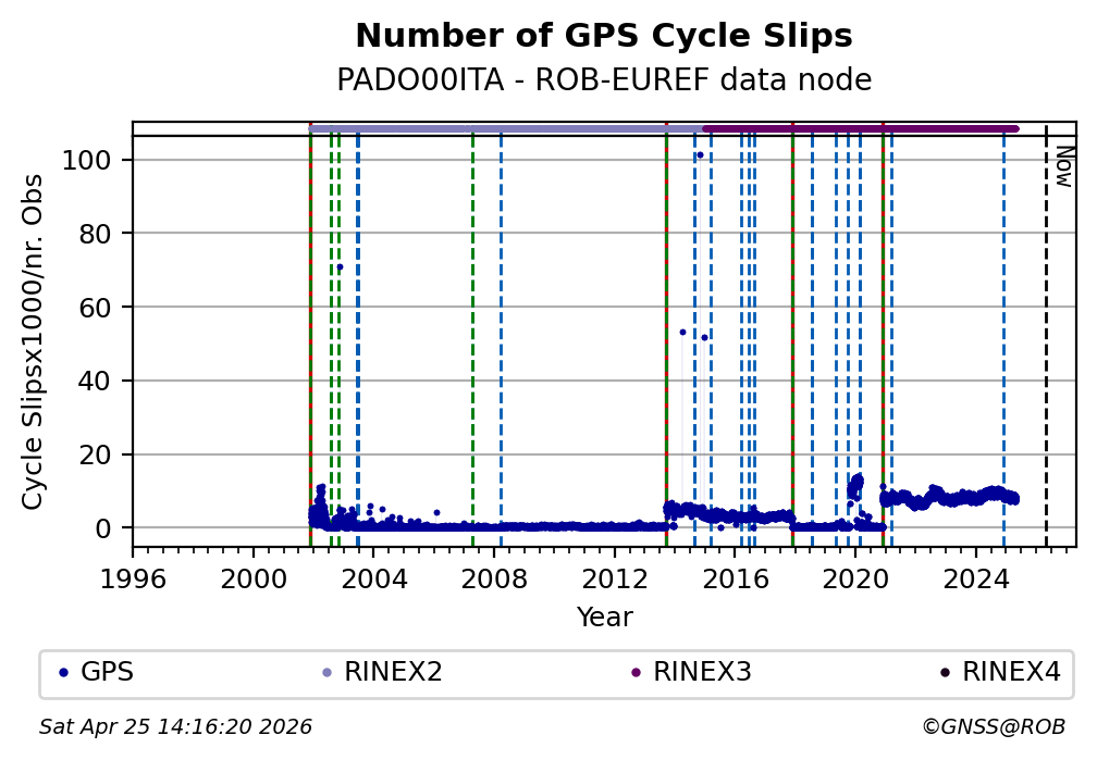 The plots below present the long-term tracking performance of the EPOS-GNSS station PADO00ITA based on the daily RINEX data available from the ROB-EUREF EPOS-GNSS data node. The data quality metrics have been computed at the data node using the G-Nut/Anubis software.