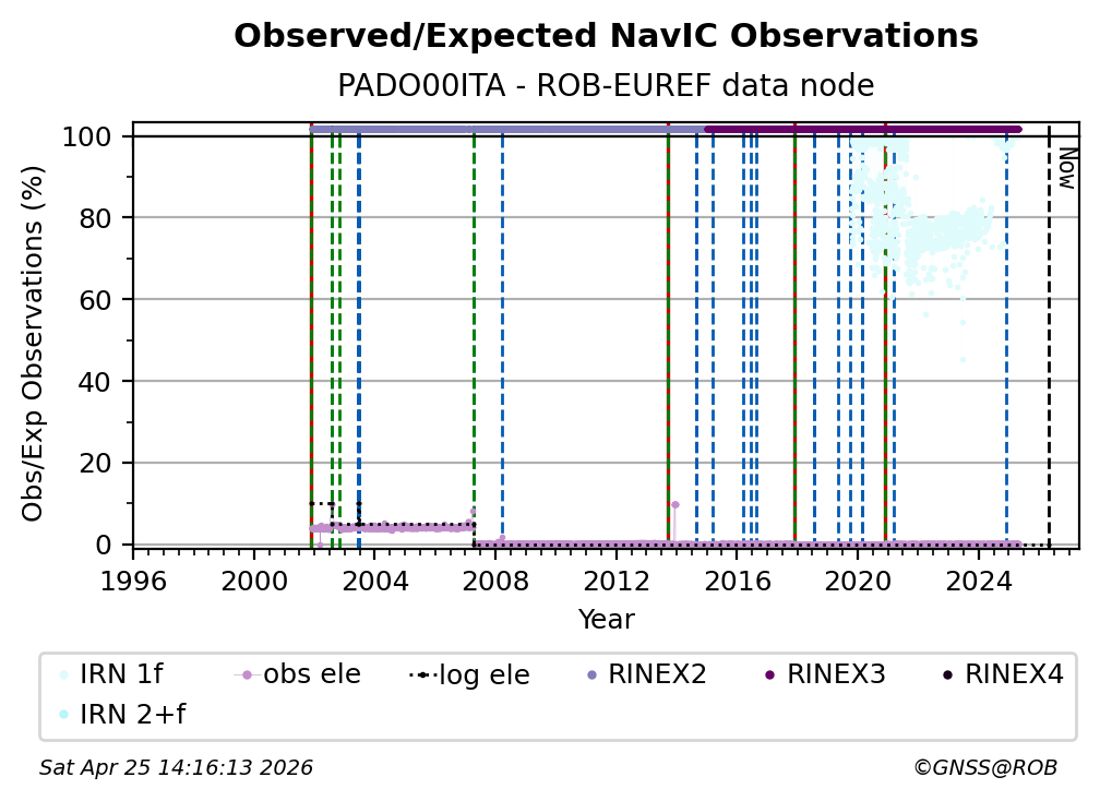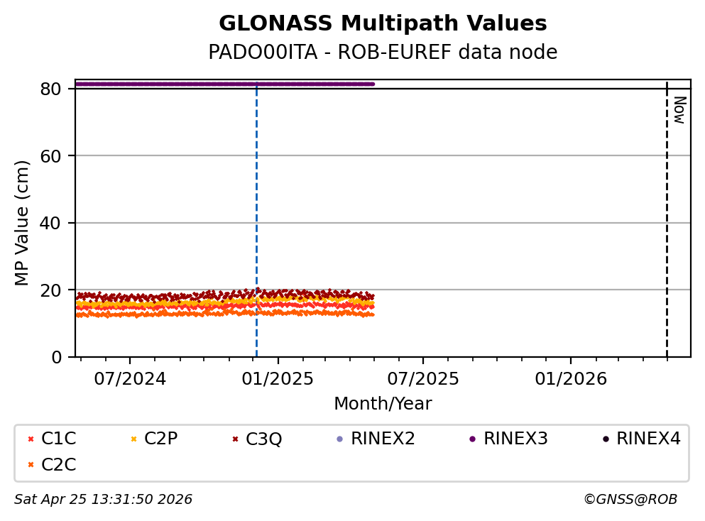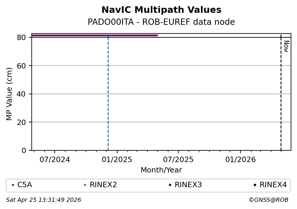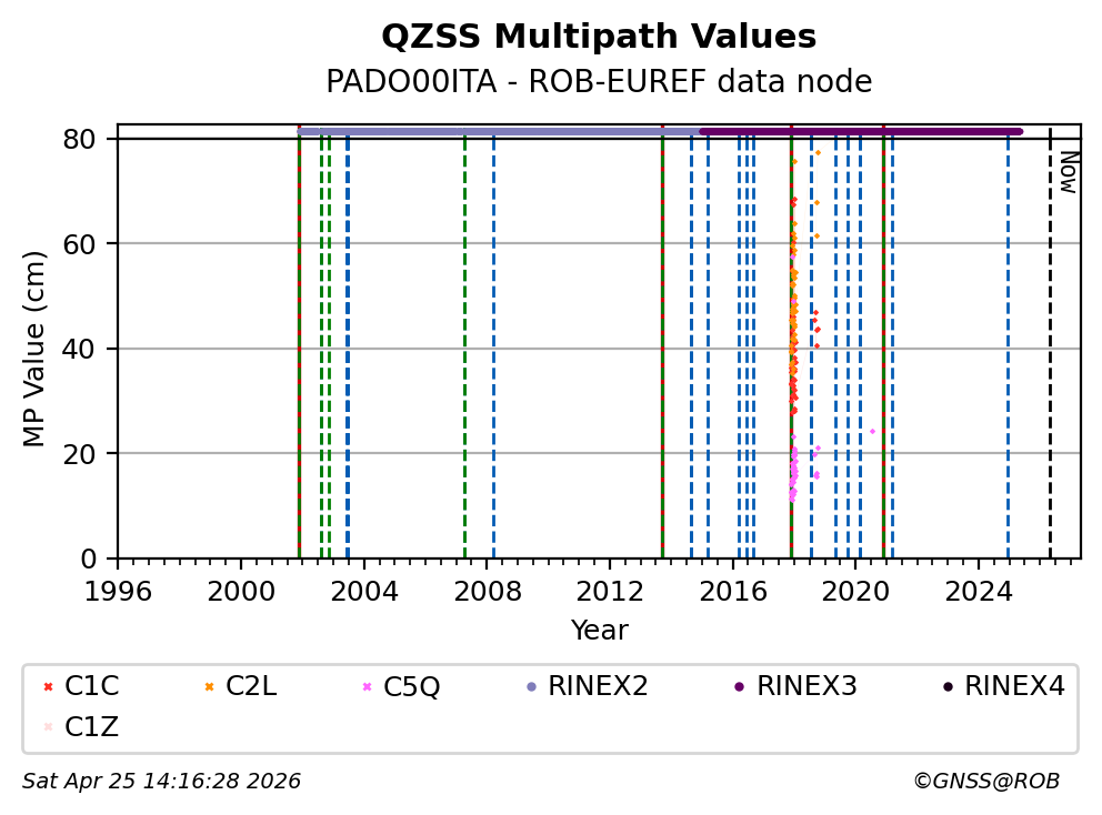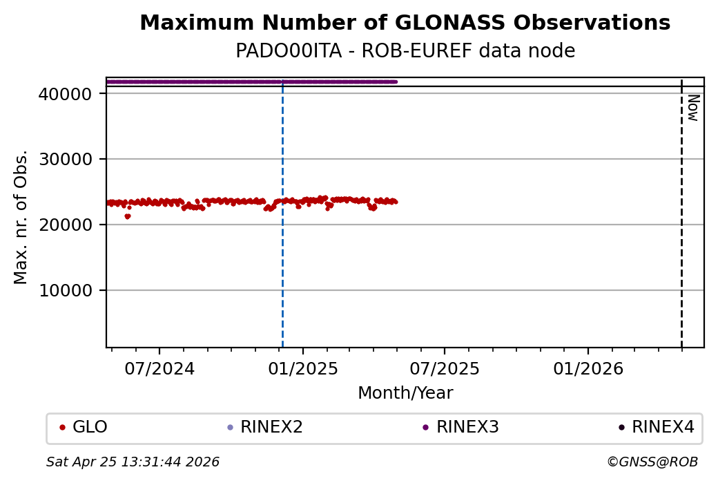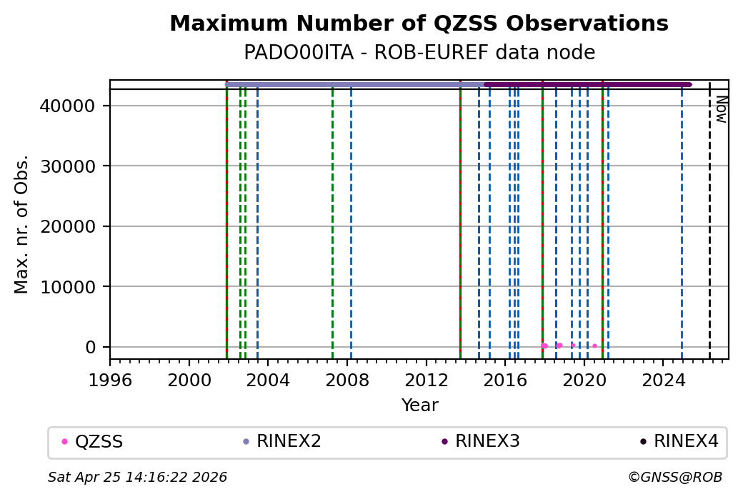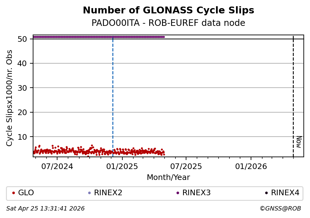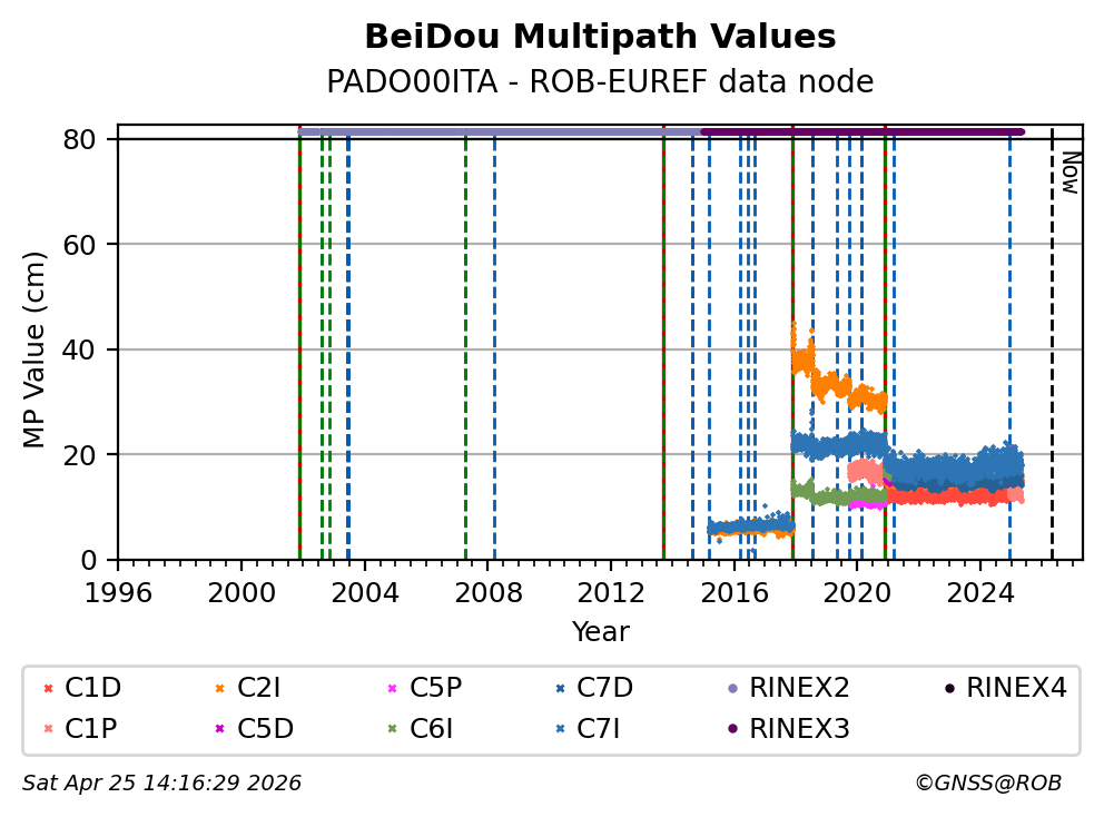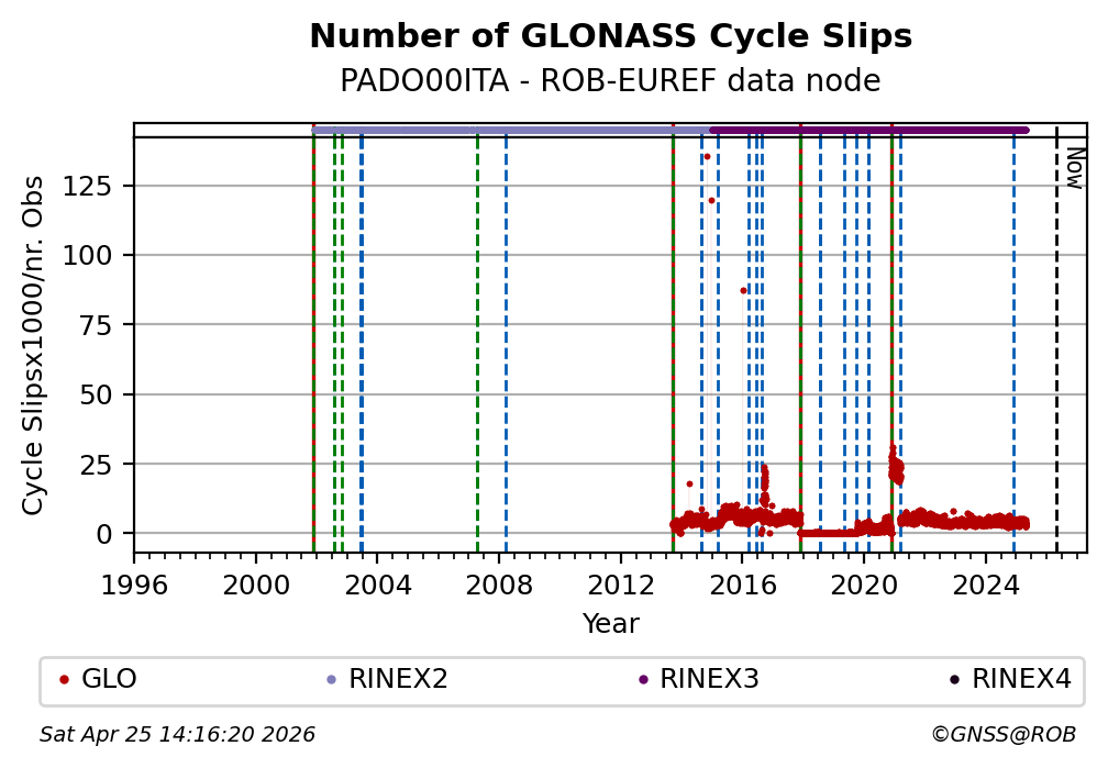 The plots below present the long-term tracking performance of the EPOS-GNSS station PADO00ITA based on the daily RINEX data available from the ROB-EUREF EPOS-GNSS data node. The data quality metrics have been computed at the data node using the G-Nut/Anubis software.