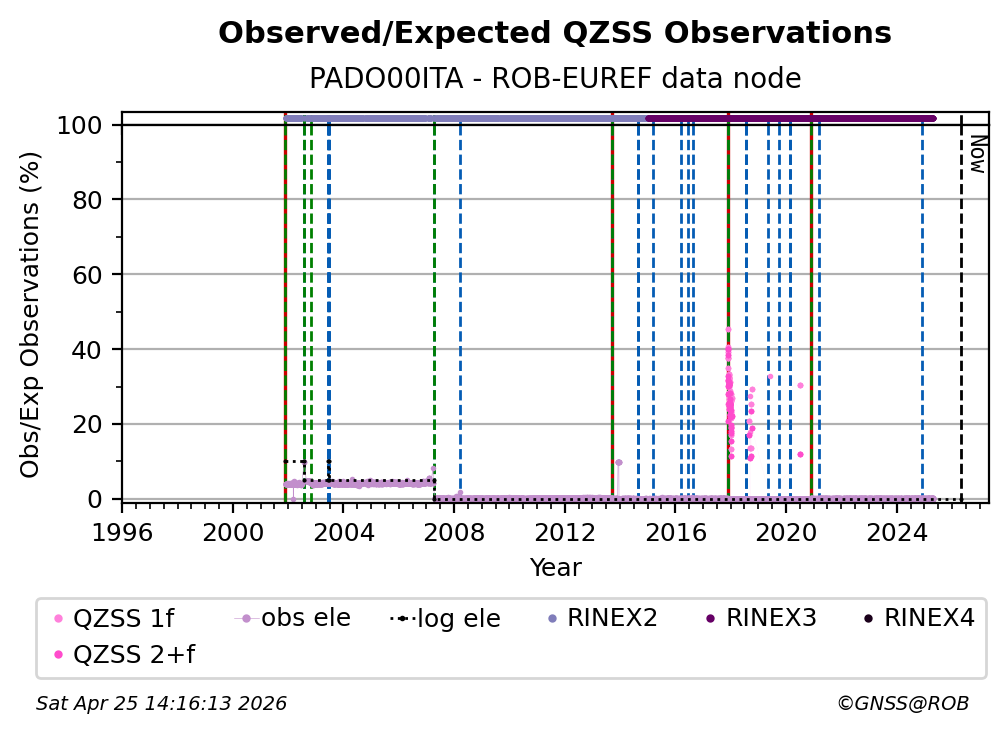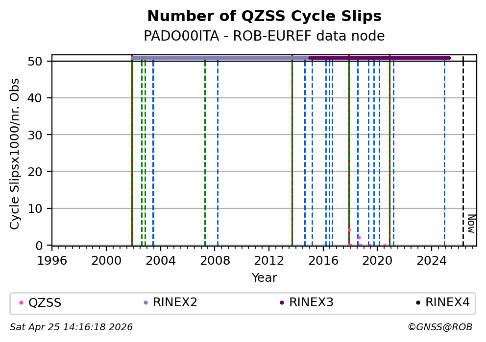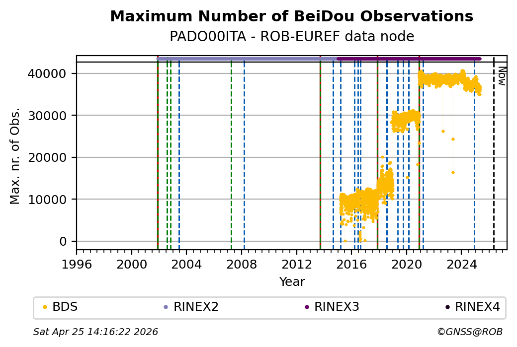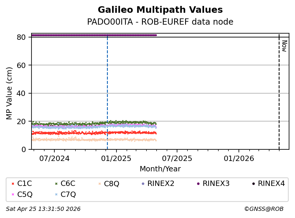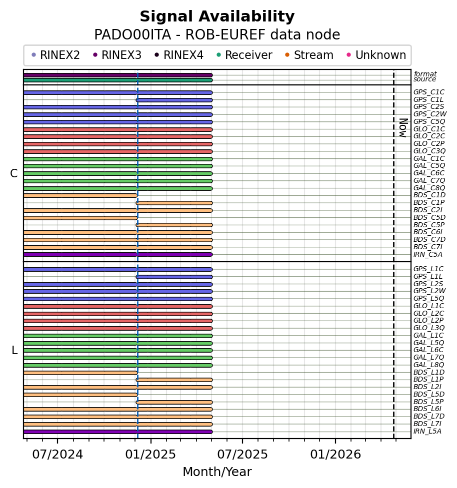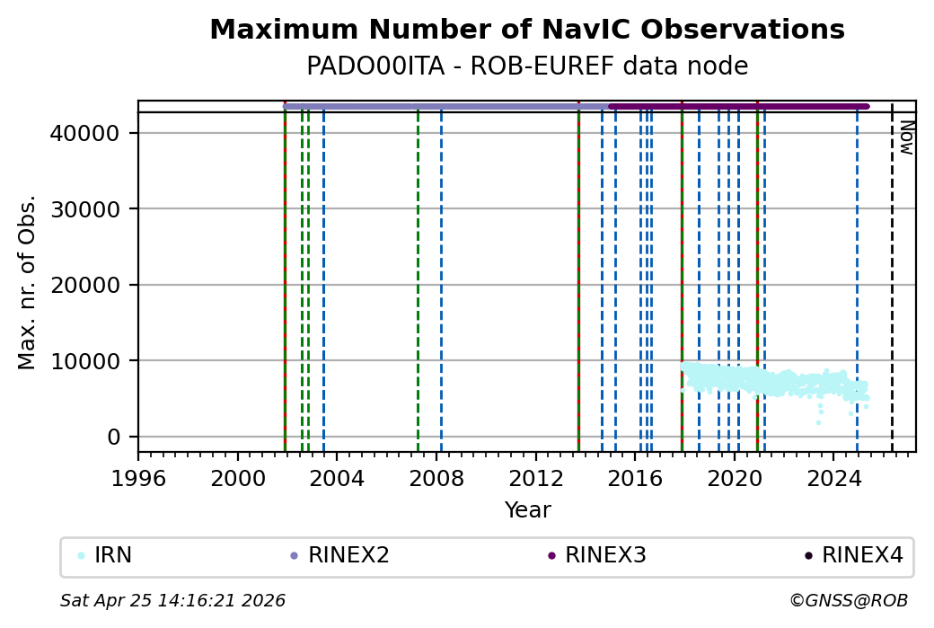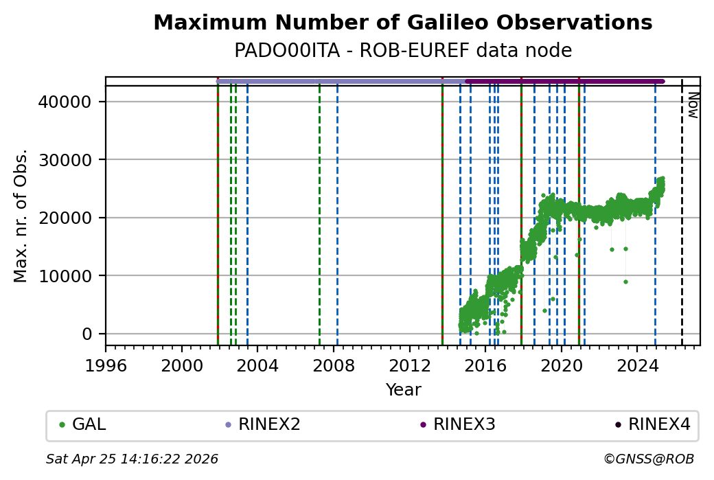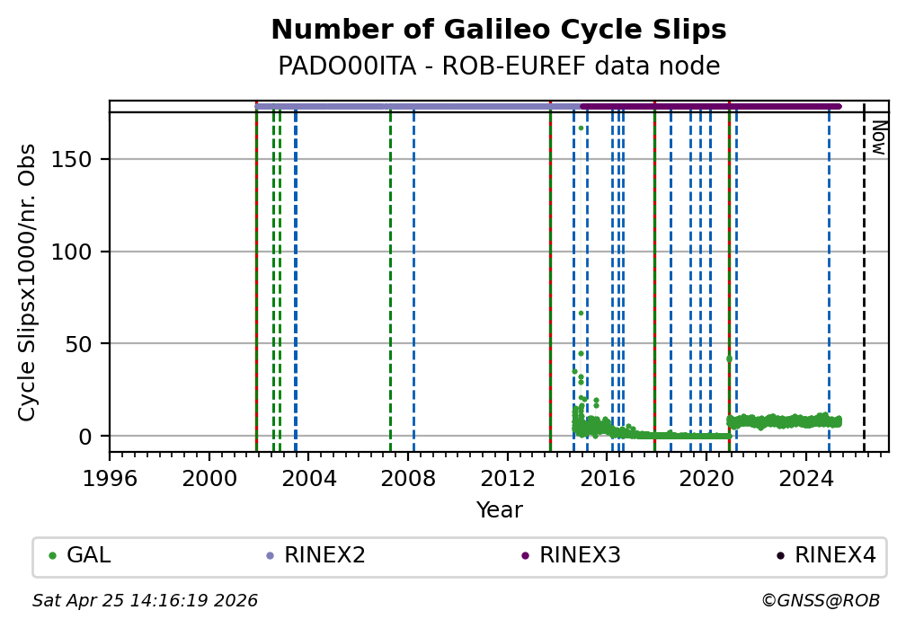 The plots below present the long-term tracking performance of the EPOS-GNSS station PADO00ITA based on the daily RINEX data available from the ROB-EUREF EPOS-GNSS data node. The data quality metrics have been computed at the data node using the G-Nut/Anubis software.