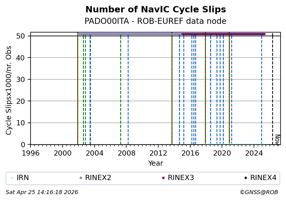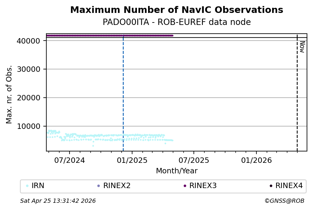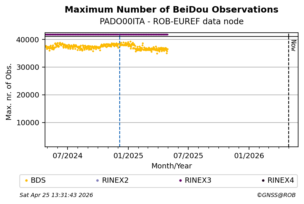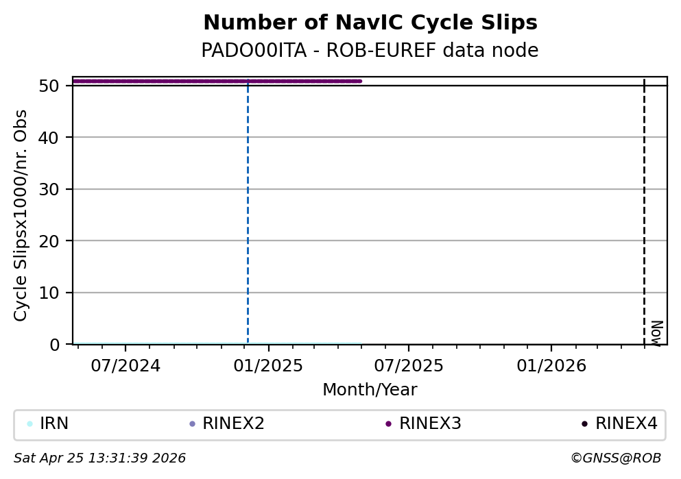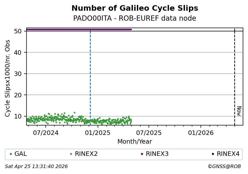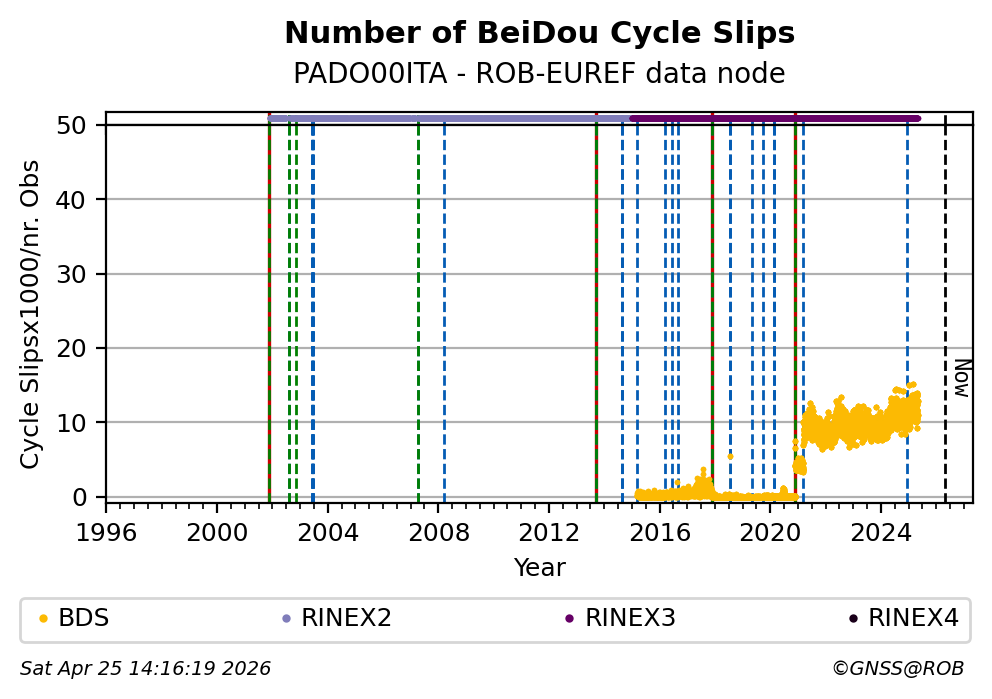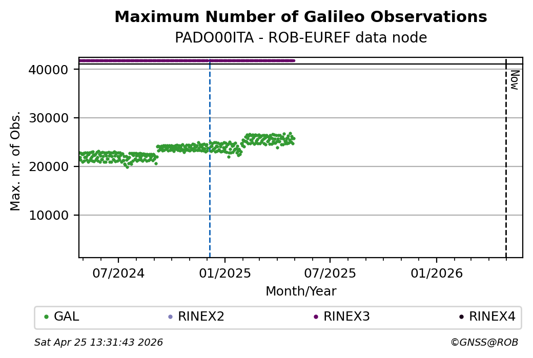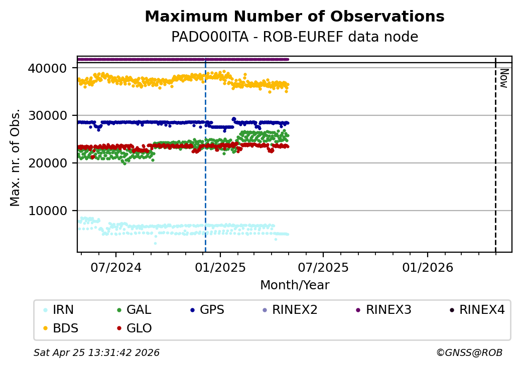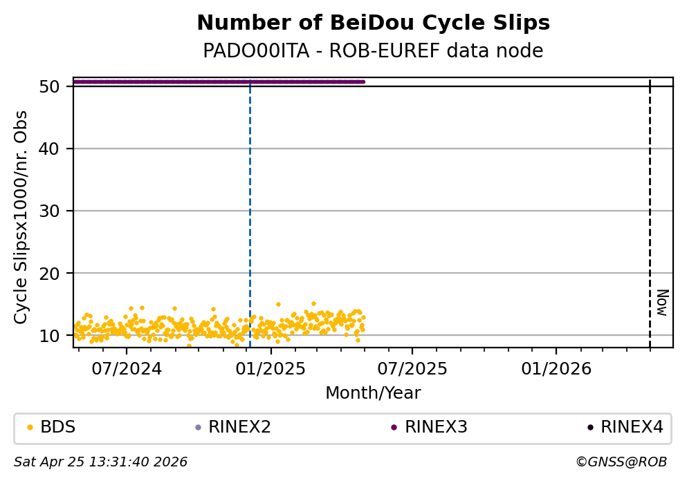 The plots below present the long-term tracking performance of the EPOS-GNSS station PADO00ITA based on the daily RINEX data available from the ROB-EUREF EPOS-GNSS data node. The data quality metrics have been computed at the data node using the G-Nut/Anubis software.