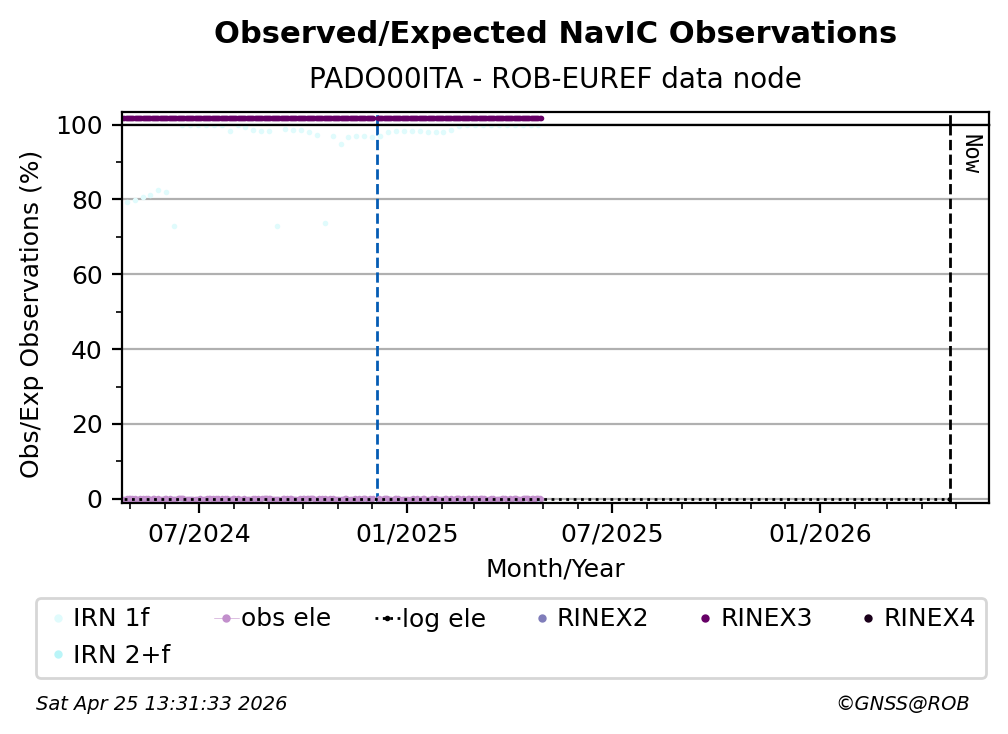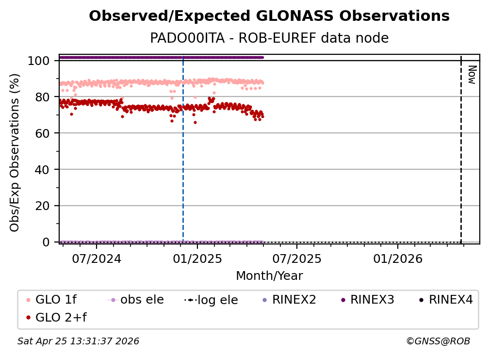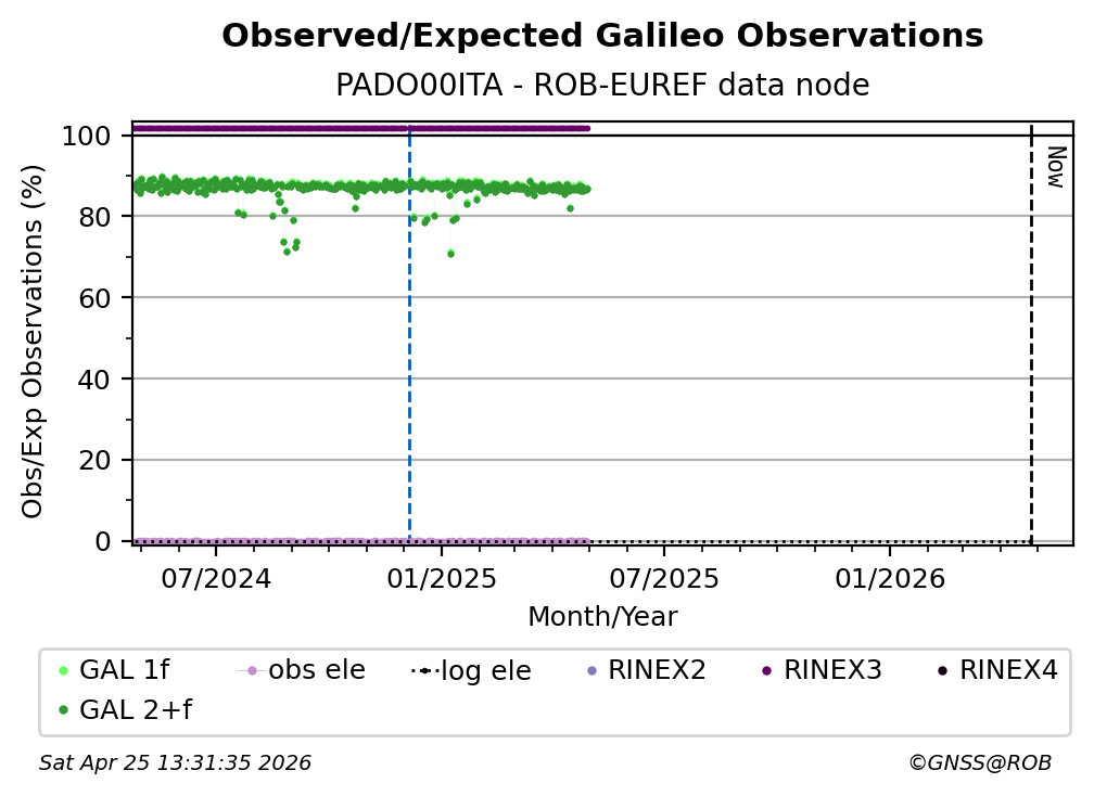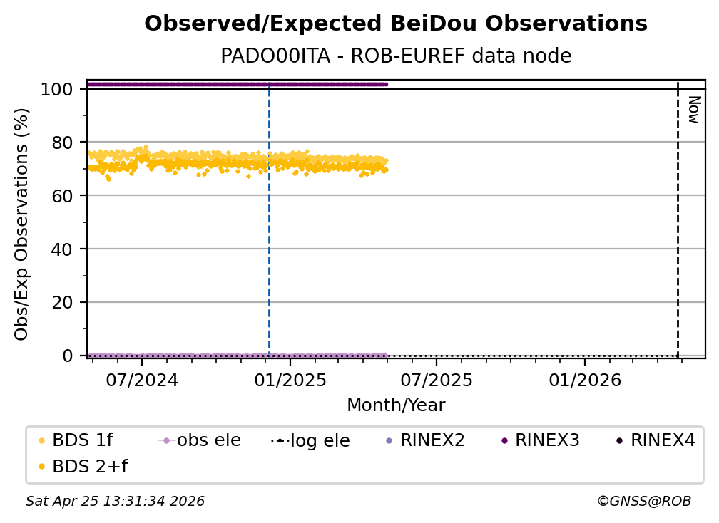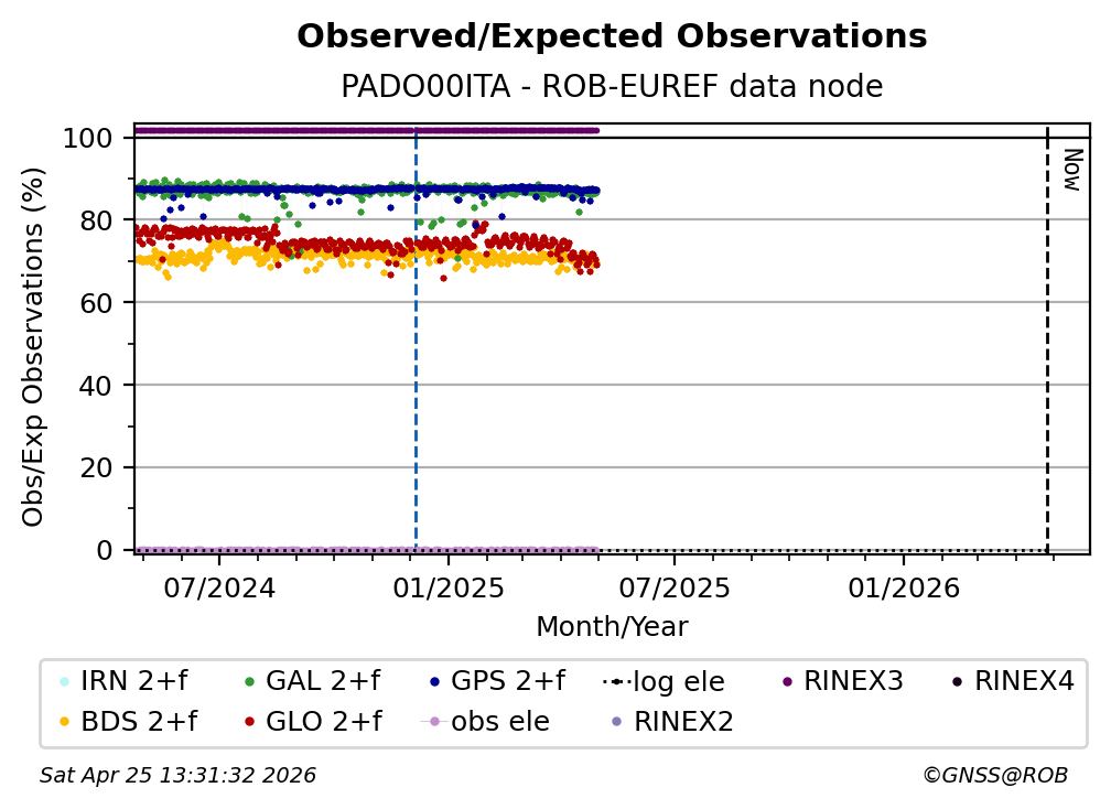 The percentage corresponds, for each constellation tracked by the station, to the ratio of the number of observations in the daily RINEX file with respect to the number of expected observations: