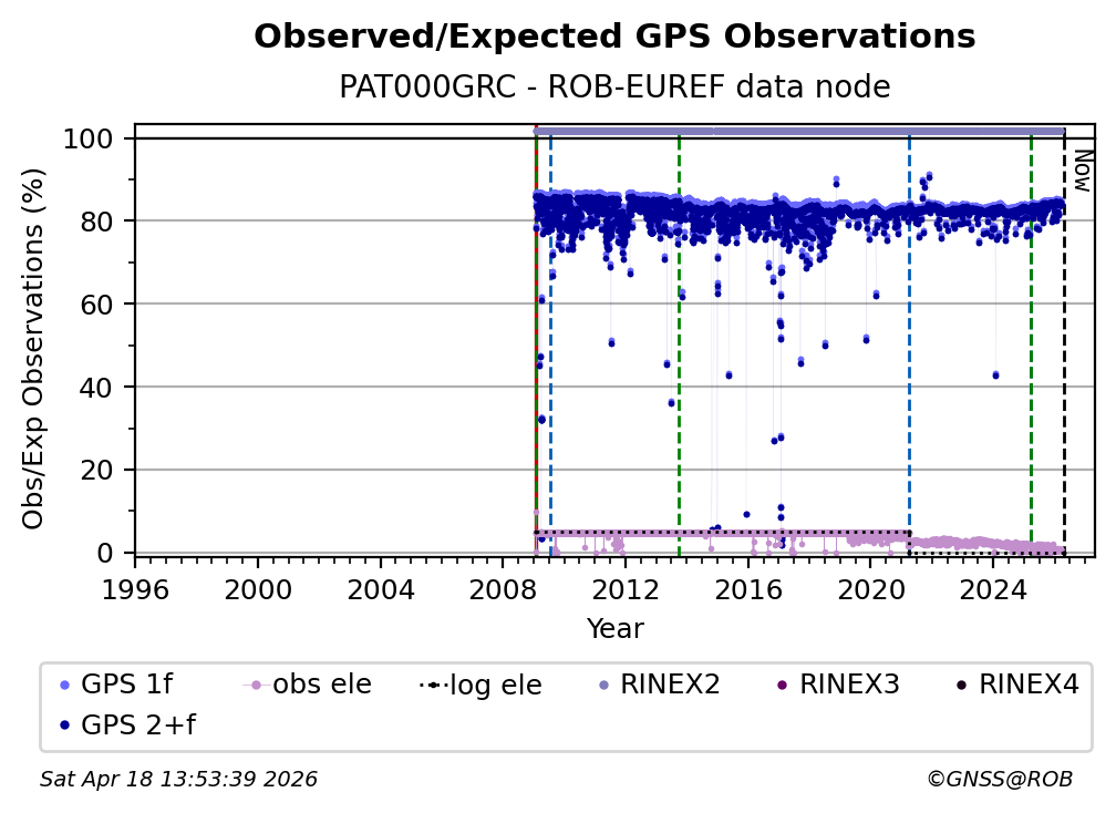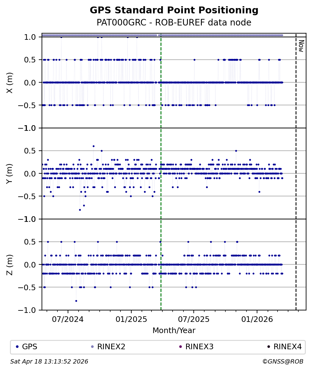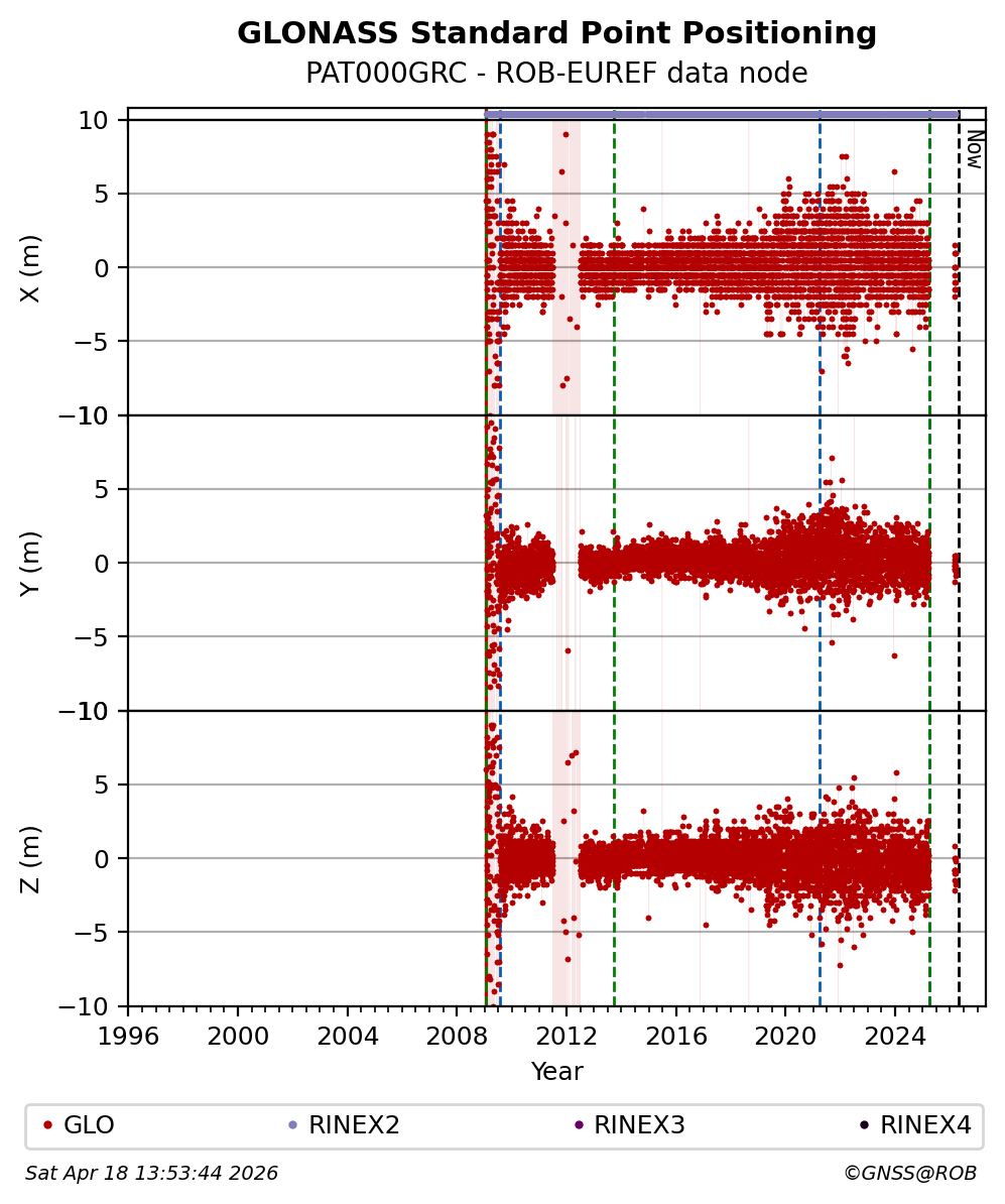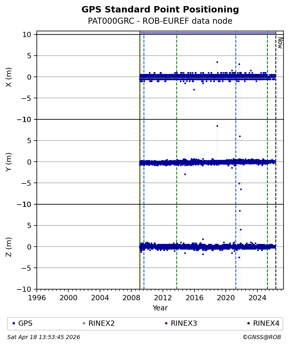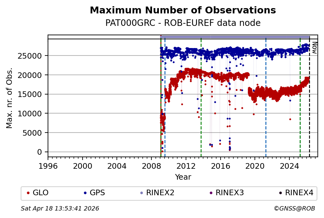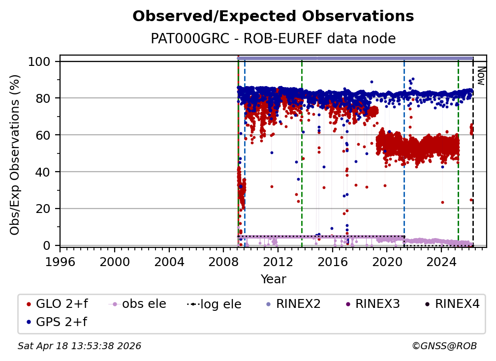 The plots below present the long-term tracking performance of the EPOS-GNSS station PAT000GRC based on the daily RINEX data available from the ROB-EUREF EPOS-GNSS data node. The data quality metrics have been computed at the data node using the G-Nut/Anubis software.